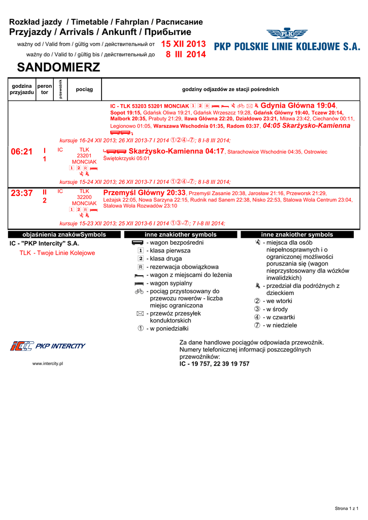 IC - TLK 53203 53201 MONCIAK h j l c d : b p o Gdynia Główna 19:04 , Sopot 19:15, Gdańsk Oliwa 19:21, Gdańsk Wrzeszcz 19:28, Gdańsk Główny 19:40, Tczew 20:14, Malbork 20:35, Prabuty 21:29, Iława Główna 22:20, Działdowo 23:21, Mława 23:42, Ciechanów 00:11,