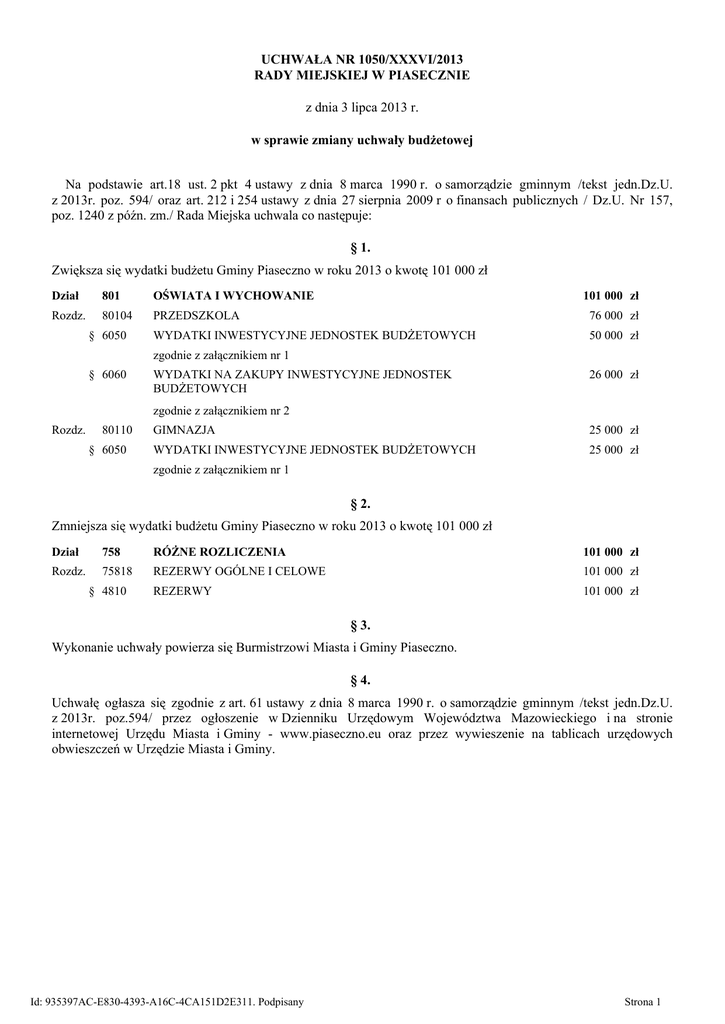 UCHWAŁA NR 1050/XXXVI/2013 RADY MIEJSKIEJ W PIASECZNIE z dnia 3 lipca 2013 r. w sprawie zmiany uchwały budżetowej Na podstawie art.18 ust. 2 pkt 4 ustawy z dnia 8 marca 1990 r. o samorządzie gminnym /tekst jedn.Dz.U. z 2013r. poz. 594/ oraz art. 212 i 254 ustawy z dnia 27 sierpnia 2009 r o finansach publicznych / Dz.U. Nr 157, poz. 1240 z późn. zm./ Rada Miejska uchwala co następuje: § 1. Zwiększa się wydatki budżetu Gminy Piaseczno w roku 2013 o kwotę 101 000 zł Dział 801 OŚWIATA I WYCHOWANIE Rozdz. 80104 PRZEDSZKOLA 76 000 zł WYDATKI INWESTYCYJNE JEDNOSTEK BUDŻETOWYCH 50 000 zł § 6050 101 000 zł zgodnie z załącznikiem nr 1 § 6060 WYDATKI NA ZAKUPY INWESTYCYJNE JEDNOSTEK BUDŻETOWYCH 26 000 zł zgodnie z załącznikiem nr 2 Rozdz. 80110 § 6050 GIMNAZJA 25 000 zł WYDATKI INWESTYCYJNE JEDNOSTEK BUDŻETOWYCH 25 000 zł zgodnie z załącznikiem nr 1 § 2. Zmniejsza się wydatki budżetu Gminy Piaseczno w roku 2013 o kwotę 101 000 zł Dział 758 RÓŻNE ROZLICZENIA 101 000 zł Rozdz. 75818 REZERWY OGÓLNE I CELOWE 101 000 zł REZERWY 101 000 zł § 4810 § 3. Wykonanie uchwały powierza się Burmistrzowi Miasta i Gminy Piaseczno. § 4. Uchwałę ogłasza się zgodnie z art. 61 ustawy z dnia 8 marca 1990 r. o samorządzie gminnym /tekst jedn.Dz.U. z 2013r. poz.594/ przez ogłoszenie w Dzienniku Urzędowym Województwa Mazowieckiego i na stronie internetowej Urzędu Miasta i Gminy - www.piaseczno.eu oraz przez wywieszenie na tablicach urzędowych obwieszczeń w Urzędzie Miasta i Gminy. Id: 935397AC-E830-4393-A16C-4CA151D2E311. Podpisany Strona 1 § 5. Uchwała wchodzi w życie z dniem podjęcia i obowiązuje w roku budżetowym 2013. Przewodniczacy Rady Miejskiej w Piasecznie mgr inż. Piotr Obłoza Id: 935397AC-E830-4393-A16C-4CA151D2E311. Podpisany Strona 2 Uzasadnienie Burmistrz Miasta i Gminy Piaseczno przedkłada projekt uchwały w sprawie zmiany planu budżetu w 2013 roku. Na wniosek Zespołu Ekonomiczno-Administracyjnego Szkół w Piasecznie zwiększa się wydatki o kwotę 101 000 zł. Środki przeznacza się na adaptację sali ruchowej i szatni na dwie sale dydaktyczne w Przedszkolu nr 11 - 27 000 zł, adaptacja parteru do powiększenia sali dydaktycznej w Przedszkolu Nr 2 - 23 000 zł, przystosowanie łazienki na parterze dla osób niepełnosprawnych w Zespole Szkół Publicznych w Jazgarzewie 25 000 zł. Jednocześnie zwiększa się wydatki na zakup zmywarki dla Przedszkola Nr 11 o kwotę 6 000 zł. W przedszkolu od września 2013 r. zostaną otworzone dodatkowe 2 grupy dla 50 dzieci. Dotychczas używana zmywarka jest wyeksploatawana i wymaga częstych kosztowych napraw. Zwiększa się również wydatki o kwotę 20 000 zł na zakup schodołazu dla Zespołu Szkół Publicznych w Jazgarzewie, aby przystosować szkołę na przyjęcie do Gimnazjum od września ucznia poruszającego się na wózku inwalidzkim. Środki zostaną pokryte z z rezerwy ogólnej. Id: 935397AC-E830-4393-A16C-4CA151D2E311. Podpisany Strona 3 WYKAZ ZMIAN W SPISIE ZADAŃ INWESTYCYJNYCH W ROKU 2013 Załącznik Nr 1 do Uchwały R M Nr 1050/XXXVI/2013 z dnia 3.07.2013r L Dział p. 1. Nazwa programu, jego cel i zadania 2. 3. Główne etapy realizacji Okres realizacji 4. 5. Koszty realizacji 6. Plan Wg uchwał R.M. w 2013 r. 7. Zmiana planu 2013 zmniejszenie środków budżetowych 8. Zmiana planu 2013 zwiększenie środków budżetowych 9. Plan po zmianach w 2013 roku 10. 801 Przedszkole Nr 11 80104 Piaseczno ul. 6050 Nefrytowa 14 Adaptacja sali ruchowej i szatni na dwie sale dydaktyczne 2013 27 000 0 0 27 000 27 000 801 Przedszkole Nr 2 80104 ul. Longinusa 25 6050 Piaseczno Adaptacja parteru do powiększenia sali dydaktycznej 2013 23 000 0 0 23 000 23 000 801 Zespół Szkół 80110 Publicznych w 6050 Jazgarzewie ul. Szkolna 10 Przystosowanie łazienki na parterze dla osób niepełnosprawnych 2013 25 000 0 0 25 000 25 000 11. Na wniosek Dyrektora Przedszkola Nr 11 Piaseczno ul. Nefrytowa 14, Dyrektora Przedszkola Nr 2 ul. Longinusa 25 oraz Dyrektora Zespołu Szkół Publicznych w Jazgarzewie, Dyrektor Zespołu Ekonomiczno-Administracyjnego Szkół w Piasecznie prosi o zwiększenie planu wydatków zadań inwestycyjnych na 2013 r. na kwotę 75 000 zł w celu adaptacji pomieszczeń na sale dydaktyczne w związku z utworzeniem dodatkowych oddziałów w Przedszkolu Nr 11 i powiększeniem sali dydaktycznej w Przedszkolu Nr 2, natomiast w Zespole Szkół Publicznych w Jazgarzewie należy przystosować łazienkę na parterze na przyjęcie od września 2013 r. do Gimnazjum dziecka niepełnosprawnego poruszającego się na wózku inwalidzkim. Id: 935397AC-E830-4393-A16C-4CA151D2E311. Podpisany Strona 1 WYKAZ ZMIAN W SPISIE ZAKUPÓW INWESTYCYJNYCH W ROKU 2013 Załącznik Nr 2 do Uchwały R M Nr 1050/XXXVI/2013 z dnia 3.07.2013r L Dział p. 1. 2. Nazwa programu, jego cel i zadania 3. Główne etapy realizacji Okres realizacji 4. 5. Koszty realizacji 6. Plan Wg uchwał R.M. w 2013 r. 7. Zmiana planu 2013 zmniejszenie środków budżetowych 8. Zmiana planu 2013 zwiększenie środków budżetowych 9. Plan po zmianach w 2013 roku 10. 801 Przedszkole Nr 11 80104 Piaseczno ul. 6060 Nefrytowa 14 Zakup zmywarki 2013 6 000 0 0 6 000 6 000 801 Zespół Szkół 80110 Publicznych w 6060 Jazgarzewie ul. Szkolna 10 Zakup schodołazu dla dzieci niepełnosprawnych 2013 20 000 0 0 20 000 20 000 11. Na wniosek Dyrektora Przedszkola Nr 11 Piaseczno ul. Nefrytowa 14 oraz Dyrektora Zespołu Szkół Publicznych w Jazgarzewie, Dyrektor Zespołu Ekonomiczno-Administracyjnego Szkół w Piasecznie prosi o zwiększenie planu wydatków zakupów inwestycyjnych na 2013 r. na kwotę 26 000 zł w celu zakupu zmywarki oraz schodołazu. W przedszkolu od września 2013 r. zostaną utworzone dodatkowe 2 grupy dla 50 dzieci dotychczas używana zmywarka jest wyekspoloatowana i wymaga częstych bardzo kosztownych napraw, natomiast w Zespole Szkół Publicznych w Jazgarzewie należy zakupić schodołaz, aby przystosować szkołę na przyjęcie od