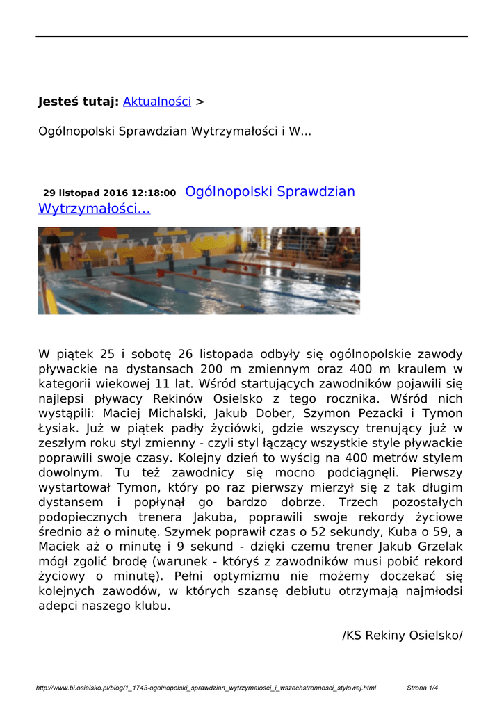 Jesteś tutaj: Aktualności > Ogólnopolski Sprawdzian Wytrzymałości i W... 29 listopad 2016 12:18:00 Ogólnopolski Sprawdzian Wytrzymałości... W piątek 25 i sobotę 26 listopada odbyły się ogólnopolskie zawody pływackie na dystansach 200 m zmiennym oraz 400 m kraulem w kategorii wiekowej 11 lat. Wśród startujących zawodników pojawili się najlepsi pływacy Rekinów Osielsko z tego rocznika. Wśród nich wystąpili: Maciej Michalski, Jakub Dober, Szymon Pezacki i Tymon Łysiak. Już w piątek padły życiówki, gdzie wszyscy trenujący już w zeszłym roku styl zmienny - czyli styl łączący wszystkie style pływackie poprawili swoje czasy. Kolejny dzień to wyścig na 400 metrów stylem dowolnym. Tu też zawodnicy się mocno podciągnęli. Pierwszy wystartował Tymon, który po raz pierwszy mierzył się z tak długim dystansem i popłynął go bardzo dobrze. Trzech pozostałych podopiecznych trenera Jakuba, poprawili swoje rekordy życiowe średnio aż o minutę. Szymek poprawił czas o 52 sekundy, Kuba o 59, a Maciek aż o minutę i 9 sekund - dzięki czemu trener Jakub Grzelak mógł zgolić brodę (warunek - któryś z zawodników musi pobić rekord życiowy o minutę). Pełni optymizmu nie możemy doczekać się kolejnych zawodów, w których szansę debiutu otrzymają najmłodsi adepci naszego klubu. /KS Rekiny Osielsko/ http://www.bi.osielsko.pl/blog/1_1743-ogolnopolski_sprawdzian_wytrzymalosci_i_wszechstronnosci_stylowej.html Strona 1/4 http://www.bi.osielsko.pl/blog/1_1743-ogolnopolski_sprawdzian_wytrzymalosci_i_wszechstronnosci_stylowej.html Strona 2/4 http://www.bi.osielsko.pl/blog/1_1743-ogolnopolski_sprawdzian_wytrzymalosci_i_wszechstronnosci_stylowej.html Strona 3/4 drukuj Wróć http://www.bi.osielsko.pl/blog/1_1743-ogolnopolski_sprawdzian_wytrzymalosci_i_wszechstronnosci_stylowej.html Powered by TCPDF (www.tcpdf.org) Strona 4/4