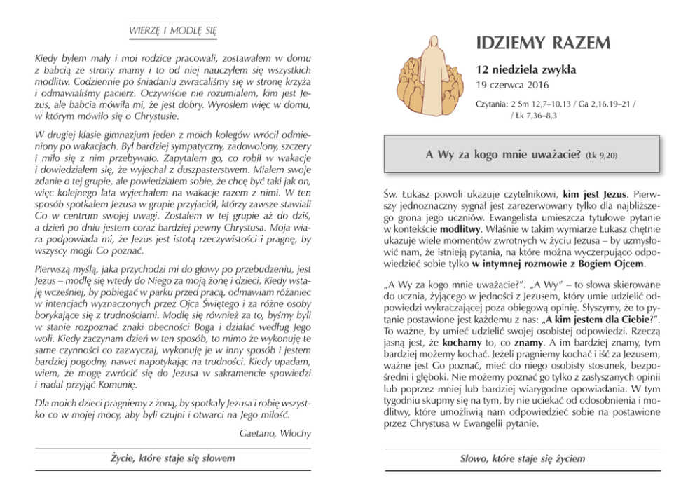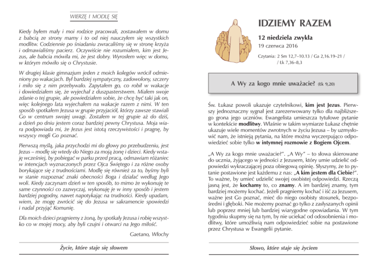 WIERZĘ I MODLĘ SIĘ Kiedy byłem mały i moi rodzice pracowali, zostawałem w domu z babcią ze strony mamy i to od niej nauczyłem się wszystkich modlitw. Codziennie po śniadaniu zwracaliśmy się w stronę krzyża i odmawialiśmy pacierz. Oczywiście nie rozumiałem, kim jest Jezus, ale babcia mówiła mi, że jest dobry. Wyrosłem więc w domu, w którym mówiło się o Chrystusie. W drugiej klasie gimnazjum jeden z moich kolegów wrócił odmieniony po wakacjach. Był bardziej sympatyczny, zadowolony, szczery i miło się z nim przebywało. Zapytałem go, co robił w wakacje i dowiedziałem się, że wyjechał z duszpasterstwem. Miałem swoje zdanie o tej grupie, ale powiedziałem sobie, że chcę być taki jak on, więc kolejnego lata wyjechałem na wakacje razem z nimi. W ten sposób spotkałem Jezusa w grupie przyjaciół, którzy zawsze stawiali Go w centrum swojej uwagi. Zostałem w tej grupie aż do dziś, a dzień po dniu jestem coraz bardziej pewny Chrystusa. Moja wiara podpowiada mi, że Jezus jest istotą rzeczywistości i pragnę, by wszyscy mogli Go poznać. Pierwszą myślą, jaka przychodzi mi do głowy po przebudzeniu, jest Jezus – modlę się wtedy do Niego za moją żonę i dzieci. Kiedy wstaję wcześniej, by pobiegać w parku przed pracą, odmawiam różaniec w intencjach wyznaczonych przez Ojca Świętego i za różne osoby borykające się z trudnościami. Modlę się również za to, byśmy byli w stanie rozpoznać znaki obecności Boga i działać według Jego woli. Kiedy zaczynam dzień w ten sposób, to mimo że wykonuję te same czynności co zazwyczaj, wykonuję je w inny sposób i jestem bardziej pogodny, nawet napotykając na trudności. Kiedy upadam, wiem, że mogę zwrócić się do Jezusa w sakramencie spowiedzi i nadal przyjąć Komunię. Dla moich dzieci pragniemy z żoną, by spotkały Jezusa i robię wszystko co w mojej mocy, aby byli czujni i otwarci na Jego miłość. Gaetano, Włochy Życie, które staje się słowem Idziemy razem 12 niedziela zwykła 19 czerwca 2016 Czytania: 2 Sm 12,7–10.13 / Ga 2,16.19–21 / / Łk 7,36–8,3 A Wy za kogo mnie uważacie? (Łk 9,20) Św. Łukasz powoli ukazuje czytelnikowi, kim jest Jezus. Pierwszy jednoznaczny sygnał jest zarezerwowany tylko dla najbliższego grona jego uczniów. Ewangelista umieszcza tytułowe pytanie w kontekście modlitwy. Właśnie w takim wymiarze Łukasz chętnie ukazuje wiele momentów zwrotnych w życiu Jezusa – by uzmysłowić nam, że istnieją pytania, na które można wyczerpująco odpowiedzieć sobie tylko w intymnej rozmowie z Bogiem Ojcem. „A Wy za kogo mnie uważacie?”. „A Wy” – to słowa skierowane do ucznia, żyjącego w jedności z Jezusem, który umie udzielić odpowiedzi wykraczającej poza obiegową opinię. Słyszymy, że to pytanie postawione jest każdemu z nas: „A kim jestem dla Ciebie?”. To ważne, by umieć udzielić swojej osobistej odpowiedzi. Rzeczą jasną jest, że kochamy to, co znamy. A im bardziej znamy, tym bardziej możemy kochać. Jeżeli pragniemy kochać i iść za Jezusem, ważne jest Go poznać, mieć do niego osobisty stosunek, bezpośredni i głęboki. Nie możemy poznać go tylko z zasłyszanych opinii lub poprzez mniej lub bardziej wiarygodne opowiadania. W tym tygodniu skupmy się na tym, by nie uciekać od odosobnienia i modlitwy, które umożliwią nam odpowiedzieć sobie na postawione przez Chrystusa w Ewangelii pytanie. Słowo, które staje się życiem