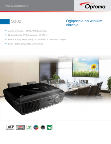 S300 Jasna projekcja – 2800 ANSI Lumenów Rozdzielczość SVGA, kontrast 15 000:1 Niskie koszty eksploatacji - aż do 6500 h żywotności lampy Lekki i przenośny, torba w zestawie Oglądanie na wielkim ekranie S300 Idealny do stosowania w sali konferencyjnej lub klasie, mały i stylowy S300 posiada jasność 2800L, która pozwala wyświetlać jasne, krystalicznie czyste obrazy przy normalnym świetle. S300 z wbudowanym głośnikiem oraz najnowszymi technologiami DLP® i BrilliantColor™ oferuje kontrast 15 000:1 co pozwala na wyświetlanie obrazów, prezentacji i video o wspaniałych kolorach. Niewiarygodna żywotność lampy aż do 6500 godzin w połączeniu z technologią Eco+ zapewnia funkcje oszczędzania energii i pieniędzy w celu długotrwałej, bezproblemowej projekcji. Zainstalowany, lub w podróży, wszechstronny S300 posiada wygodną torbę, aby zabrać go ze sobą. Ekologiczne rozwiązania Auto Power Off Technologia Eco+ od Optomy zwiększa nasze zaangażowanie na rzecz ograniczenia wpływu jaki wszyscy wywieramy na środowisko. Mogą zaistnieć przypadki, gdy projektor pozostawiono uruchomiony podczas gdy nie jest już używany. Aby oszczędzać energię, jeśli projektor jest nadal uruchomiony a nie zostanie wykryte źródło sygnału, funkcja 'Auto Power Off' automatycznie wyłącza projektor po upływie określonego czasu. Wyciszenie Eco AV Tryb Eco+ Oszczędzanie energii pozwala zaoszczędzić pieniądze! Technlogia Eco+ redukuje zużycie energii do nawet 30%. Ta inteligentna funkcja może również podwoić oczekiwaną żywotność lampy, obniżając całkowity koszt eksploatacji oraz zmniejsza konieczność konserwacji. Kontroluj swoją prezentację z funkcją Wyciszenie Eco AV. Przenieś uwagę widzów poza ekran zaciemniając obraz, gdy nie jest on potrzebny. To także natychmiast zmniejsza zużycie energii do 30%, dodatkowo przedłużając żywotność lampy. Pobór mocy 100% Tryb Jasny 80% Tryb Dynamiczny Tryb Eco+ Wyłączone wyciszenie Eco AV Włączone wyciszenie Eco AV 100% poboru mocy 30% poboru mocy 30% Przyjazny środowisku Dynamicznie dostosowuje jasność i pobór mocy Jasne sceny ~ 100% poboru mocy Ciemne sceny ~ 30% poboru mocy Aby móc osiągnąć 6500h[2] żywotności lampy projektor powinien pracować w trybie Eco+i mieć uruchomioną funkcję autowyłączania, która automatycznie wyłączy projektor jeśli przez przypadek pozostał on nadal włączony. Uruchomienie trybu czuwania <0,5W zapewni minimalny pobór energii, gdy projektor nie jest w użyciu. Wiemy, że ulepszanie naszych produktów jest najlepszym sposobem na zmniejszenie naszego wpływu na środowisko. Dlatego w Optoma projektujemy nasze produkty tak, aby posiadały długą żywotność, wykorzystując przy tym mniej materiałów, minimalizując opakowania transportowe i usuwaiąc wiele toksycznych substancji. Naturalnie wydajność energetyczna i maksymalizacja możliwości reckyklingu są wkomponowane już na etapie projektowania. Z każdym nowym produktem staramy się minimalizować nasz wpływ na środowisko. Szybkie wyłączenie Przyszłościowa technologia Wystarczy mniej niż 10s by włączyć i wyłączyć projektor, co oszczędza zarówno Twój czas jak i energię. Za sprawą naturalnej szybkości technologii DLP® projektory Optoma 3D Ready mogą wyświetlać video i obrazy z zaskakującym odświeżaniem 120Hz umożliwiając pełnoekranowe, pełnokolorowe, stereoskopowe pokazy 3D. Idealny dla biznesu i edukacji. Jasne, wyraźne, ostre obrazy Jasne 2800 ANSI Lumenów, idealne do projekcji w jasnym otoczeniu. Technologia DarkChip3™ od Texas Instruments w połączeniu z technologią Eco+ oferuje wspaniały kontrast 15 000:1 dla ostrych jak brzytwa grafik i krystalicznie czystego tekstu. Mocniejsze odcienie bieli, ultra-głęboka czerń obrazów poruszają a tekst jest łatwiejszy do przeczytania - idealny dla biznesowych i edukacyjnych prezentacji. Technologia 3D Za sprawą naturalnej szybkości technologii DLP® S300 może wyświetlać video i obrazy z zaskakującym odświeżaniem 120Hz umożliwiając pełnoekranowe, pełnokolorowe, stereoskopowe pokazy 3D. Idealny dla biznesu i edukacji. Szybkie ponowne uruchomienie Kontrast 2000:1 Kontrast 15 000:1 Jasność tam gdzie trzeba Możesz wyświetlać nawet jeśli w pokoju jest włączone światło. S300 o rozdzielczości SVGA dostarcza imponujące 2800L jasności, zapewniając, że nawet w ciągu dnia każdy może wyraźnie zobaczyć wyświetlany obraz. Oszczędzaj czas, nie czekając aż projektor ostygnie, zanim będzie go można włączyć ponownie. Jeśli projektor zostanie przypadkowo wyłączony, funkcja ta, jeśli wybrana, pozwala natychmiast ponownie włączyć projektor w ciągu 100 sekund. Chłodzenie Włącz Natychmiastowe włączenie (w ciągu 100s) Gwarancja kolorów Jesteśmy tak pewni, że jakość kolorów S300 pozostanie taka jak w dniu zakupu, że w Optoma gwarantujemy to przez 5 lat. Bezprzewodowe prezentacje (opcja) Prowadzenie prezentacji nie może być już łatwiejsze z użyciem opcjonalnych funkcji bezprzewodowych S300. Wykorzystując bezprzewodowy adapter VGA Optoma (sprzedawany oddzielnie) możesz podłączyć i wyświetlać prezentacje z laptopa, PC czy urządzeń mobilnych (wymagane dodatkowe zasilanie). Wspaniałe kolory S300 wykorzystuje technologię BrilliantColor™, by wyświetlać zachwycająco jasne obrazy, z idealnie zbalansowanymi, niemal jak żywymi kolorami. Sterowanie Szeroka lista komend RS232 sprawia, że S300 można w łatwy sposób kontrolować za pomocą dowolnego systemu sterowania. Kompatybilność z AMX – Dynamic Discovery Protocol jest wbudowany w S300. Ta cecha umożliwia łatwą instalację z systemami sterowania AMX. S300 Specification Technologia wyświetlania Natywna rozdzielczość Pojedynczy układ 0.55” SVGA DC3 DMD w technologii DLP® od Texas Instruments Natywna SVGA 800 x 600 Brightness1 (Bright Mode) Kontrast Poziomu szumu Waga (kg) Wejścia/Wyjścia Predefiniowa