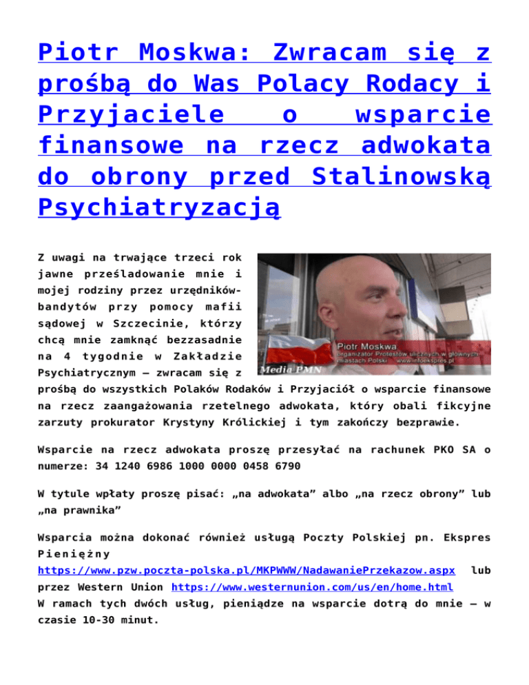 Piotr Moskwa: Zwracam się z prośbą do Was Polacy Rodacy i Przyjaciele o wsparcie finansowe na rzecz adwokata do obrony przed Stalinowską Psychiatryzacją Z uwagi na trwające trzeci rok jawne prześladowanie mnie i mojej rodziny przez urzędnikówbandytów przy pomocy mafii sądowej w Szczecinie, którzy chcą mnie zamknąć bezzasadnie na 4 tygodnie w Zakładzie Psychiatrycznym – zwracam się z prośbą do wszystkich Polaków Rodaków i Przyjaciół o wsparcie finansowe na rzecz zaangażowania rzetelnego adwokata, który obali fikcyjne zarzuty prokurator Krystyny Królickiej i tym zakończy bezprawie. Wsparcie na rzecz adwokata proszę przesyłać na rachunek PKO SA o numerze: 34 1240 6986 1000 0000 0458 6790 W tytule wpłaty proszę pisać: „na adwokata” albo „na rzecz obrony” lub „na prawnika” Wsparcia można dokonać również usługą Poczty Polskiej pn. Ekspres Pieniężny https://www.pzw.poczta-polska.pl/MKPWWW/NadawaniePrzekazow.aspx lub przez Western Union https://www.westernunion.com/us/en/home.html W ramach tych dwóch usług, pieniądze na wsparcie dotrą do mnie – w czasie 10-30 minut. Moje dane osobowe: Piotr Moskwa, 71-562 Szczecin Polska, ul. Marii Rodziewiczówny 1/7, Polska. KOD wpłaty proszę mi przekazać telefonicznie pod nr: +48 792 878 969, +48 792 646 848 (Play) W treści wsparcia proszę pisać: „na adwokata” albo „na rzecz obrony” lub „na prawnika” Wsparcia można też dokonać metodą tradycyjną przez Pocztę Polską – wysyłając pieniądze na moje dane osobowe. Portfel Bitcoin – przelewy dla Piotra Moskwy Bez pośredników, prowizji i banków – prosto do odbiorcy Każdy z Was może od 28 listopada 2016 roku wpłacić anonimowo lub oficjalnie dowolną kwotę na wsparcie: Piotra Moskwy i jego rodziny, niezależnych mediów, organizacji protestów, szeregu inwestycji etc. Po wejściu do Local Bitcoins przez baner potrzeba wykorzystać ten adres-konto: 12KMwWgFdjSxpgJUhk8JdGWce4D2nmecUT – Skopiuj teraz adreskonto i wklej do formularza na stronie localbitcoins.com Jeżeli nie masz konta w Local Bitcoins ? To, zakładasz je błyskawicznie (przyp. red. zależy jakie konto założysz ? Imienne prawdziwe lub z nazwą, czy taż inne). Możesz dzięki temu przesyłać pieniądze w wielu walutach. Również Ty możesz korzystać z konta, w ramach wszelkich działań gospodarczych i wszelkich innych, w zależności od tego do czego będziesz jego potrzebował ? Jeżeli masz dostęp do swojego konta Local Bitcoins, to następnie wpisz w formularzu dowolną kwotę i prześlij. Operacja skuteczna przelania pieniędzy na Portfel Bitcoin (konto) odbywa się w kilka sekund. Pieniądze przesłane – dostępne będą dla właściciela konta od ręki po operacji przesłania. Pieniędzy nikt nie jest w stanie: przetrzymywać, zablokować i przejąć. localbitcoins.com Bardzo proszę o przekazywanie mi informacji o wpłatach. Wcześniej rabowano pomoc dla mnie z uwagi, na to, że nie miałem pojęcia o przesłanym wsparciu, często też pieniądze wracały do nadawcy. Wszystkim ofiarodawcom za ofiarowaną pomoc serdecznie dziękuję. Piotr Moskwa Źródło: Piotr Moskwa News https://web.facebook.com/PiotrMoskwaNews Źródło: Stop Stalinowskiej Psychiatryzacji – Dziennikarza Piotra Moskwy https://web.facebook.com/events/1890416211187502/