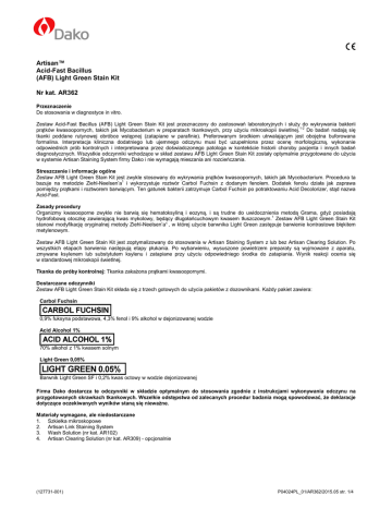 Artisan™ Acid-Fast Bacillus (AFB) Light Green Stain Kit Nr kat. AR362 Przeznaczenie Do stosowania w diagnostyce in vitro. Zestaw Acid-Fast Bacillus (AFB) Light Green Stain Kit jest przeznaczony do zastosowań laboratoryjnych i słuŜy do wykrywania bakterii prątków kwasoopornych, takich jak Mycobacterium w preparatach tkankowych, przy uŜyciu mikroskopii świetlnej.1-2 Do badań nadają się tkanki poddane rutynowej obróbce wstępnej (zatapiane w parafinie). Preferowanym środkiem utrwalającym jest obojętna buforowana formalina. Interpretacja kliniczna dodatniego lub ujemnego odczynu musi być uzupełniona przez ocenę morfologiczną, wykonanie odpowiednich prób kontrolnych i interpretowana przez doświadczonego patologa w kontekście historii choroby pacjenta i innych badań diagnostycznych. Wszystkie odczynniki wchodzące w skład zestawu AFB Light Green Stain Kit zostały optymalnie przygotowane do uŜycia w systemie Artisan Staining System firmy Dako i nie wymagają mieszania ani rozcieńczania. Streszczenie i informacje ogólne Zestaw AFB Light Green Stain Kit jest zwykle stosowany do wykrywania prątków kwasoopornych, takich jak Mycobacterium. Procedura ta bazuje na metodzie Ziehl-Neelsen’a1 i wykorzystuje roztwór Carbol Fuchsin z dodanym fenolem. Dodatek fenolu działa jak zaprawa pomiędzy prątkami i roztworem barwiącym. Ten gatunek bakterii zatrzymuje Carbol Fuchsin po potraktowaniu Acid Decolorizer, stąd nazwa Acid-Fast. Zasady procedury Organizmy kwasooporne zwykle nie barwią się hematoksyliną i eozyną, i są trudne do uwidocznienia metodą Grama, gdyŜ posiadają hydrofobową otoczkę zawierającą kwas mykolowy, będący długołańcuchowym kwasem tłuszczowym.1 Zestaw AFB Light Green Stain Kit stanowi modyfikację oryginalnej metody Ziehl-Neelsen’a¹ , w której uŜycie barwnika Light Green zastępuje barwienie kontrastowe błękitem metylenowym. Zestaw AFB Light Green Stain Kit jest zoptymalizowany do stosowania w Artisan Staining System z lub bez Artisan Clearing Solution. Po wszystkich etapach barwienia następują etapy płukania. Po wybarwieniu, wysuszone powietrzem preparaty są wyjmowane z aparatu, zmywane ksylenem lub substytutem ksylenu i zatapiane przy uŜyciu odpowiedniego środka do zatapiania. Wynik reakcji ocenia się w standardowej mikroskopii świetlnej. Tkanka do próby kontrolnej: Tkanka zakaŜona prątkami kwasoopornymi. Dostarczane odczynniki Zestaw AFB Light Green Stain Kit składa się z trzech gotowych do uŜycia pakietów z dozownikami. KaŜdy pakiet zawiera: Carbol Fuchsin 0,9% fuksyna podstawowa, 4,3% fenol i 9% alkohol w dejonizowanej wodzie Acid Alcohol 1% 70% alkohol z 1% kwasem solnym Light Green 0,05% Barwnik Light Green SF i 0,2% kwas octowy w wodzie dejonizowanej Firma Dako dostarcza te odczynniki w składzie optymalnym do stosowania zgodnie z instrukcjami wykonywania odczynu na przygotowanych skrawkach tkankowych. Wszelkie odstępstwa od zalecanych procedur badania mogą spowodować, Ŝe deklaracje dotyczące oczekiwanych wyników staną się niewaŜne. Materiały wymagane, ale niedostarczane 1. Szkiełka mikroskopowe 2. Artisan Link Staining System 3. Wash Solution (nr kat. AR102) 4. Artisan Clearing Solution (nr kat. AR309) - opcjonalnie (127731-001) P04024PL_01/AR362/2015.05 str. 1/4 Środki ostroŜności 1. Do stosowania przez wyszkolony personel. 2. Unikać zanieczyszczeń mikrobiologicznych odczynnika. W przeciwnym razie moŜe dojść do nasilenia nieswoistego barwienia. 3. Po wykonaniu przewidzianej liczby testów opakowania mogą zawierać resztki odczynników. 4. Stosowanie innych od opisanych parametrów czasu inkubacji, temperatury lub metod, moŜe powodować błędne wyniki badania. UŜytkownik musi zweryfikować wszelkie odstępstwa w procedurze przewidzianej przez producenta. 5. Pakiety z odczynnikami, które nie są uŜywane w aparacie, naleŜy przechowywać w pozycji pionowej. 6. Pakiety z odczynnikami naleŜy przechowywać w miejscu nienaraŜonym na bezpośrednie działanie promieni słonecznych i z dala od źródeł ciepła. 7. Jako zasadę naleŜy przyjąć zakaz pracy z produktem osobom w wieku poniŜej 18 lat. UŜytkownicy muszą być dokładnie przeszkoleni w zakresie prawidłowych procedur roboczych, niebezpiecznych właściwości produktu i niezbędnych instrukcji bezpieczeństwa. Dodatkowe informacje zawiera Karta Charakterystyki Substancji. 8. NaleŜy stosować właściwe wyposaŜenie ochronne, zabezpieczające przed kontaktem odczynnika ze skórą bądź oczami. 9. Niewykorzystany odczynnik naleŜy usuwać zgodnie ze stosownymi przepisami lokalnymi i krajowymi. 10. Karta Charakterystyki Substancji Niebezpiecznej jest dostępna na Ŝądanie. Niebezpieczeństwo Carbol Fuchsin: H314 H360 H341 H351 H373 P201 P202 P281 P280 P260 P264 P314 P308 + P313 P304 + P340 + P310 P301 + P310 P330 + P331 P303 + P361 P353 + P363 P310 P305 + P351 P338 + P310 P405 P501 + + + + 1-5% Phenol, 0.1-1% 4.4’-(4-Iminocyclohexa-2,5-dienylidenemethylene)dianiline hydrochloride Powoduje powaŜne oparzenia skóry oraz uszkodzenia oczu. MoŜe działać szkodliwie na płodność lub na dziecko w łonie matki. Podejrzewa się, Ŝe powoduje wady genetyczne. Podejrzewa się, Ŝe powoduje raka. MoŜe powodować uszkodzenie narządów poprzez długotrwałe lub naraŜenie powtarzane. Przed uŜyciem zapoznać się ze specjalnymi środkami ostroŜności. Nie uŜywać przed zapoznaniem się i zrozumieniem wszystkich środków bezpieczeństwa. Stosować wymagane środki ochrony indywidualnej. Stosować rękawice ochronne. Nosić okulary ochronne lub ochronę twarzy. Stosować odzieŜ ochronną. Nie wdychać par. Dokładnie umyć ręce po uŜyciu. W przypadku złego samopoczucia zasięgnąć porady/zgłosić się pod opiekę lekarza. W PRZYPADKU naraŜenia lub styczności: Zwrócić się o pomoc lekarską. W PRZYPADKU DOSTANIA SIĘ DO DRÓG ODDECHOWYCH: Wyprowadzić lub wynieść poszkodowanego na świeŜe powietrze i zapewnić warunki