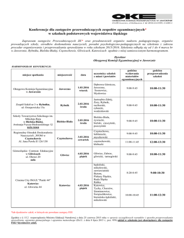 Konferencje dla zastępców przewodniczących zespołów egzaminacyjnych* w szkołach podstawowych województwa śląskiego Zapraszam zastępców Przewodniczących ZE* oraz przedstawicieli organów nadzoru pedagogicznego, organów prowadzących szkoły, ośrodków doskonalenia nauczycieli, poradni psychologiczno-pedagogicznych na szkolenia z zakresu procedur organizowania i przeprowadzania sprawdzianu w roku szkolnym 2015/2016. Szkolenia odbędą się od 1 do 4 marca br w Jaworznie, Rybniku, Bielsku-Białej, Częstochowie, Gliwicach, Katowicach zgodnie z niżej zamieszczonym harmonogramem. Dyrektor Okręgowej Komisji Egzaminacyjnej w Jaworznie HARMONOGRAM KONFERENCJI: miejsce spotkania Okręgowa Komisja Egzaminacyjna w Jaworznie Zespół Szkół nr 3 w Rybniku, ul. Orzepowicka 15a Szkoły Towarzystwa Szkolnego im. Mikołaja Reja w Bielsku-Białej, Górnośląskie Centrum Edukacyjne w Gliwicach ul. Okrzei 20 aula Cinema City IMAX "Punkt 44" Katowice ul. Gliwicka 44 godzina przeprowadzenia szkoleń miejscowość data Jaworzno 1.03.2016 wtorek Dąbrowa Górnicza, Jaworzno, Sosnowiec, Mysłowice 9:00-9:45 10:00-11:30 Rybnik 2.03.2016 środa Jastrzębie-Zdrój, Żory, Rybnik, raciborski, rybnicki, wodzisławski 9:00-9:45 10:00-11:30 Bielsko-Biała 2.03.2016 środa Bielsko-Biała, żywiecki, bielski, cieszyński, pszczyński 9:00-9:45 10:00-11:30 Częstochowa, lubliniecki, myszkowski 9:00-9:45 10:00-11:30 częstochowski, kłobucki 11:00-11:45 12:00-13:30 9:00-9:45 10:00-11:30 8:20-8:45 9:00-10:30 10:00-10:45 11:00-12:30 Andrzeja Frycza-Modrzewskiego 12 aula nowa Regionalny Ośrodek Doskonalenia Nauczycieli „WOM w Częstochowie Al. Jana Pawła II 126/130 godzina wydawania materiałów egzaminacyjnych uczestnicy szkoleń z miast i powiatów Częstochowa Gliwice Katowice 3.03.2016 czwartek 4.03.2016 piątek 4.03.2016 piątek Gliwice, Zabrze, gliwicki, tarnogórski będziński, mikołowski, zawierciański Bytom, Piekary Śląskie, Ruda Śląska Rabka Katowice, Tychy, Chorzów, Siemianowice, Świętochłowice, bieruńsko-lędziński, mikołowski *lub dyrektorów szkół, w których nie powołano zastępcy PZE Zgodnie z § 15.2 rozporządzenia Ministra Edukacji Narodowej z dnia 25 czerwca 2015 roku w sprawie szczegółowych warunków i sposobu przeprowadzania sprawdzianu, egzaminu gimnazjalnego i egzaminu maturalnego (Dz.U. z dnia 8 lipca 2015 r., poz. 959) udział w szkoleniu jest obowiązkowy dla zastępców PZE/*dyrektorów szkół.