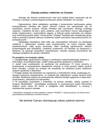 Zasady pobytu rodziców na Campie Kierując się dobrem powierzonych nam pod opiekę dzieci zwracamy się do Państwa z prośbą o przestrzeganie poniższych zasad odwiedzin na Campie. Ograniczenia, które nakładamy wynikają z konieczności zachowania pełnej funkcjonalności ośrodka dla dzieci, których rodzice nie zdecydowali się na odwiedziny swoich pociech. Wizyta Państwa jest czynnikiem, którego przebieg czasowy i nasilenie nie jest z góry ustalone, czyli czynnikiem mocno zaburzającym ściśle rozplanowane i przemyślane zajęcia, w których każdy instruktor ma miejsce przy konkretnej grupie dzieci. Konieczność "obsługi" Państwa jako dodatkowej grupy osób w poważny sposób zaburza możliwości opieki instruktora nad powierzonymi mu podopiecznymi. Zakładając odwiedziny tylko kilku par rodzicielskich instruktor na niezbędne ustalenia z opiekunami zużywa czas porównywalny do czasu trwania zajęć popołudniowych całej grupy obozowej. Stad wynikają ograniczenia, których przestrzeganie jest niezbędne i jesteśmy przekonani, że Państwo po spojrzeniu z dystansu na sytuacje wszystkich campowiczów, również wykażą zrozumienie dla naszego podejścia do sprawy odwiedzin. Po przyjściu na recepcje należy: 1. Uwzględniając ograniczenia recepcji w możliwości natychmiastowego dotarcia z Informacją do podopiecznego, ustalić realną godzinę spotkania z dzieckiem. 2. Jeżeli czas oczekiwania na spotkanie nie przekracza 15 minut prosimy o przebywanie w bezpośrednim sąsiedztwie recepcji, w innej sytuacji należy opuścić teren ośrodka i przyjść do recepcji nie wcześniej niż kwadrans przed ustalonym czasem spotkania z dzieckiem. 3. Przejąć opiekę nad dzieckiem na uzgodniony z instruktorem okres, podpisując na recepcji stosowne oświadczenie i w możliwie jak najkrótszym czasie opuścić teren ośrodka. Możliwość pójścia do pokoju/domku dziecka istnieje wyłącznie w obecności wychowawcy, instruktora lub kierownika. 4. W przypadku pozostania z dzieckiem na terenie ośrodka, należy uzyskać w recepcji identyfikator* pozwalający przebywać w wyznaczonym przez Kierownika miejscu przez okres 45 minut, a następnie zdać identyfikator* w recepcji i niezwłocznie opuścić ośrodek. * Identyfikator występuje w formie plakietki z napisem "RODZIC" i opisana godzina, do której można jej posiadaczowi przebywać na terenie Campu. Na terenie Campu obowiązuje zakaz palenia tytoniu!