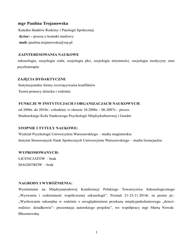 mgr Paulina Trojanowska Katedra Studiów Rodziny i Patologii Społecznej dyżur: - proszę o kontakt mailowy mail: [email protected] ZAINTERESOWANIA NAUKOWE seksuologia, socjologia ciała, socjologia płci, socjologia intymności, socjologia medycyny oraz psychoterapia ZAJĘCIA DYDAKTYCZNE Instytucjonalne formy rozwiązywania konfliktów Teoria pomocy dziecku i rodzinie FUNKCJE W INSTYTUCJACH I ORGANIZACJACH NAUKOWYCH: od 2006r. do 2010r.- członkini; w okresie 10.2006r. - 06.2007r.- prezes Studenckiego Koła Naukowego Psychologii Międzykulturowej i Gender STOPNIE I TYTUŁY NAUKOWE: Wydział Psychologii Uniwersytetu Warszawskiego – studia magisterskie Instytut Stosowanych Nauk Społecznych Uniwersytetu Warszawskiego – studia licencjackie WYPROMOWANYCH: LICENCJATÓW - brak MAGISTRÓW - brak NAGRODY I WYRÓŻNIENIA: Wyróżnienie na Międzynarodowej Konferencji Polskiego Towarzystwa Seksuologicznego „Wyzwania i codzienność współczesnej seksuologii”, Poznań 21-23.11.2014r. za poster pt.: „Wychowanie seksualne w rodzinie z uwzględnieniem przekazu międzypokoleniowego „dziecirodzice- dziadkowie”- prezentacja autorskiego projektu”, we współpracy mgr Martą NowakBłesznowską 1 PUBLIKACJE: ARTYKUŁY W PISMACH FACHOWYCH: Teksty autorskie Trojanowska, P. (2014). Seksualizacja dzieci i młodzieży – przyczyny, przejawy, konsekwencje i propozycje przeciwdziałania. Dziecko krzywdzone. Teoria, badania, praktyka, 13(2). UDZIAŁ W PROJEKTACH BADAWCZYCH Projekt PO KL.01.02.00-035/11 POMOCNA DŁOŃ. Weryfikacja systemu mentorskiego jako procesu umożliwiającego podjęcie pracy przez osoby niepełnosprawne umysłowo na polskim rynku pracy. Udział w realizacji badań jakościowych dotyczących doświadczeń osób niepełnosprawnych intelektualnie związanych z zatrudnieniem WSPÓŁPRACA Z INSTYTUCJAMI I ORGANIZACJAMI Grupa Edukatorów Seksualnych „Ponton” Instytut Pozytywnej Seksualności ZJAZDY, KONFERENCJE, SYMPOZJA, SEMINARIA MIĘDZYNARODOWE 18.04.- 25.04.2010r. - udział w międzynarodowej konferencji naukowej w Holandii organizowanej przez European Federation of Psychology Students' Associations “Free Your Mind”; prowadzenie warsztatu “Free your brain” dla uczestników konferencji KRAJOWE 1. Międzynarodowa konferencja naukowa „Edukacja seksualna – stan - uwarunkowania dobre praktyki”, Warszawa, 29 – 30.11. 2013 r.; Uniwersytet Warszawski (Katedra Biomedycznych Podstaw Rozwoju i Seksuologii, Wydział Pedagogiczny, Podyplomowe Studia Wychowania Seksualnego), Uniwersytet Zielonogórski (Katedra Seksuologii, Poradnictwa i Resocjalizacji Wydział Pedagogiki, Socjologii i Nauk o Zdrowiu) 2. XI Ogólnopolska konferencja "Pomoc dzieciom - ofiarom przestępstw”, Warszawa, 20 -21.10.2014r.; Fundacja Dzieci Niczyje 2 3. Naukowa Konferencja Studencka „Sex, Health, Education, czyli edukacja seksualna w pigułce”, Warszawa, 22.05. 2014 r. Warszawski Uniwersytet Medyczny 4. I Konferencja Naukowa z cyklu Interdyscyplinarne Spojrzenie na Społeczeństwo, „Jak dostrzec zmianę?” Warszawa, 26 – 27.09 2014 r. 5. Międzynarodowa Konferencja Seksuologiczna pt. „Wyzwania i codzienność współczesnej seksuologii”, Poznań, 21-23.11.2014r.; Polskie Towarzystwo Seksuologiczne i Instytut Psychologii UAM . 3