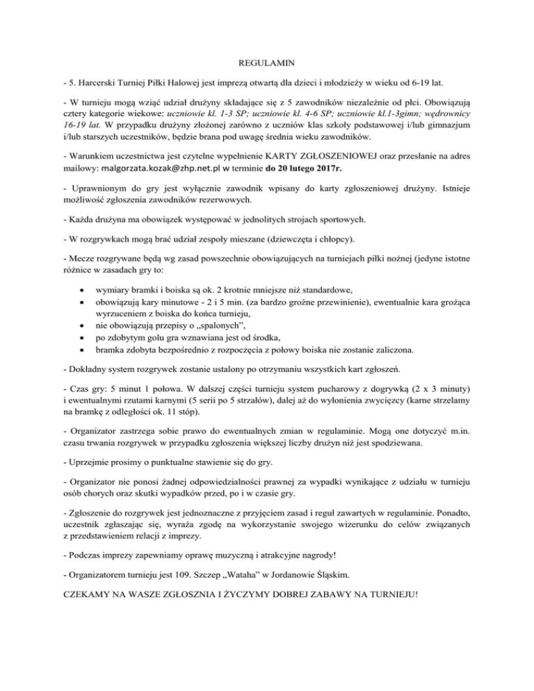 REGULAMIN - 5. Harcerski Turniej Piłki Halowej jest imprezą otwartą dla dzieci i młodzieży w wieku od 6-19 lat. - W turnieju mogą wziąć udział drużyny składające się z 5 zawodników niezależnie od płci. Obowiązują cztery kategorie wiekowe: uczniowie kl. 1-3 SP; uczniowie kl. 4-6 SP; uczniowie kl.1-3gimn; wędrownicy 16-19 lat. W przypadku drużyny złożonej zarówno z uczniów klas szkoły podstawowej i/lub gimnazjum i/lub starszych uczestników, będzie brana pod uwagę średnia wieku zawodników. - Warunkiem uczestnictwa jest czytelne wypełnienie KARTY ZGŁOSZENIOWEJ oraz przesłanie na adres mailowy: [email protected] w terminie do 20 lutego 2017r. - Uprawnionym do gry jest wyłącznie zawodnik wpisany do karty zgłoszeniowej drużyny. Istnieje możliwość zgłoszenia zawodników rezerwowych. - Każda drużyna ma obowiązek występować w jednolitych strojach sportowych. - W rozgrywkach mogą brać udział zespoły mieszane (dziewczęta i chłopcy). - Mecze rozgrywane będą wg zasad powszechnie obowiązujących na turniejach piłki nożnej (jedyne istotne różnice w zasadach gry to: wymiary bramki i boiska są ok. 2 krotnie mniejsze niż standardowe, obowiązują kary minutowe - 2 i 5 min. (za bardzo groźne przewinienie), ewentualnie kara grożąca wyrzuceniem z boiska do końca turnieju, nie obowiązują przepisy o „spalonych”, po zdobytym golu gra wznawiana jest od środka, bramka zdobyta bezpośrednio z rozpoczęcia z połowy boiska nie zostanie zaliczona. - Dokładny system rozgrywek zostanie ustalony po otrzymaniu wszystkich kart zgłoszeń. - Czas gry: 5 minut 1 połowa. W dalszej części turnieju system pucharowy z dogrywką (2 x 3 minuty) i ewentualnymi rzutami karnymi (5 serii po 5 strzałów), dalej aż do wyłonienia zwycięzcy (karne strzelamy na bramkę z odległości ok. 11 stóp). - Organizator zastrzega sobie prawo do ewentualnych zmian w regulaminie. Mogą one dotyczyć m.in. czasu trwania rozgrywek w przypadku zgłoszenia większej liczby drużyn niż jest spodziewana. - Uprzejmie prosimy o punktualne stawienie się do gry. - Organizator nie ponosi żadnej odpowiedzialności prawnej za wypadki wynikające z udziału w turnieju osób chorych oraz skutki wypadków przed, po i w czasie gry. - Zgłoszenie do rozgrywek jest jednoznaczne z przyjęciem zasad i reguł zawartych w regulaminie. Ponadto, uczestnik zgłaszając się, wyraża zgodę na wykorzystanie swojego wizerunku do celów związanych z przedstawieniem relacji z imprezy. - Podczas imprezy zapewniamy oprawę muzyczną i atrakcyjne nagrody! - Organizatorem turnieju jest 109. Szczep „Wataha” w Jordanowie Śląskim. CZEKAMY NA WASZE ZGŁOSZNIA I ŻYCZYMY DOBREJ ZABAWY NA TURNIEJU!