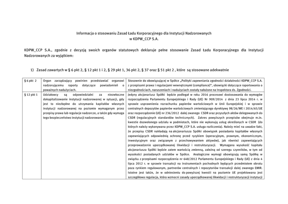Informacja o stosowaniu Zasad Ładu Korporacyjnego dla Instytucji Nadzorowanych w KDPW_CCP S.A. KDPW_CCP S.A., zgodnie z decyzją swoich organów statutowych deklaruje pełne stosowanie Zasad Ładu Korporacyjnego dla Instytucji Nadzorowanych za wyjątkiem: 1) Zasad zawartych w § 6 pkt 2, § 12 pkt 1 i 2, § 29 pkt 1, 36 pkt 2, § 37 oraz § 51 pkt 2 , które są stosowane adekwatnie § 6 pkt 2 Organ zarządzający powinien przedstawiać organowi nadzorującemu raporty dotyczące powiadomień o poważnych nadużyciach. Stosownie do obowiązującej w Spółce „Polityki zapewniania zgodności działalności KDPW_CCP S.A. z przepisami prawa i regulacjami wewnętrznymi (compliance)”, obowiązki dotyczące raportowania o niezgodnościach, naruszeniach i nadużyciach zostały nałożone na Inspektora ds. Zgodności. § 12 pkt 1 Udziałowcy są odpowiedzialni za niezwłoczne dokapitalizowanie instytucji nadzorowanej w sytuacji, gdy jest to niezbędne do utrzymania kapitałów własnych instytucji nadzorowanej na poziomie wymaganym przez przepisy prawa lub regulacje nadzorcze, a także gdy wymaga tego bezpieczeństwo instytucji nadzorowanej. Jedyny akcjonariusz Spółki będzie podlegał w roku 2016 procesowi dostosowania do wymogów rozporządzenia Parlamentu Europejskiego i Rady (UE) Nr 909/2014 z dnia 23 lipca 2014 r. w sprawie usprawnienia rozrachunku papierów wartościowych w Unii Europejskiej i w sprawie centralnych depozytów papierów wartościowych zmieniającego dyrektywę 98/26/WE i 2014/65/UE oraz rozporządzenie (UE) nr 236/2012 dalej zwanego CSDR oraz przyszłych aktów delegowanych do CSDR (regulacyjnych standardów technicznych). Zakres powyższych przepisów obejmuje m.in. kwestie dozwolonego udziału w podmiotach, które nie wykonują usług określonych w CSDR (do których należy wykonywana przez KDPW_CCP S.A. usługa rozliczenia). Należy mieć na uwadze fakt, że przepisy CSDR nakładają na akcjonariusza Spółki obowiązek posiadania kapitałów własnych zapewniających odpowiednią ochronę przed ryzykiem (operacyjnym, prawnym, ekonomicznym, inwestycyjnym oraz związanym z przechowywaniem aktywów), jak również zapewniających przeprowadzenie uporządkowanej likwidacji i restrukturyzacji. Wymagana wysokość kapitału akcjonariusza Spółki będzie zatem wartością zmienną, zależną od szeregu czynników, w tym od wysokości posiadanych udziałów w Spółce. Analogiczne wymogi obowiązują samą Spółkę w związku z przepisami rozporządzenia nr 648/2012 Parlamentu Europejskiego i Rady (UE) z dnia 4 lipca 2012 r. w sprawie transakcji na instrumentach pochodnych będących przedmiotem obrotu poza rynkiem regulowanym, partnerów centralnych i repozytoriów transakcji dalej zwanego EMIR. Istotne jest także, że w odniesieniu do powyższej kwestii na poziomie UE projektowana jest szczegółowa regulacja, która wzmocni zasady uporządkowanej likwidacji i restrukturyzacji instytucji niebankowych, w tym CCP. Regulacja ta wprowadzi obowiązek posiadania i stosowania m.in. planu restrukturyzacji, aby zapewnić ciągłość krytycznych operacji oraz podstawowych usług, biorąc pod uwagę wielkość, znaczenie systemowe, naturę, skalę oraz kompleksowość świadczonych usług. Wśród narzędzi, które mogą wchodzić w zakres takich planów jest m.in. podwyższenie kapitału, zawieszenie wypłaty dywidend, czy też zmiennych składników wynagrodzenia a także restrukturyzacja zobowiązań lub też uzyskanie innego wsparcia ze strony udziałowców. Akcjonariusz podejmie działania, w celu utrzymania kapitałów własnych Spółki na poziomie wymaganym przez przepisy prawa lub regulacje nadzorcze albo, gdy będzie tego wymagało bezpieczeństwo Spółki. Akcjonariusz podejmie te działania biorąc pod uwagę obowiązujące przepisy prawa stanowionego w kraju oraz na poziomie UE i wynikające z nich ograniczenia oraz wszystkie istotne okoliczności i fakty go dotyczące, w tym własne bezpieczeństwo oraz zapewnienie ciągłości krytycznych operacji. W szczególności akcjonariusz może ustalić ograniczenie w zakresie poziomu udzielenia wsparcia kapitałowego Spółce. § 12 pkt 2 Udziałowcy powinni być odpowiedzialni za niezwłoczne dostarczenie instytucji nadzorowanej wsparcia finansowego w sytuacji, gdy jest to niezbędne do utrzymania płynności instytucji nadzorowanej na poziomie wymaganym przez przepisy prawa lub regulacje nadzorcze, a także gdy wymaga tego bezpieczeństwo instytucji nadzorowanej. Jedyny akcjonariusz Spółki będzie podlegał w roku 2016 procesowi dostosowania do wymogów rozporządzenia Parlamentu Europejskiego i Rady (UE) Nr 909/2014 z dnia 23 lipca 2014 r. w sprawie usprawnienia rozrachunku papierów wartościowych w Unii Europejskiej i w sprawie centralnych depozytów papierów wartościowych zmieniającego dyrektywę 98/26/WE i 2014/65/UE oraz rozporządzenie (UE) nr 236/2012 dalej zwanego CSDR oraz przyszłych aktów delegowanych do CSDR (regulacyjnych standardów technicznych). Zakres powyższych przepisów obejmuje m.in. kwestie dozwolonego udziału w podmiotach, które nie wykonują usług określonych w CSDR (do których należy wykonywana przez KDPW_CCP S.A. usługa rozliczenia). Należy mieć na uwadze fakt, że przepisy CSDR nakładają na akcjonariusza Spółki obowiązek posiadania kapitałów własnych zapewniających odpowiednią ochronę przed ryzykiem (operacyjnym, prawnym, ekonomicznym, inwestycyjnym oraz związanym z przechowywaniem aktywów), jak również zapewniających przeprowadzenie uporządkowanej likwidacji i restrukturyzacji. Wymagana wysokość kapitału akcjonariusza Spółki będzie zatem wartością zmienną, zależną od szeregu czynników, w tym od wysokości posiadanych udziałów w Spółce. Analogiczne wymogi obowiązują samą Spółkę w związku z przepisami rozporządzenia nr 648/2012 Parlamentu Europejskiego i Rady (UE) z dnia 4 lipca 2012 r. w sprawie transakcji na instrumentach pochodnych 