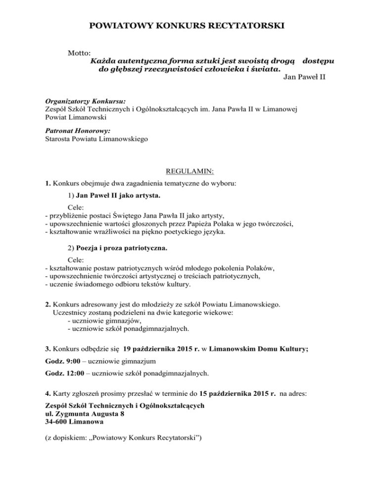 POWIATOWY KONKURS RECYTATORSKI Motto: Każda autentyczna forma sztuki jest swoistą drogą dostępu do głębszej rzeczywistości człowieka i świata. Jan Paweł II Organizatorzy Konkursu: Zespół Szkół Technicznych i Ogólnokształcących im. Jana Pawła II w Limanowej Powiat Limanowski Patronat Honorowy: Starosta Powiatu Limanowskiego REGULAMIN: 1. Konkurs obejmuje dwa zagadnienia tematyczne do wyboru: 1) Jan Paweł II jako artysta. Cele: - przybliżenie postaci Świętego Jana Pawła II jako artysty, - upowszechnienie wartości głoszonych przez Papieża Polaka w jego twórczości, - kształtowanie wrażliwości na piękno poetyckiego języka. 2) Poezja i proza patriotyczna. Cele: - kształtowanie postaw patriotycznych wśród młodego pokolenia Polaków, - upowszechnienie twórczości artystycznej o treściach patriotycznych, - uczenie świadomego odbioru tekstów kultury. 2. Konkurs adresowany jest do młodzieży ze szkół Powiatu Limanowskiego. Uczestnicy zostaną podzieleni na dwie kategorie wiekowe: - uczniowie gimnazjów, - uczniowie szkół ponadgimnazjalnych. 3. Konkurs odbędzie się 19 października 2015 r. w Limanowskim Domu Kultury; Godz. 9:00 – uczniowie gimnazjum Godz. 12:00 – uczniowie szkół ponadgimnazjalnych. 4. Karty zgłoszeń prosimy przesłać w terminie do 15 października 2015 r. na adres: Zespół Szkół Technicznych i Ogólnokształcących ul. Zygmunta Augusta 8 34-600 Limanowa (z dopiskiem: „Powiatowy Konkurs Recytatorski”) 5. Reguły uczestnictwa: a) Każda szkoła może zgłosić do trzech uczestników. b) Każdy uczestnik wykonuje jeden utwór z wybranego jednego zagadnienia tematycznego. c) Czas trwania występu nie może przekraczać 5 minut. 6. Oceny prezentacji dokona niezależne Jury. Ocenie podlegają: - dobór repertuaru, - poprawność artykulacyjno- intonacyjna, - interpretacja, - walory estetyczne i etyczne, - ogólny wyraz artystyczny. 7. Dla laureatów w obu kategoriach Organizator zapewnia nagrody, dla wszystkich dyplomy okolicznościowe. 8. Wyniki Przeglądu oraz nazwiska laureatów zostaną opublikowane w lokalnych portalach internetowych. 9. Bliższe informacje na temat przeglądu można uzyskać w sekretariacie ZSTiO pod numerem telefonu 18 33 72 602. 10. Wzór karty zgłoszenia jest dołączony do regulaminu lub dostępny na szkolnej stronie internetowej pod adresem www. zstio.edu.pl Serdecznie zapraszamy do udziału w Konkursie! Organizatorzy. Limanowa, dnia 14.09.2015 r. KARTA UCZESTNIKA KONKURSU 1. Imię i nazwisko……………………………………………………………… 2. Adres………………………………………………………………………… 3. Nazwa i adres szkoły………………………………………………………….. ……………………………………………………………………………………. ……………………………………………………………………………………. 4. Zagadnienie tematyczne wybrane przez uczestnika konkursu (podkreślić właściwe) 1) Jan Paweł II jako artysta 2) Poezja i proza patriotyczna 5. Utwór przygotowany na konkurs (tytuł , czas prezentacji). …………………………………………………………………………………… ………………………………………………………………………………….... 6. Imię nazwisko opiekuna……………………………………………………….. ………………………. miejscowość i data ……………………. podpis opiekuna