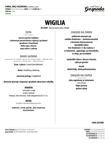 FIRMA, IMIĘ I NAZWISKO, nr telefonu, email TERMIN: 00-00-20145(dzień) GODZ: 00:00 LICZBA OS: 00 CENA OS: 139zł zadatek WIGILIA NA START: START: domowa pasta rybna, chlebek ZUPA ( 2 zupy do wybrania ) barszcz postny wigilijny z domowym pasztecikiem z kpustą i grzybami grzybowa z łazankami biała zupa z dorsza zupa rybna z cydrem DANIE GŁÓWNE (powyżej 20 os. do wybrania 3 dania po 70% z każdego rodzaju – 100g każda porcja poniżej 20 os. 2 dania po 100% – 100g każda porcja) karp z pieca z sosem piernikowym ZAKĄSKI NA ZIMNO półmisek zimnych ryb sałatka śledziowo – ziemniaczanalub z łososiem lub jarzynowa tymabliki rybne trio śledziowe ( 3 do wyboru ): w śmietanie , gajowego, po kaszubsku, w oleju, po szwedzku tymbaliki rybne z dorsza i łososia ryba po grecku dorsz z konfiturą cebulową masło chleb biały, chleb pełnoziarnisty smażony pstrąg z migdałami ZAKĄSKI NA CIEPŁO domowe pierogi z kapustą i grzybam okraszone cebulką DODATKI ziemniaki z wody zestaw surówek kompot, soki owocowe, woda niegazowana 0,5 l / os. ( 1 danie do wyboru ) ryba zapiekany w śmietanie z pieczarkami bigos postny gulasz rybny DESER (do wybrania 1 rodzaj ciasta, dodatkowa porcja 5zł/os.) makowiec, sernik, piernik , keks świąteczny kawa/herbata CENA ZESTAW Chata Chłopska s.c. 80-203 Gdańsk, ul. Giełguda 4 Bank SZTUM 28 8309 0000 0067 3340 2000 0020 INTERNET www.gospodagdansk.pl EMAIL [email protected] TEL RESTAURACJA 58 524 00 95 TEL RESTAURACJA 510 096 591 TEL MANAGER 502 120 356 FIRMA, IMIĘ I NAZWISKO, nr telefonu, email TERMIN: 00-00-20145(dzień) GODZ: 00:00 LICZBA OS: 00 CENA OS: 139zł zadatek 139zł /osoba Chata Chłopska s.c. 80-203 Gdańsk, ul. Giełguda 4 Bank SZTUM 28 8309 0000 0067 3340 2000 0020 INTERNET www.gospodagdansk.pl EMAIL [email protected] TEL RESTAURACJA 58 524 00 95 TEL RESTAURACJA 510 096 591 TEL MANAGER 502 120 356