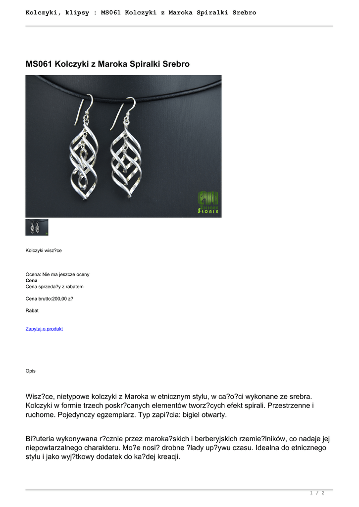 Kolczyki, klipsy : MS061 Kolczyki z Maroka Spiralki Srebro MS061 Kolczyki z Maroka Spiralki Srebro Kolczyki wisz?ce Ocena: Nie ma jeszcze oceny Cena Cena sprzeda?y z rabatem Cena brutto:200,00 z? Rabat Zapytaj o produkt Opis Wisz?ce, nietypowe kolczyki z Maroka w etnicznym stylu, w ca?o?ci wykonane ze srebra. Kolczyki w formie trzech poskr?canych elementów tworz?cych efekt spirali. Przestrzenne i ruchome. Pojedynczy egzemplarz. Typ zapi?cia: bigiel otwarty. Bi?uteria wykonywana r?cznie przez maroka?skich i berberyjskich rzemie?lników, co nadaje jej niepowtarzalnego charakteru. Mo?e nosi? drobne ?lady up?ywu czasu. Idealna do etnicznego stylu i jako wyj?tkowy dodatek do ka?dej kreacji. 1 / 2 Kolczyki, klipsy : MS061 Kolczyki z Maroka Spiralki Srebro Kamie?: Brak Kolor kamienia: Nie dotyczy Materia?: Srebro Waga: 9,2 g Wymiary ca?o?ci: D?ugo?? 5,8 cm; Szeroko?? 1,7 cm Kraj pochodzenia: Maroko W zestawie ozdobne pude?eczko. Opinie Nikt jeszcze nie recenzowa? tego produktu. 2 / 2 Powered by TCPDF (www.tcpdf.org)