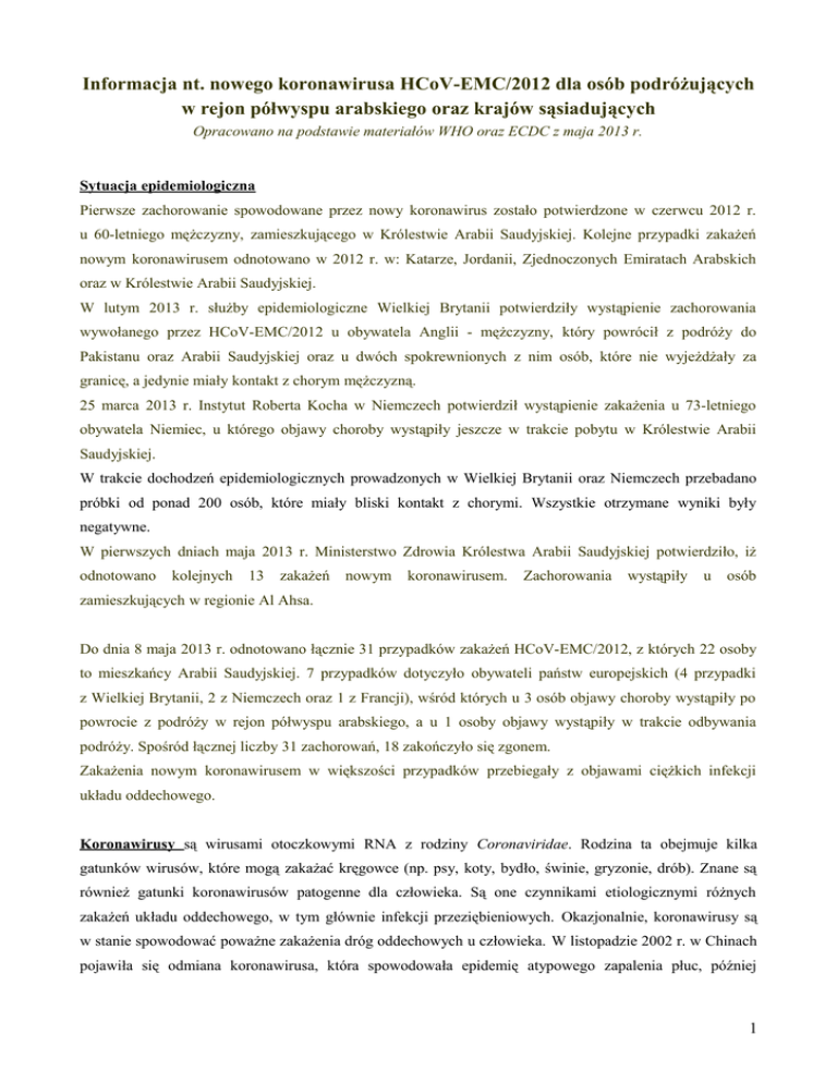 Informacja nt. nowego koronawirusa HCoV-EMC/2012 dla osób podróżujących w rejon półwyspu arabskiego oraz krajów sąsiadujących Opracowano na podstawie materiałów WHO oraz ECDC z maja 2013 r. Sytuacja epidemiologiczna Pierwsze zachorowanie spowodowane przez nowy koronawirus zostało potwierdzone w czerwcu 2012 r. u 60-letniego mężczyzny, zamieszkującego w Królestwie Arabii Saudyjskiej. Kolejne przypadki zakażeń nowym koronawirusem odnotowano w 2012 r. w: Katarze, Jordanii, Zjednoczonych Emiratach Arabskich oraz w Królestwie Arabii Saudyjskiej. W lutym 2013 r. służby epidemiologiczne Wielkiej Brytanii potwierdziły wystąpienie zachorowania wywołanego przez HCoV-EMC/2012 u obywatela Anglii - mężczyzny, który powrócił z podróży do Pakistanu oraz Arabii Saudyjskiej oraz u dwóch spokrewnionych z nim osób, które nie wyjeżdżały za granicę, a jedynie miały kontakt z chorym mężczyzną. 25 marca 2013 r. Instytut Roberta Kocha w Niemczech potwierdził wystąpienie zakażenia u 73-letniego obywatela Niemiec, u którego objawy choroby wystąpiły jeszcze w trakcie pobytu w Królestwie Arabii Saudyjskiej. W trakcie dochodzeń epidemiologicznych prowadzonych w Wielkiej Brytanii oraz Niemczech przebadano próbki od ponad 200 osób, które miały bliski kontakt z chorymi. Wszystkie otrzymane wyniki były negatywne. W pierwszych dniach maja 2013 r. Ministerstwo Zdrowia Królestwa Arabii Saudyjskiej potwierdziło, iż odnotowano kolejnych 13 zakażeń nowym koronawirusem. Zachorowania wystąpiły u osób zamieszkujących w regionie Al Ahsa. Do dnia 8 maja 2013 r. odnotowano łącznie 31 przypadków zakażeń HCoV-EMC/2012, z których 22 osoby to mieszkańcy Arabii Saudyjskiej. 7 przypadków dotyczyło obywateli państw europejskich (4 przypadki z Wielkiej Brytanii, 2 z Niemczech oraz 1 z Francji), wśród których u 3 osób objawy choroby wystąpiły po powrocie z podróży w rejon półwyspu arabskiego, a u 1 osoby objawy wystąpiły w trakcie odbywania podróży. Spośród łącznej liczby 31 zachorowań, 18 zakończyło się zgonem. Zakażenia nowym koronawirusem w większości przypadków przebiegały z objawami ciężkich infekcji układu oddechowego. Koronawirusy są wirusami otoczkowymi RNA z rodziny Coronaviridae. Rodzina ta obejmuje kilka gatunków wirusów, które mogą zakażać kręgowce (np. psy, koty, bydło, świnie, gryzonie, drób). Znane są również gatunki koronawirusów patogenne dla człowieka. Są one czynnikami etiologicznymi różnych zakażeń układu oddechowego, w tym głównie infekcji przeziębieniowych. Okazjonalnie, koronawirusy są w stanie spowodować poważne zakażenia dróg oddechowych u człowieka. W listopadzie 2002 r. w Chinach pojawiła się odmiana koronawirusa, która spowodowała epidemię atypowego zapalenia płuc, później 1 określonego jako SARS (pochodzenie tego wirusa, prawdopodobnie od zwierząt, jak dotąd nie jest wyjaśnione). Obecnie nie ma szczepionki, ani innych specjalnych środków zapobiegających rozprzestrzenianiu się koronawirusów. W celu zmniejszenia ryzyka i rozprzestrzeniania się infekcji należy unikać ekspozycji i kontaktu z osobami chorymi. Z powodu niewielkiej liczby przypadków zachorowań spowodowanych HCoV-EMC/2012, odnotowanych w 2012 i 2013 roku na świecie, a także w związku z wciąż trwającymi dochodzeniami epidemiologicznymi, wiedza na temat choroby wywoływanej przez nowego koronawirusa jest wciąż ograniczona. HCoV-EMC/2012 różni się od innych koronawirusów występujących u ludzi, w tym również od wirusa SARS. Z dotychczasowych danych wynika, iż nowy szczep pochodzi prawdopodobnie ze źródła zwierzęcego. Dotychczas nie potwierdzono jednak jednoznacznie zarówno źródła, rezerwuaru (prawdopodobnie nietoperze), jak i drogi szerzenia się zakażenia. Istnieje możliwość, że kluczowym elementem w szerzeniu się zakażeń wirusem nie odgrywają bezpośrednio nietoperze (nie udowodniono bezpośredniej transmisji wirusa z tych zwierząt na człowieka), natomiast przypuszcza się, że rolę może odgrywać wektor, albo środowisko skażone czynnikiem biologicznym. Dodatkowo ponieważ wyizolowany od ludzi HCoV-EMC/2012 wykazuje podobieństwo do koronawirusów występujących u nietoperzy w wielu regionach świata, istnieje możliwość, iż pojedyncze przypadki zachorowań będą się pojawiać sporadycznie również w innych krajach. Do chwili obecnej nie ma również jasności w zakresie możliwości szerzenia się zakażenia bezpośrednio z człowieka na człowieka. Zgodnie z najnowszymi danymi WHO, ECDC oraz brytyjskiej Heath Protection Agency (HPA) ryzyko związane z szerzeniem się zakażeń nowym koronawirusem pozostaje niskie. WHO nie zaleca wprowadzenia żadnych ograniczeń w ruchu pasażerskim ani towarowym, jak również nie wskazuje na konieczność podejmowania dodatkowych działań przeciwepidemicznych przez służby państw, w których wystąpiły zachorowania. W razie zachorowania w trakcie pobytu należy natychmiast poprosić o pomoc lekarską, zaś w przypadku wystąpienia niepokojących objawów chorobowych po powrocie z ww. rejonów należy niezwłocznie zgłosić się do lekarza, informując o przebytej podróży. W celu uzyskania informacji o innych zagrożeniach należy przed wyjazdem do tych krajów skontaktować się z lekarzem medycyny podróży lub lekarzem medycyny chorób tropikalnych, najlepiej nie później niż 4 - 6 tyg. przed planowaną podróżą. Pozwoli to na przyjęcie zalecanej przez lekarza profilaktyki. Więcej informacji dotyczących bezpieczeństwa w ww. państwach znajduje się na stronie Ministerstwa Spraw Zagranicznych w zakładce „Polak za granicą”. 2