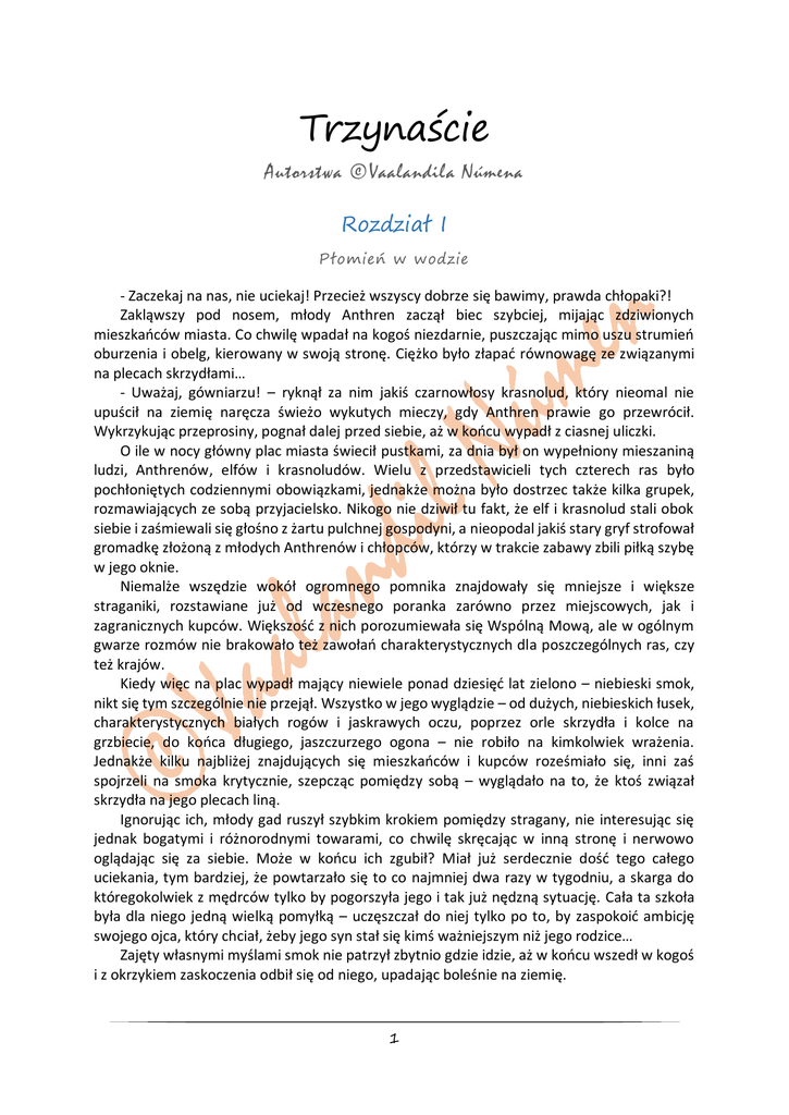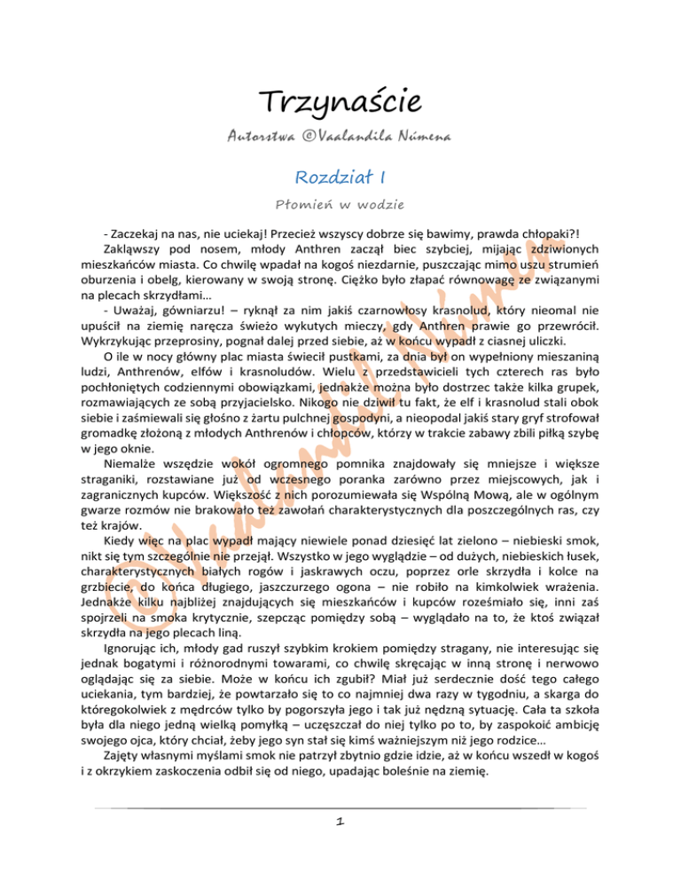 Trzynaście Autorstwa ©Vaalandila Númena Rozdział I Płomień w wodzie - Zaczekaj na nas, nie uciekaj! Przecież wszyscy dobrze się bawimy, prawda chłopaki?! Zakląwszy pod nosem, młody Anthren zaczął biec szybciej, mijając zdziwionych mieszkańców miasta. Co chwilę wpadał na kogoś niezdarnie, puszczając mimo uszu strumień oburzenia i obelg, kierowany w swoją stronę. Ciężko było złapać równowagę ze związanymi na plecach skrzydłami… - Uważaj, gówniarzu! – ryknął za nim jakiś czarnowłosy krasnolud, który nieomal nie upuścił na ziemię naręcza świeżo wykutych mieczy, gdy Anthren prawie go przewrócił. Wykrzykując przeprosiny, pognał dalej przed siebie, aż w końcu wypadł z ciasnej uliczki. O ile w nocy główny plac miasta świecił pustkami, za dnia był on wypełniony mieszaniną ludzi, Anthrenów, elfów i krasnoludów. Wielu z przedstawicieli tych czterech ras było pochłoniętych codziennymi obowiązkami, jednakże można było dostrzec także kilka grupek, rozmawiających ze sobą przyjacielsko. Nikogo nie dziwił tu fakt, że elf i krasnolud stali obok siebie i zaśmiewali się głośno z żartu pulchnej gospodyni, a nieopodal jakiś stary gryf strofował gromadkę złożoną z młodych Anthrenów i chłopców, którzy w trakcie zabawy zbili piłką szybę w jego oknie. Niemalże wszędzie wokół ogromnego pomnika znajdowały się mniejsze i większe straganiki, rozstawiane już od wczesnego poranka zarówno przez miejscowych, jak i zagranicznych kupców. Większość z nich porozumiewała się Wspólną Mową, ale w ogólnym gwarze rozmów nie brakowało też zawołań charakterystycznych dla poszczególnych ras, czy też krajów. Kiedy więc na plac wypadł mający niewiele ponad dziesięć lat zielono – niebieski smok, nikt się tym szczególnie nie przejął. Wszystko w jego wyglądzie – od dużych, niebieskich łusek, charakterystycznych białych rogów i jaskrawych oczu, poprzez orle skrzydła i kolce na grzbiecie, do końca długiego, jaszczurzego ogona – nie robiło na kimkolwiek wrażenia. Jednakże kilku najbliżej znajdujących się mieszkańców i kupców roześmiało się, inni zaś spojrzeli na smoka krytycznie, szepcząc pomiędzy sobą – wyglądało na to, że ktoś związał skrzydła na jego plecach liną. Ignorując ich, młody gad ruszył szybkim krokiem pomiędzy stragany, nie interesując się jednak bogatymi i różnorodnymi towarami, co chwilę skręcając w inną stronę i nerwowo oglądając się za siebie. Może w końcu ich zgubił? Miał już serdecznie dość tego całego uciekania, tym bardziej, że powtarzało się to co najmniej dwa razy w tygodniu, a skarga do któregokolwiek z mędrców tylko by pogorszyła jego i tak już nędzną sytuację. Cała ta szkoła była dla niego jedną wielką pomyłką – uczęszczał do niej tylko po to, by zaspokoić ambicję swojego ojca, który chciał, żeby jego syn stał się kimś ważniejszym niż jego rodzice… Zajęty własnymi myślami smok nie patrzył zbytnio gdzie idzie, aż w końcu wszedł w kogoś i z okrzykiem zaskoczenia odbił się od niego, upadając boleśnie na ziemię. 1 - No proszę… A jednak postanowiłeś dokończyć z nami zabawę. Jak miło… - odezwała się rosła sylwetka tuż przed nim, a w jej głosie brzmiało mściwe zadowolenie. Wymamrotawszy coś cicho pod nosem, smok podniósł się i odwrócił się z zamiarem ucieczki, ale na jego drodze stanęło dwóch starszych od niego chłopaków i anthreński gepard, szczerząc się złośliwie. - Słuchaj Lyon… - zaczął lekko drżącym głosem gad, przenosząc powoli spojrzenie na młodego niedźwiedzia, który przewyższał go co najmniej o głowę, a ważył co najmniej dwa razy tyle co on. – Po co nam to wszystko… Przecież możemy żyć jak przyjaciele… Lyon uniósł wysoko brwi, po czym wybuchnął śmiechem, a członkowie bandy usłużnie do niego dołączyli. - Naprawdę umiesz nas rozbawić, Shiru – mruknął niedźwiedź, klepnąwszy smoka w ramię z taką siłą, że ten niemalże po raz drugi upadł na ziemię. – My jednak wiemy już, jak odpowiednio wykorzystać ten twój talent, co nie chłopaki? - Nie inaczej – odparł jeden z chłopaków, szczerząc się zjadliwie. – Musimy tylko popracować nieco nad tym uciekaniem… Następnym razem dla pewności zwiążemy mu też nogi. - Ale przecież cała frajda jest w tym jak ucieka – rzucił gepard, patrząc z ukosa na człowieka. – Żadna to atrakcja, jeśli będzie nieruchomy… - Popieram – powiedział Lyon tonem znawcy. – Ale faktycznie trzeba nieco popracować nad naszą zabawą. Jeśli spóźnimy się na lekcje, może być niezła wpadka… Podczas gdy cała czwórka zaczęła pomiędzy sobą intensywnie i głośno dyskutować, Shiru zaczął cofać się w tył, rzucając im co chwilę nerwowe spojrzenie. Jeden krok, następny, a po chwili jeszcze jeden… Gdyby tylko udało mu się wykorzystać chwilową nieuwagę swoich oprawców, byłby wolny… Nagle jego noga uderzyła w wiaderko, które z głośnym szczęknięciem upadło w tył. - A ty niby gdzie się znowu wybierasz? – Lyon, do tej chwili pochylony nad innymi i zajęty rozmową wyprostował się, patrząc na gada z czymś w rodzaju politowania. – Hej chłopaki, główny uczestnik zabawy zamierza po raz kolejny zmyć się przed jej końcem. Przeklinając się głośno w myślach za własną niezdarność, smok mógł już tylko patrzeć, jak cała banda rusza w jego stronę, zaciskając łapy i dłonie w pięści, uśmiechając się głupkowato. Walka nie miała najmniejszego sensu – za każdym razem gdy się bronił, dostawał jeszcze gorsze cięgi. Ze zrezygnowaniem cofnął się jeszcze o krok… Niestety zbyt gwałtownie. Gdy tył ciała Anthrena uderzył w murek na wysokości jego ogona, stracił gwałtownie równowagę. Przez chwilę rozpaczliwie wymachiwał łapami, próbując ją odzyskać, po czym runął w głąb zi