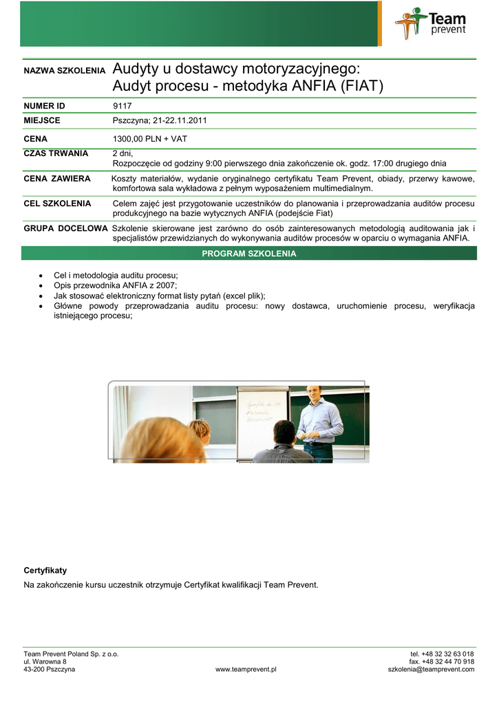 NAZWA SZKOLENIA Audyty u dostawcy motoryzacyjnego: Audyt procesu - metodyka ANFIA (FIAT) NUMER ID 9117 MIEJSCE Pszczyna; 21-22.11.2011 CENA 1300,00 PLN + VAT CZAS TRWANIA 2 dni, Rozpoczęcie od godziny 9:00 pierwszego dnia zakończenie ok. godz. 17:00 drugiego dnia CENA ZAWIERA Koszty materiałów, wydanie oryginalnego certyfikatu Team Prevent, obiady, przerwy kawowe, komfortowa sala wykładowa z pełnym wyposażeniem multimedialnym. CEL SZKOLENIA Celem zajęć jest przygotowanie uczestników do planowania i przeprowadzania auditów procesu produkcyjnego na bazie wytycznych ANFIA (podejście Fiat) GRUPA DOCELOWA Szkolenie skierowane jest zarówno do osób zainteresowanych metodologią auditowania jak i specjalistów przewidzianych do wykonywania auditów procesów w oparciu o wymagania ANFIA. PROGRAM SZKOLENIA Cel i metodologia auditu procesu; Opis przewodnika ANFIA z 2007; Jak stosować elektroniczny format listy pytań (excel plik); Główne powody przeprowadzania auditu procesu: nowy dostawca, uruchomienie procesu, weryfikacja istniejącego procesu; Certyfikaty Na zakończenie kursu uczestnik otrzymuje Certyfikat kwalifikacji Team Prevent. Team Prevent Poland Sp. z o.o. ul. Warowna 8 43-200 Pszczyna www.teamprevent.pl tel. +48 32 32 63 018 fax. +48 32 44 70 918 [email protected]