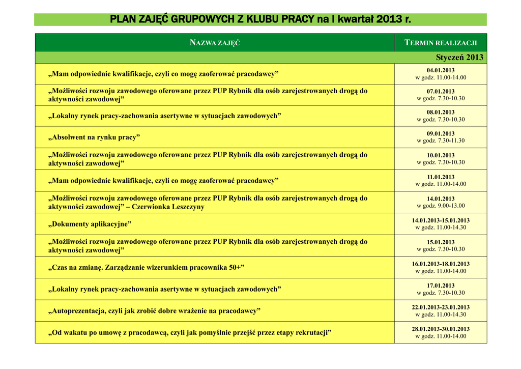 PLAN ZAJĘĆ GRUPOWYCH Z KLUBU PRACY na I kwartał 2013 r. NAZWA ZAJĘĆ TERMIN REALIZACJI Styczeń 2013 „Mam odpowiednie kwalifikacje, czyli co mogę zaoferować pracodawcy” 04.01.2013 w godz. 11.00-14.00 „Możliwości rozwoju zawodowego oferowane przez PUP Rybnik dla osób zarejestrowanych drogą do aktywności zawodowej” 07.01.2013 w godz. 7.30-10.30 „Lokalny rynek pracy-zachowania asertywne w sytuacjach zawodowych” 08.01.2013 w godz. 7.30-10.30 „Absolwent na rynku pracy” 09.01.2013 w godz. 7.30-11.30 „Możliwości rozwoju zawodowego oferowane przez PUP Rybnik dla osób zarejestrowanych drogą do aktywności zawodowej” 10.01.2013 w godz. 7.30-10.30 „Mam odpowiednie kwalifikacje, czyli co mogę zaoferować pracodawcy” 11.01.2013 w godz. 11.00-14.00 „Możliwości rozwoju zawodowego oferowane przez PUP Rybnik dla osób zarejestrowanych drogą do aktywności zawodowej” – Czerwionka Leszczyny 14.01.2013 w godz. 9.00-13.00 „Dokumenty aplikacyjne” „Możliwości rozwoju zawodowego oferowane przez PUP Rybnik dla osób zarejestrowanych drogą do aktywności zawodowej” „Czas na zmianę. Zarządzanie wizerunkiem pracownika 50+” „Lokalny rynek pracy-zachowania asertywne w sytuacjach zawodowych” 14.01.2013-15.01.2013 w godz. 11.00-14.30 15.01.2013 w godz. 7.30-10.30 16.01.2013-18.01.2013 w godz. 11.00-14.00 17.01.2013 w godz. 7.30-10.30 „Autoprezentacja, czyli jak zrobić dobre wrażenie na pracodawcy” 22.01.2013-23.01.2013 w godz. 11.00-14.30 „Od wakatu po umowę z pracodawcą, czyli jak pomyślnie przejść przez etapy rekrutacji” 28.01.2013-30.01.2013 w godz. 11.00-14.00 „Mam odpowiednie kwalifikacje, czyli co mogę zaoferować pracodawcy” 30.01.2013 w godz. 07.30-10.30 Luty 2013 „Daj się zauważyć. Mity i fakty na temat życiorysu zawodowego” „Szkolenie z aktywnego poszukiwania pracy „Szukam Pracy” 01.02.2013 w godz. 7.30-10.30 04.02.2013-22.02.2013 w godz. 10.30-14.30 „Mam odpowiednie kwalifikacje, czyli co mogę zaoferować pracodawcy” 14.02.2013 w godz. 07.30-10.30 „Mam odpowiednie kwalifikacje, czyli co mogę zaoferować pracodawcy” 15.02.2013 w godz. 07.30-10.30 „Od wakatu po umowę z pracodawcą, czyli jak pomyślnie przejść przez etapy rekrutacji” 18.02.2013-20.02.2013 w godz. 11.00-14.00 „Dokumenty aplikacyjne” 21.02.2013-22.02.2013 w godz. 11.00-14.30 „Mówisz-Masz Techniki skutecznej komunikacji” 25.02.2013-27.02.2013 w godz. 11.00-14.00 „Mam odpowiednie kwalifikacje, czyli co mogę zaoferować pracodawcy” 26.02.2013 w godz. 07.30-10.30 „Mam odpowiednie kwalifikacje, czyli co mogę zaoferować pracodawcy” 27.02.2013 w godz. 07.30-10.30 Marzec 2013 „Dokumenty aplikacyjne” 04.03.2013-05.03.2013 w godz. 11.00-14.30 „Od wakatu po umowę z pracodawcą, czyli jak pomyślnie przejść przez etapy rekrutacji” 06.03.2013-08.03.2013 w godz. 11.00-14.00 „Możliwości rozwoju zawodowego oferowane przez PUP Rybnik dla osób zarejestrowanych drogą do aktywności zawodowej” 07.03.2013 w godz. 7.30-10.30 „Mam odpowiednie kwalifikacje, czyli co mogę zaoferować pracodawcy” 11.03.2013 w godz. 07.30-10.30 „Lokalny rynek pracy-zachowania asertywne w sytuacjach zawodowych” „Pewność siebie. Pewny sukces” 12.03.2013 w godz. 7.30-10.30 13.03.2013-15.03.2013 w godz. 11.00-14.00 „Możliwości rozwoju zawodowego oferowane przez PUP Rybnik dla osób zarejestrowanych drogą do aktywności zawodowej” 14.03.2013 w godz. 7.30-10.30 „Mam odpowiednie kwalifikacje, czyli co mogę zaoferować pracodawcy” 15.03.2013 w godz. 07.30-10.30 „Mam odpowiednie kwalifikacje, czyli co mogę zaoferować pracodawcy” 18.03.2013 w godz. 11.00-14.00 „Możliwości rozwoju zawodowego oferowane przez PUP Rybnik dla osób zarejestrowanych drogą do aktywności zawodowej” 19.03.2013 w godz. 7.30-10.30 „Jak zwiększyć efektywność realizacji działań? - zarządzanie czasem” „Możliwości rozwoju zawodowego oferowane przez PUP Rybnik dla osób zarejestrowanych drogą do aktywności zawodowej” „Autoprezentacja, czyli jak zrobić dobre wrażenie na pracodawcy” 20.03.2013-21.03.2013 w godz. 11.00-14.00 22.03.2013 w godz. 7.30-10.30 25.03.2013-26.03.2013 w godz. 11.00-14.30 „Daj się zauważyć. Mity i fakty na temat życiorysu zawodowego” 26.03.2013 w godz. 7.30-10.30 „Mam odpowiednie kwalifikacje, czyli co mogę zaoferować pracodawcy” 27.03.2013 w godz. 11.00-14.00 Zapisy i szczegółowe informacje dotyczące udziału w zajęciach udzielane są w pokojach 211 i 213 w siedzibie Powiatowego Urzędu Pracy w Rybniku przy ul. Jankowickiej 3 lub pod numerem telefonu (0 32) 422 16 23 wew. 241 lub 239. Zapraszamy!