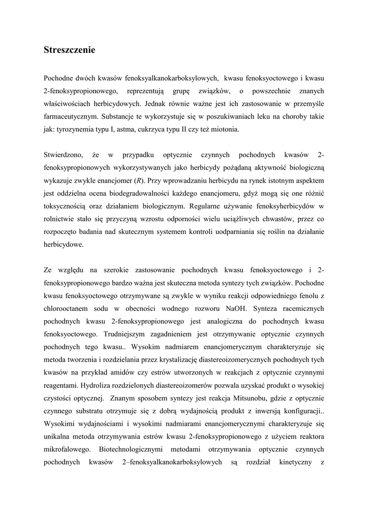 Streszczenie Pochodne dwóch kwasów fenoksyalkanokarboksylowych, kwasu fenoksyoctowego i kwasu 2-fenoksypropionowego, reprezentują grupę związków, o powszechnie znanych właściwościach herbicydowych. Jednak równie ważne jest ich zastosowanie w przemyśle farmaceutycznym. Substancje te wykorzystuje się w poszukiwaniach leku na choroby takie jak: tyrozynemia typu I, astma, cukrzyca typu II czy też miotonia. Stwierdzono, że w przypadku optycznie czynnych pochodnych kwasów 2- fenoksypropionowych wykorzystywanych jako herbicydy pożądaną aktywność biologiczną wykazuje zwykle enancjomer (R). Przy wprowadzaniu herbicydu na rynek istotnym aspektem jest oddzielna ocena biodegradowalności każdego enancjomeru, gdyż mogą się one różnić toksycznością oraz działaniem biologicznym. Regularne używanie fenoksyherbicydów w rolnictwie stało się przyczyną wzrostu odporności wielu uciążliwych chwastów, przez co rozpoczęto badania nad skutecznym systemem kontroli uodparniania się roślin na działanie herbicydowe. Ze względu na szerokie zastosowanie pochodnych kwasu fenoksyoctowego i 2fenoksypropionowego bardzo ważna jest skuteczna metoda syntezy tych związków. Pochodne kwasu fenoksyoctowego otrzymywane są zwykle w wyniku reakcji odpowiedniego fenolu z chlorooctanem sodu w obecności wodnego rozworu NaOH. Synteza racemicznych pochodnych kwasu 2-fenoksypropionowego jest analogiczna do pochodnych kwasu fenoksyoctowego. Trudniejszym zagadnieniem jest otrzymywanie optycznie czynnych pochodnych tego kwasu.. Wysokim nadmiarem enancjomerycznym charakteryzuje się metoda tworzenia i rozdzielania przez krystalizację diastereoizomerycznych pochodnych tych kwasów na przykład amidów czy estrów utworzonych w reakcjach z optycznie czynnymi reagentami. Hydroliza rozdzielonych diastereoizomerów pozwala uzyskać produkt o wysokiej czystości optycznej. Znanym sposobem syntezy jest reakcja Mitsunobu, gdzie z optycznie czynnego substratu otrzymuje się z dobrą wydajnością produkt z inwersją konfiguracji.. Wysokimi wydajnościami i wysokimi nadmiarami enancjomerycznymi charakteryzuje się unikalna metoda otrzymywania estrów kwasu 2-fenoksypropionowego z użyciem reaktora mikrofalowego. pochodnych Biotechnologicznymi kwasów metodami otrzymywania 2–fenoksyalkanokarboksylowych są optycznie rozdział czynnych kinetyczny z zastosowaniem wyizolowanych enzymów lub mikroorganizmów, dynamiczny rozdział kinetyczny oraz deracemizacja. W tym ostatnim sposobie poddając racematy pochodnych kwasu 2-fenoksypropionowego inkubacji z rosnącymi komórkami bakterii Nocardia diaphanozonaria, można uzyskać nadmiarem enancjomerycznym. optycznie czynny produkt z wysokim, blisko 100%,