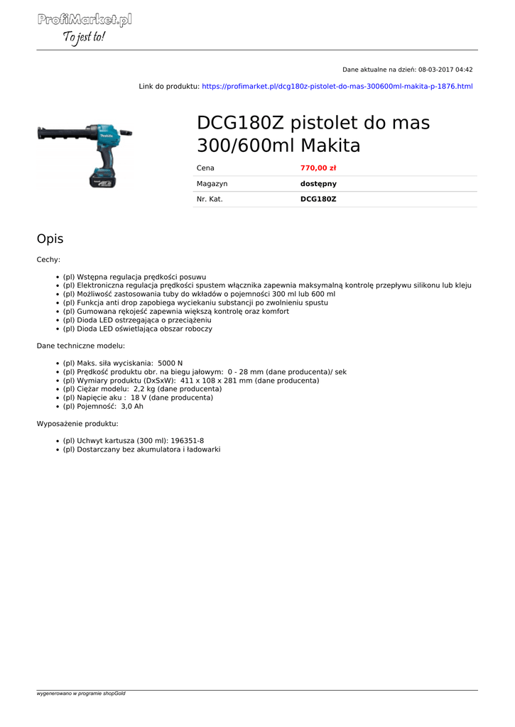 Dane aktualne na dzień: 08-03-2017 04:42 Link do produktu: https://profimarket.pl/dcg180z-pistolet-do-mas-300600ml-makita-p-1876.html DCG180Z pistolet do mas 300/600ml Makita Cena 770,00 zł Magazyn dostępny Nr. Kat. DCG180Z Opis Cechy: (pl) (pl) (pl) (pl) (pl) (pl) (pl) Wstępna regulacja prędkości posuwu Elektroniczna regulacja prędkości spustem włącznika zapewnia maksymalną kontrolę przepływu silikonu lub kleju Możliwość zastosowania tuby do wkładów o pojemności 300 ml lub 600 ml Funkcja anti drop zapobiega wyciekaniu substancji po zwolnieniu spustu Gumowana rękojeść zapewnia większą kontrolę oraz komfort Dioda LED ostrzegająca o przeciążeniu Dioda LED oświetlająca obszar roboczy Dane techniczne modelu: (pl) (pl) (pl) (pl) (pl) (pl) Maks. siła wyciskania: 5000 N Prędkość produktu obr. na biegu jałowym: 0 - 28 mm (dane producenta)/ sek Wymiary produktu (DxSxW): 411 x 108 x 281 mm (dane producenta) Ciężar modelu: 2,2 kg (dane producenta) Napięcie aku : 18 V (dane producenta) Pojemność: 3,0 Ah Wyposażenie produktu: (pl) Uchwyt kartusza (300 ml): 196351-8 (pl) Dostarczany bez akumulatora i ładowarki wygenerowano w programie shopGold Powered by TCPDF (www.tcpdf.org)