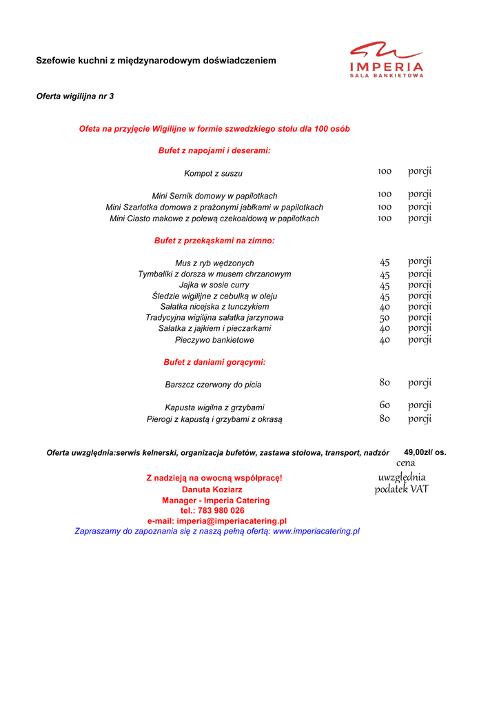 Szefowie kuchni z międzynarodowym doświadczeniem Oferta wigilijna nr 3 Ofeta na przyjęcie Wigilijne w formie szwedzkiego stołu dla 100 osób Bufet z napojami i deserami: Kompot z suszu 100 porcji Mini Sernik domowy w papilotkach Mini Szarlotka domowa z prażonymi jabłkami w papilotkach Mini Ciasto makowe z polewą czekoaldową w papilotkach 100 100 100 porcji porcji porcji 45 45 45 45 40 50 40 40 porcji porcji porcji porcji porcji porcji porcji porcji Barszcz czerwony do picia 80 porcji Kapusta wigilna z grzybami Pierogi z kapustą i grzybami z okrasą 60 80 porcji porcji Bufet z przekąskami na zimno: Mus z ryb wędzonych Tymbaliki z dorsza w musem chrzanowym Jajka w sosie curry Śledzie wigilijne z cebulką w oleju Sałatka nicejska z tunczykiem Tradycyjna wigilijna sałatka jarzynowa Sałatka z jajkiem i pieczarkami Pieczywo bankietowe Bufet z daniami gorącymi: Oferta uwzględnia:serwis kelnerski, organizacja bufetów, zastawa stołowa, transport, nadzór Z nadzieją na owocną współpracę! Danuta Koziarz Manager - Imperia Catering tel.: 783 980 026 e-mail: [email protected] Zapraszamy do zapoznania się z naszą pełną ofertą: www.imperiacatering.pl 49,00zł/ os. cena uwzględnia podatek VAT