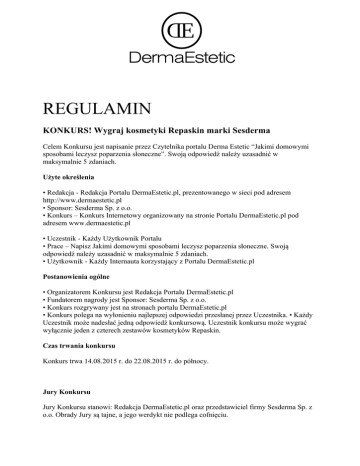 DermaEstetic REGULAMIN KONKURS! Wygraj kosmetyki Repaskin marki Sesderma Celem Konkursu jest napisanie przez Czytelnika portalu Derma Estetic “Jakimi domowymi sposobami leczysz poparzenia słoneczne”. Swoją odpowiedź należy uzasadnić w maksymalnie 5 zdaniach. Użyte określenia • Redakcja - Redakcja Portalu DermaEstetic.pl, prezentowanego w sieci pod adresem http://www.dermaestetic.pl • Sponsor: Sesderma Sp. z o.o. • Konkurs – Konkurs Internetowy organizowany na stronie Portalu DermaEstetic.pl pod adresem www.dermaestetic.pl • Uczestnik - Każdy Użytkownik Portalu • Prace – Napisz Jakimi domowymi sposobami leczysz poparzenia słoneczne. Swoją odpowiedź należy uzasadnić w maksymalnie 5 zdaniach. • Użytkownik - Każdy Internauta korzystający z Portalu DermaEstetic.pl Postanowienia ogólne • Organizatorem Konkursu jest Redakcja Portalu DermaEstetic.pl • Fundatorem nagrody jest Sponsor: Sesderma Sp. z o.o. • Konkurs rozgrywany jest na stronach portalu DermaEstetic.pl • Konkurs polega na wyłonieniu najlepszej odpowiedzi przesłanej przez Uczestnika. • Każdy Uczestnik może nadesłać jedną odpowiedź konkursową. Uczestnik konkursu może wygrać wyłącznie jeden z czterech zestawów kosmetyków Repaskin. Czas trwania konkursu Konkurs trwa 14.08.2015 r. do 22.08.2015 r. do północy. Jury Konkursu Jury Konkursu stanowi: Redakcja DermaEstetic.pl oraz przedstawiciel firmy Sesderma Sp. z o.o. Obrady Jury są tajne, a jego werdykt nie podlega cofnięciu. Nagrody Do wygrania są 4 zestawy kosmetyków Repaskin marki Sesderma. W skład każdego zestawu wchodzi: • Repaskin Żel post-solar 200 ml • Repaskin Fotoprotector SPF50 (do ciała) 200 ml Łączna cena zestawu: 233,50 zł Postanowienia końcowe • Redakcja zastrzega sobie w każdym czasie prawo do zmiany niniejszego Regulaminu bez podania przyczyny z zachowaniem praw nabytych Uczestników Konkursu. • Zwycięzca konkursu ma obowiązek przesłać adres do wysyłki w terminie do 7 dni. Jeżeli termin nie zostanie dotrzymany nagroda przepada i przechodzi w ręce innego Uczestnika konkursu. • Wysyłką nagród zajmuje się przedstawiciel firmy Sesderma Sp. z o.o. • Konkurs nie podlega przepisom Ustawy z dnia 29 lipca 1992 roku o grach i zakładach wzajemnych /Dz. U. z 2004 roku Nr 4, poz. 27 z późn. zm./