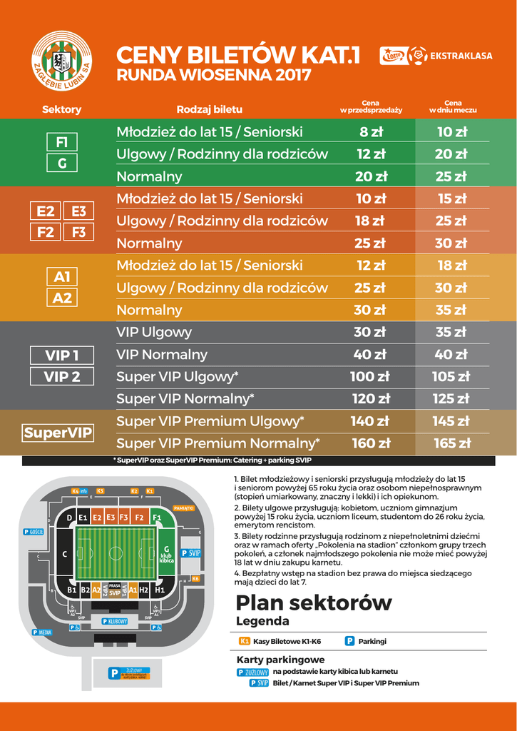 CENY BILETÓW KAT.1 RUNDA WIOSENNA 2017 Rodzaj biletu Cena w przedsprzedaży Cena w dniu meczu Młodzież do lat 15 / Seniorski 8 zł 10 zł Ulgowy / Rodzinny dla rodziców 12 zł 20 zł Normalny 20 zł 25 zł Młodzież do lat 15 / Seniorski 10 zł 15 zł Ulgowy / Rodzinny dla rodziców 18 zł 25 zł Normalny 25 zł 30 zł Młodzież do lat 15 / Seniorski 12 zł 18 zł Ulgowy / Rodzinny dla rodziców 25 zł 30 zł Normalny 30 zł 35 zł VIP Ulgowy 30 zł 35 zł VIP Normalny 40 zł 40 zł Super VIP Ulgowy* 100 zł 105 zł Super VIP Normalny* 120 zł 125 zł Super VIP Premium Ulgowy* 140 zł 145 zł Super VIP Premium Normalny* 160 zł 165 zł Sektory F1 G E2 F2 E3 F3 A1 A2 VIP 1 VIP 2 SuperVIP * SuperVIP oraz SuperVIP Premium: Catering + parking SVIP PAMIĄTKI 1. Bilet młodzieżowy i seniorski przysługują młodzieży do lat 15 i seniorom powyżej 65 roku życia oraz osobom niepełnosprawnym (stopień umiarkowany, znaczny i lekki) i ich opiekunom. 2. Bilety ulgowe przysługują: kobietom, uczniom gimnazjum powyżej 15 roku życia, uczniom liceum, studentom do 26 roku życia, emerytom rencistom. 3. Bilety rodzinne przysługują rodzinom z niepełnoletnimi dziećmi oraz w ramach oferty „Pokolenia na stadion” członkom grupy trzech pokoleń, a członek najmłodszego pokolenia nie może mieć powyżej 18 lat w dniu zakupu karnetu. 4. Bezpłatny wstęp na stadion bez prawa do miejsca siedzącego mają dzieci do lat 7. Plan sektorów Legenda Kasy Biletowe K1-K6 Parkingi Karty parkingowe ŻUŻLOWY dla kibiców posiadających: KARTĘ KIBICA / KARNET ŻUŻLOWY na podstawie karty kibica lub karnetu Bilet / Karnet Super VIP i Super VIP Premium