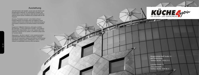 Ausstattung „Die Kraft steckt in der Qualität“, wusste schon der Dichter und DenkerFriedrich Nietzsche. Ein Höchstmaß an Qualität und Funktionalität ist auch das oberste Gebot bei der Komfortaus stattung unserer Küchen. Perfektion bis ins Detail heißt hier der Anspruch. Friedrich Nietzsche. De hoogste mate van kwaliteit en functi onaliteit is ook het eerste vereiste voor de comfortuitvoering van onze keukens. Perfectie tot in het kleinste detail is onze doelstel ling. Equipement. Pour Friedrich Nietzsche, philosophe et philolo gue allemand, « La force réside dans la qualité ». Une qualité et fonctionnalité irréprochables, c’est ce qui s’impose dans l’amé nagement convivial de nos cuisines. La perfection jusque dans les moindres détails. 82 – 83 Wyposażenie. „Siła tkwi w jakości“, o tym wiedział już poeta i myślicielFriedrich Nietzsche. Maksimum jakości i funkcjonal ności jest też najwyższym nakazem przy doborze komfortowego wyposażenia naszych kuchni. Perfekcjonizm nawet w najdrob niejszych szczegółach takie stawiamy sobie wymagania. Bürgermeister Neff Straße 19 68519 Viernheim Telefon: 06204 - 70 85 21 0 Lorscher Straße 16 68642 Bürstadt Telefon: 06206 - 9 88 48 21 Gut sortiert: Schubkästen Goed gesorteerd: schuifladen Bien pensé : les tiroirs Dobrze podzielone: szuflady 1 Schubkasten mit Holzfacheinteilungen (Buche) 2|5|8 Besteckeinsatz 3|6|9 Universal-Orga-Set 4|7|10Gewürz-Orga-Set 2|3|4 Ausführung Buche massiv 5|6|7 Ausführung Ahorn massiv 8|9|10Ausführung Nussbaum massiv 2 3 4 5 6 7 8 9 10 84 – 85 1 Laden met houten vakindelingen (beuken) 2|5|8 Bestekinzet 3|6|9 Universele organisatieset 4|7|10Organisatieset voor kruiden 2|3|4 Uitvoering massief berken 5|6|7 Uitvoering massief esdoorn 8|9|10Uitvoering massief noten 1Tiroir avec compartimentage en bois (hêtre) 2|5|8 Range-couverts 3|6|9 Kit d´organisation universel 4|7|10Kit d´organisation pour épices 2|3|4 Finition bouleau massif 5|6|7 Finition érable massif 8|9|10Finition noyer massif 1 Szuflada z drewnianym system organizacyjnym (buk) 2|5|8 Wkład na sztućce 3|6|9 Uniwersalny komplet organizacyjny 4|7|10Komplet organizacyjny na przyprawy 2|3|4 Wykonanie z litej brzozy 5|6|7 Wykonanie z litego klon 8|9|10Wykonanie z litego orzecha 1 Durchorganisiert: Innenorga in Kunststoff, Buche, Ahorn und Nussbaum Tot in de puntjes georganiseerd: uittrekbare delen in kunstof, esdoorn en notenhout Organisé: les coulissants en mélamine, hêtre, érable et noyer foncé Przemyślane: wyposażenie z tworzywa sztucznego, drewna bukowego klon i orzechowego 86 – 87 1 Integrierte Auszüge. 2Kombination aus integriertem Schubkasten und herkömmlichem Auszug für optimale Übersichtlichkeit. Unten flexibel verstellbare Facheinteilungen. 3Auszüge mit Facheinteilungen aus massivem Nussbaum. 4Oben feste Facheinteilungen, unten flexibel einstellbare Zwischeneinteilungen aus Ahorn- bzw. Buche Massivholz. 2 3 4 4 1 Geïntegreerde uittrekbare delen. 2Combinatie van een geïntegreerd uittrekbaar deel en een tradi tioneel uittrekbaar deel voor optimale overzichtelijkheid. Onder: flexibel verstelbare vakindelingen. 3 Uittrekbare delen met vakindelingen van massief notenhout. 4Boven: vaste vakindelingen, onder: flexibel instelbare tussenindelingen van esdoorn resp. beuken massief hout. 1 Coulissants intérieurs. 2Combinaison de tiroir intérieur et de coulissants traditionnels pour un meilleur aperçu du contenu. En bas, des éléments de répartition variables. 3 Coulissant avec séparateurs en noisetier massif. 4En haut, répartition fixe des compartiments, en bas é léments variables de répartition en érable ou hêtre bois massif. 1 Zintegrowane szuflady głębokie 2Zintegrowane i normalne szuflady głębokie to optymalny wgląd w zawartość. 3 Szuflady głębokie z ruchomymi podziałami z drewna orzechowego. 4Na górze stałe, na dole ruchome podziały z klon/buku m asywnego drewna. 1 Durchgeplant: das Spül- und Kochzentrum Tot in detail gepland: het spoel- en kookcentrum Mûrement réfléchi : le coin eau et cuisson Zaplanowane w najdrobniejszych szczegółach: stanowisko do zmywania i gotowania Von A bis Z durchgeplant ist das Spül- und Kochzentrum: Designarmaturen, flächenbündig eingelassene Spülbecken und Cerankochfelder glänzen hier im Alltag. Het spoel- en kookcentrum is tot in het kleinste detail gepland: designkranen, op één lijn met het werkblad afsluitende spoelbakken en keramische kookplaten vervullen een glansrol in de keuken. Zaplanowane od A do Z stanowisko do zmywania i gotowania: armatura o specjalnym wzornictwie i wpuszczany zlewozmywak zabudowany w jednej płaszczyźnie z blatem i ceramiczna płyta do gotowania olśniewają na codzień. 88 – 89 Le coin eau et cuisson a été minutieusement aménagé : les robinetteries design et les éviers et plans de cuisson en vitrocéramique montés à fleur du plan de travail reluisent dans la vie de tous les jours. Nützlich: Optik und Funktion im Einklang Handig: uiterlijk en functie in harmonie Utile : esthétique et fonctionnalité en harmonie 90 – 91 Praktyczne: harmonia wyglądu i funkcjonalności 1 2 3 Elegante, robuste und pflegeleichte Arbeitsplatte in Edelstahl. Hoch eingebaute Elektrogeräte erleichtern die tägliche Küchenarbeit. Raffiniert geplanter Spülen- und Kochbereich, verbunden durch eine flache Unterschrankkonstruktion. Geeignet als Abstell- oder Sitz- fläche. 1 2 3 Elegant, robuust en makkelijk te onderhouden werkblad van roestvrij staal. Hoog ingebouwde elektrische apparaten vergemakkelijken het dagelijkse werk in de keuken. Geraffineerd gepland spoel- en kookgedeelte, verbonden door een platte onderkastconstructie. Geschikt als aflegruimte of zitvlak. 1 2 3 Plan de travail en inox, élégant, solide et facile d’entretien. Les appareils électroménagers intégrés en hauteur facilitent le travail quotidien dans la cuisine. Coins eau et cuisson ingénieux, reliés par un ensemble d‘éléments bas
