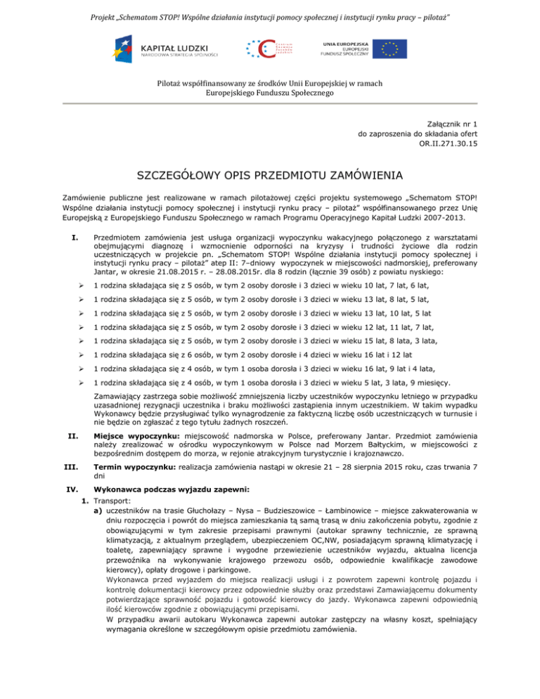 Projekt „Schematom STOP! Wspólne działania instytucji pomocy społecznej i instytucji rynku pracy – pilotaż” Pilotaż współfinansowany ze środków Unii Europejskiej w ramach Europejskiego Funduszu Społecznego Załącznik nr 1 do zaproszenia do składania ofert OR.II.271.30.15 SZCZEGÓŁOWY OPIS PRZEDMIOTU ZAMÓWIENIA Zamówienie publiczne jest realizowane w ramach pilotażowej części projektu systemowego „Schematom STOP! Wspólne działania instytucji pomocy społecznej i instytucji rynku pracy – pilotaż” współfinansowanego przez Unię Europejską z Europejskiego Funduszu Społecznego w ramach Programu Operacyjnego Kapitał Ludzki 2007-2013. I. Przedmiotem zamówienia jest usługa organizacji wypoczynku wakacyjnego połączonego z warsztatami obejmującymi diagnozę i wzmocnienie odporności na kryzysy i trudności życiowe dla rodzin uczestniczących w projekcie pn. „Schematom STOP! Wspólne działania instytucji pomocy społecznej i instytucji rynku pracy – pilotaż” atep II: 7–dniowy wypoczynek w miejscowości nadmorskiej, preferowany Jantar, w okresie 21.08.2015 r. – 28.08.2015r. dla 8 rodzin (łącznie 39 osób) z powiatu nyskiego: 1 rodzina składająca się z 5 osób, w tym 2 osoby dorosłe i 3 dzieci w wieku 10 lat, 7 lat, 6 lat, 1 rodzina składająca się z 5 osób, w tym 2 osoby dorosłe i 3 dzieci w wieku 13 lat, 8 lat, 5 lat, 1 rodzina składająca się z 5 osób, w tym 2 osoby dorosłe i 3 dzieci w wieku 13 lat, 10 lat, 5 lat 1 rodzina składająca się z 5 osób, w tym 2 osoby dorosłe i 3 dzieci w wieku 12 lat, 11 lat, 7 lat, 1 rodzina składająca się z 5 osób, w tym 2 osoby dorosłe i 3 dzieci w wieku 15 lat, 8 lata, 3 lata, 1 rodzina składająca się z 6 osób, w tym 2 osoby dorosłe i 4 dzieci w wieku 16 lat i 12 lat 1 rodzina składająca się z 4 osób, w tym 1 osoba dorosła i 3 dzieci w wieku 16 lat, 9 lat i 4 lata, 1 rodzina składająca się z 4 osób, w tym 1 osoba dorosła i 3 dzieci w wieku 5 lat, 3 lata, 9 miesięcy. Zamawiający zastrzega sobie możliwość zmniejszenia liczby uczestników wypoczynku letniego w przypadku uzasadnionej rezygnacji uczestnika i braku możliwości zastąpienia innym uczestnikiem. W takim wypadku Wykonawcy będzie przysługiwać tylko wynagrodzenie za faktyczną liczbę osób uczestniczących w turnusie i nie będzie on zgłaszać z tego tytułu żadnych roszczeń. II. Miejsce wypoczynku: miejscowość nadmorska w Polsce, preferowany Jantar. Przedmiot zamówienia należy zrealizować w ośrodku wypoczynkowym w Polsce nad Morzem Bałtyckim, w miejscowości z bezpośrednim dostępem do morza, w rejonie atrakcyjnym turystycznie i krajoznawczo. III. Termin wypoczynku: realizacja zamówienia nastąpi w okresie 21 – 28 sierpnia 2015 roku, czas trwania 7 dni IV. Wykonawca podczas wyjazdu zapewni: 1. Transport: a) uczestników na trasie Głuchołazy – Nysa – Budzieszowice – Łambinowice – miejsce zakwaterowania w dniu rozpoczęcia i powrót do miejsca zamieszkania tą samą trasą w dniu zakończenia pobytu, zgodnie z obowiązującymi w tym zakresie przepisami prawnymi (autokar sprawny technicznie, ze sprawną klimatyzacją, z aktualnym przeglądem, ubezpieczeniem OC,NW, posiadającym sprawną klimatyzację i toaletę, zapewniający sprawne i wygodne przewiezienie uczestników wyjazdu, aktualna licencja przewoźnika na wykonywanie krajowego przewozu osób, odpowiednie kwalifikacje zawodowe kierowcy), opłaty drogowe i parkingowe. Wykonawca przed wyjazdem do miejsca realizacji usługi i z powrotem zapewni kontrolę pojazdu i kontrolę dokumentacji kierowcy przez odpowiednie służby oraz przedstawi Zamawiającemu dokumenty potwierdzające sprawność pojazdu i gotowość kierowcy do jazdy. Wykonawca zapewni odpowiednią ilość kierowców zgodnie z obowiązującymi przepisami. W przypadku awarii autokaru Wykonawca zapewni autokar zastępczy na własny koszt, spełniający wymagania określone w szczegółowym opisie przedmiotu zamówienia. Projekt „Schematom STOP! Wspólne działania instytucji pomocy społecznej i instytucji rynku pracy – pilotaż” Pilotaż współfinansowany ze środków Unii Europejskiej w ramach Europejskiego Funduszu Społecznego b) Transport na potrzeby organizowanego wyjazdu oraz innych planowanych działań na miejscu pobytu. c) Do grupy podczas transportu nie może być dołączona inna grupa. 2. Kierownika wypoczynku, który zapewni opiekę organizacyjną, będzie się zajmował uczestnikami od momentu wyjazdu grupy z terenu powiatu nyskiego do momentu powrotu. Nie dopuszcza się łączenia funkcji kierownika wypoczynku i kadry dydaktycznej. Wynagrodzenie kierownika oraz kadry dydaktycznej należy do obowiązków Wykonawcy i jest wliczone ogólny koszt wyjazdu. 3. Zakwaterowanie dla uczestników wyjazdu w jednym budynku / pawilonie / zespole budynków bezpośrednio ze sobą sąsiadujących o charakterze stałym, w pokojach z pełnym węzłem sanitarnym (tj. WC, łazienka z prysznicem lub wanną, umywalką), dla rodzin 5-cio i 6-cio osobowych w przypadku braku odpowiednich pokoi ze względu na dużą ilość osób: dwa pokoje na rodzinę sąsiadujące ze sobą, ewentualnie apartament / domek mieszczący całą rodzinę. Dla jednej rodziny 4 osobowej z 9-cio miesięcznym dzieckiem Zamawiający wymaga pokoju z kojcem lub łóżeczkiem dla dziecka albo dużym łóżkiem, tak aby matka mogła wygodnie spać razem z dzieckiem. Wykonawca zapewni pobyt w ośrodku wypoczynkowym spełniającym wymogi dotyczące bezpieczeństwa, ochrony przeciwpożarowej, warunków higieniczno – sanitarnych oraz ochrony środowiska określonych przepisami o ochronie przeciwpożarowej, Państwowej Inspekcji Sanitarnej i ochronie środowiska. 4. Całodzienne wyżywienie: Składające się z trzech posiłków (śniadanie, dwudaniowy obiad z deserem, np. ciasto, owoce lub deser lodowy, kolacja) z wyjątkiem pierwszego dnia kiedy Wykonawca zapewni obiad + deser oraz kolację i ostatniego dn