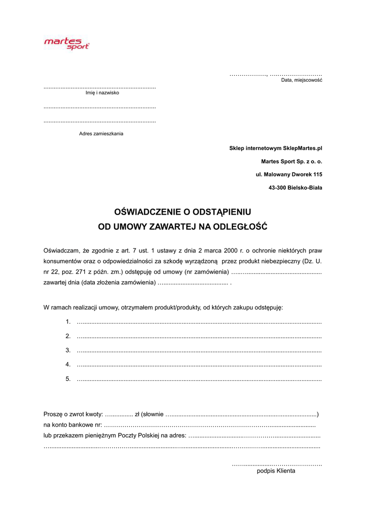 ………………, ….…………………. Data, miejscowość .................................................................. Imię i nazwisko .................................................................. .................................................................. Adres zamieszkania Sklep internetowym SklepMartes.pl Martes Sport Sp. z o. o. ul. Malowany Dworek 115 43-300 Bielsko-Biała OŚWIADCZENIE O ODSTĄPIENIU OD UMOWY ZAWARTEJ NA ODLEGŁOŚĆ Oświadczam, że zgodnie z art. 7 ust. 1 ustawy z dnia 2 marca 2000 r. o ochronie niektórych praw konsumentów oraz o odpowiedzialności za szkodę wyrządzoną przez produkt niebezpieczny (Dz. U. nr 22, poz. 271 z późn. zm.) odstępuję od umowy (nr zamówienia) …..…............................................ zawartej dnia (data złożenia zamówienia) …...................................... . W ramach realizacji umowy, otrzymałem produkt/produkty, od których zakupu odstępuję: 1. …............................................................................................................................................ 2. …............................................................................................................................................ 3. …............................................................................................................................................ 4. …............................................................................................................................................ 5. …............................................................................................................................................ Proszę o zwrot kwoty: …............. zł (słownie ….....................................................................................) na konto bankowe nr: ………………………………………………………………………........................... lub przekazem pieniężnym Poczty Polskiej na adres: ….............................……………........................... ….............................……………...........................….............................…………….................................. ……................……………………. podpis Klienta
