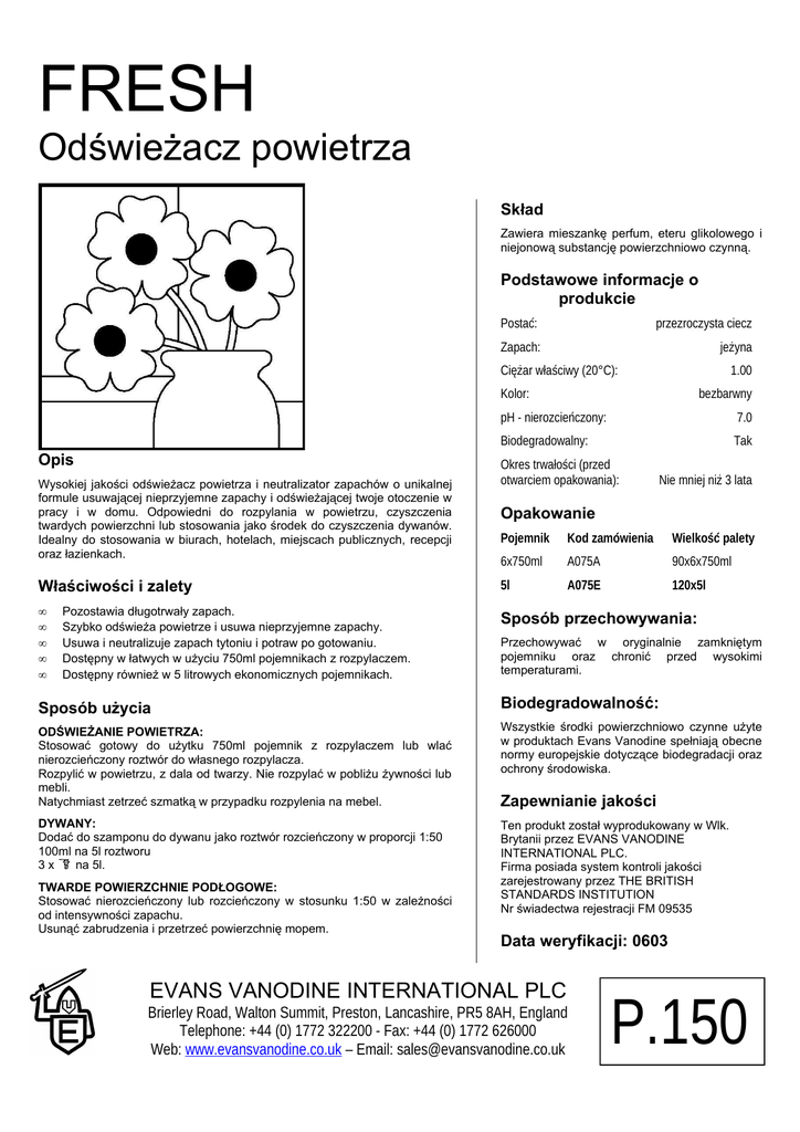 FRESH Odświeżacz powietrza Skład Zawiera mieszankę perfum, eteru glikolowego i niejonową substancję powierzchniowo czynną. Podstawowe informacje o produkcie Postać: przezroczysta ciecz Zapach: jeżyna Ciężar właściwy (20°C): 1.00 Kolor: Opis Wysokiej jakości odświeżacz powietrza i neutralizator zapachów o unikalnej formule usuwającej nieprzyjemne zapachy i odświeżającej twoje otoczenie w pracy i w domu. Odpowiedni do rozpylania w powietrzu, czyszczenia twardych powierzchni lub stosowania jako środek do czyszczenia dywanów. Idealny do stosowania w biurach, hotelach, miejscach publicznych, recepcji oraz łazienkach. Właściwości i zalety • • • • • Pozostawia długotrwały zapach. Szybko odświeża powietrze i usuwa nieprzyjemne zapachy. Usuwa i neutralizuje zapach tytoniu i potraw po gotowaniu. Dostępny w łatwych w użyciu 750ml pojemnikach z rozpylaczem. Dostępny również w 5 litrowych ekonomicznych pojemnikach. bezbarwny pH - nierozcieńczony: 7.0 Biodegradowalny: Tak Okres trwałości (przed otwarciem opakowania): Nie mniej niż 3 lata Opakowanie Pojemnik Kod zamówienia Wielkość palety 6x750ml A075A 90x6x750ml 5l A075E 120x5l Sposób przechowywania: Przechowywać w oryginalnie zamkniętym pojemniku oraz chronić przed wysokimi temperaturami. Sposób użycia Biodegradowalność: ODŚWIEŻANIE POWIETRZA: Stosować gotowy do użytku 750ml pojemnik z rozpylaczem lub wlać nierozcieńczony roztwór do własnego rozpylacza. Rozpylić w powietrzu, z dala od twarzy. Nie rozpylać w pobliżu żywności lub mebli. Natychmiast zetrzeć szmatką w przypadku rozpylenia na mebel. Wszystkie środki powierzchniowo czynne użyte w produktach Evans Vanodine spełniają obecne normy europejskie dotyczące biodegradacji oraz ochrony środowiska. DYWANY: Dodać do szamponu do dywanu jako roztwór rozcieńczony w proporcji 1:50 100ml na 5l roztworu 3x na 5l. Ten produkt został wyprodukowany w Wlk. Brytanii przez EVANS VANODINE INTERNATIONAL PLC. Firma posiada system kontroli jakości zarejestrowany przez THE BRITISH STANDARDS INSTITUTION Nr świadectwa rejestracji FM 09535 TWARDE POWIERZCHNIE PODŁOGOWE: Stosować nierozcieńczony lub rozcieńczony w stosunku 1:50 w zależności od intensywności zapachu. Usunąć zabrudzenia i przetrzeć powierzchnię mopem. Zapewnianie jakości Data weryfikacji: 0603 EVANS VANODINE INTERNATIONAL PLC Brierley Road, Walton Summit, Preston, Lancashire, PR5 8AH, England Telephone: +44 (0) 1772 322200 - Fax: +44 (0) 1772 626000 Web: www.evansvanodine.co.uk – Email: [email protected] P.150 EVANS VANODINE INTERNATIONAL PLC Brierley Road, Walton Summit, Preston, Lancashire, PR5 8AH, England Telephone: +44 (0) 1772 322200 - Fax: +44 (0) 1772 626000 Web: www.evansvanodine.co.uk – Email: [email protected] P.150