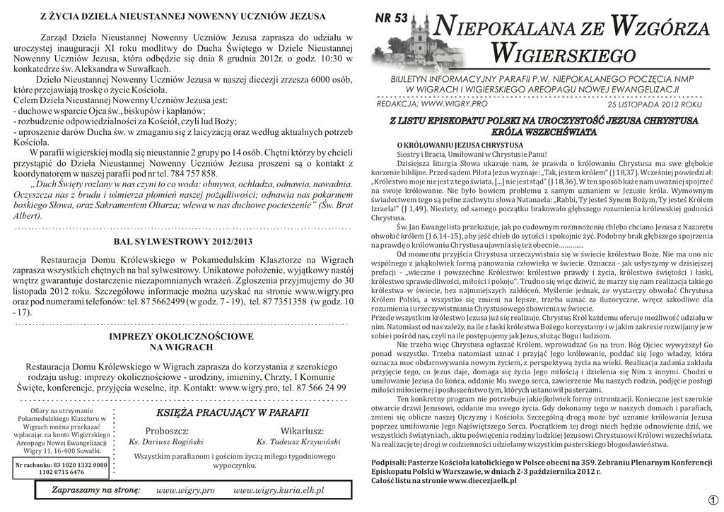 Z ŻYCIA DZIEŁA NIEUSTANNEJ NOWENNY UCZNIÓW JEZUSA Zarząd Dzieła Nieustannej Nowenny Uczniów Jezusa zaprasza do udziału w uroczystej inauguracji XI roku modlitwy do Ducha Świętego w Dziele Nieustannej Nowenny Uczniów Jezusa, która odbędzie się dnia 8 grudnia 2012r. o godz. 10:30 w konkatedrze św. Aleksandra w Suwałkach. Dzieło Nieustannej Nowenny Uczniów Jezusa w naszej diecezji zrzesza 6000 osób, które przejawiają troskę o życie Kościoła. Celem Dzieła Nieustannej Nowenny Uczniów Jezusa jest: - duchowe wsparcie Ojca św., biskupów i kapłanów; - rozbudzenie odpowiedzialności za Kościół, czyli lud Boży; - uproszenie darów Ducha św. w zmaganiu się z laicyzacją oraz według aktualnych potrzeb Kościoła. W parafii wigierskiej modlą się nieustannie 2 grupy po 14 osób. Chętni którzy by chcieli przystąpić do Dzieła Nieustannej Nowenny Uczniów Jezusa proszeni są o kontakt z koordynatorem w naszej parafii pod nr tel. 784 757 858. „Duch Święty rozlany w nas czyni to co woda: obmywa, ochładza, odnawia, nawadnia. Oczyszcza nas z brudu i uśmierza płomień naszej pożądliwości; odnawia nas pokarmem boskiego Słowa, oraz Sakramentem Ołtarza; wlewa w nas duchowe pocieszenie” (Św. Brat Albert). BAL SYLWESTROWY 2012/2013 Restauracja Domu Królewskiego w Pokamedulskim Klasztorze na Wigrach zaprasza wszystkich chętnych na bal sylwestrowy. Unikatowe położenie, wyjątkowy nastój wnętrz gwarantuje dostarczenie niezapomnianych wrażeń. Zgłoszenia przyjmujemy do 30 listopada 2012 roku. Szczegółowe informacje można uzyskać na stronie www.wigry.pro oraz pod numerami telefonów: tel. 87 5662499 (w godz. 7 - 19), tel. 87 7351358 (w godz. 10 - 17). IMPREZY OKOLICZNOŚCIOWE NA WIGRACH Restauracja Domu Królewskiego w Wigrach zaprasza do korzystania z szerokiego rodzaju usług: imprezy okolicznościowe - urodziny, imieniny, Chrzty, I Komunie Święte, konferencje, przyjęcia weselne, itp. Kontakt: www.wigry.pro, tel. 87 566 24 99 Ofiarynautrzymanie PokamedulskiegoKlasztoruw Wigrachmoż naprzekazać wpłacającnakontoWigierskiego AreopaguNowejEwangelizacji Wigry11,16-400Suwałki. Nrrachunku:83102013320000 110207156476 KSIĘŻA PRACUJĄCY W PARAFII Proboszcz:Wikariusz: Ks. Dariusz Rogiński Ks. Tadeusz Krzywiński Wszystkimparafianomigoś ciomż ycząmiłegotygodniowego wypoczynku. Zapraszamy na stronę: www.wigry.pro NR 53 NIEPOKALANA ZE WZGÓRZA WIGIERSKIEGO BIULETYN INFORMACYJNY PARAFII P.W. NIEPOKALANEGO POCZĘCIA NMP W WIGRACH I WIGIERSKIEGO AREOPAGU NOWEJ EWANGELIZACJI REDAKCJA: WWW.WIGRY.PRO 25 LISTOPADA 2012 ROKU Z LISTU EPISKOPATU POLSKI NA UROCZYSTOŚĆ JEZUSA CHRYSTUSA KRÓLA WSZECHŚWIATA OKRÓLOWANIUJEZUSACHRYSTUSA SiostryiBracia,UmiłowaniwChrystusiePanu! Dzisiejsza liturgia Słowa ukazuje nam, ż e prawda o kró lowaniu Chrystusa ma swe głębokie korzeniebiblijne.PrzedsądemPiłataJezuswyznaje:„Tak,jestemkró lem"(J18,37).Wcześ niejpowiedział: „Kró lestwomojeniejestztegoś wiata,[...]niejeststąd"(J18,36).Wtensposó bkaż enamuważ niejspojrzeć na swoje kró lowanie. Nie było bowiem problemu z samym uznaniem w Jezusie kró la. Wymownym ś wiadectwemtegosąpełnezachwytusłowaNatanaela:„Rabbi,Tyjesteś SynemBoż ym,Tyjesteś Kró lem Izraela!"(J1,49).Niestety,odsamegopoczątkubrakowałogłębszegorozumieniakró lewskiejgodnoś ci Chrystusa. Sw.JanEwangelistaprzekazuje,jakpocudownymrozmnoż eniuchlebachcianoJezusazNazaretu obwołać kró lem(J6,14-15),abyjeś ćchlebdosytoś ciispokojnież yć .Podobnybrakgłębszegospojrzenia naprawdęokró lowaniuChrystusaujawniasięteż obecnie…………. Odmomentuprzyjś ciaChrystusaurzeczywistniasięwś wieciekró lestwoBoż e.Niemaononic wspó lnegozjakąkolwiekformąpanowaniaczłowiekawś wiecie.Oznacza-jakusłyszymywdzisiejszej prefacji - „wieczne i powszechne Kró lestwo: kró lestwo prawdy i ż ycia, kró lestwo ś więtoś ci i łaski, kró lestwosprawiedliwoś ci,miłoś ciipokoju".Trudnosięwięcdziwić ,ż emarzysięnamrealizacjatakiego kró lestwa w ś wiecie, bez najmniejszych zakłó ceń . Myś lenie jednak, ż e wystarczy obwołać Chrystusa Kró lem Polski, a wszystko się zmieni na lepsze, trzeba uznać za iluzoryczne, wręcz szkodliwe dla rozumieniaiurzeczywistnianiaChrystusowegozbawieniawś wiecie. Przedewszystkimkró lestwoJezusajuż sięrealizuje.ChrystusKró lkaż demuoferujemoż liwoś ćudziałuw nim.Natomiastodnaszależ y,nailezłaskikró lestwaBoż egokorzystamyiwjakimzakresierozwijamyjew sobieipoś ró dnas,czylinailepostępujemyjakJezus,służ ącBoguiludziom. NietrzebawięcChrystusaogłaszać Kró lem,wprowadzać Gonatron.Bó gOjciecwywyż szyłGo ponad wszystko. Trzeba natomiast uznać i przyjąć Jego kró lowanie, poddać się Jego władzy, któ ra oznaczamocobdarowywanianowymż yciem,zperspektywąż ycianawieki.Realizacjazadaniazakłada przyjęcie tego, co Jezus daje, domaga się ż ycia Jego miłoś cią i dzielenia się Nim z innymi. Chodzi o umiłowanieJezusadokoń ca,oddanieMuswegoserca,zawierzenieMunaszychrodzin,podjęcieposługi miłoś cimiłosiernejiposłuszeń stwotym,któ rychustanowiłpasterzami. Tenkonkretnyprogramniepotrzebujejakiejkolwiekformyintronizacji.Koniecznejestszerokie otwarciedrzwiJezusowi,oddaniemuswegoż ycia.Gdydokonamytegownaszychdomachiparafiach, zmieni się oblicze naszej Ojczyzny i Koś cioła. Szczegó lną drogą moż e być uznanie kró lowania Jezusa poprzezumiłowanieJegoNajś więtszegoSerca.Początkiemtejdroginiechbędzieodnowieniedziś ,we wszystkichś wiątyniach,aktupoś więceniarodzinyludzkiejJezusowiChrystusowiKró lowiwszechś wiata. Narealizacjętejdrogiwcodziennoś ciudzielamywszystkimpasterskiegobłogosławień stwa. Podpisali:PasterzeKościołakatolickiegowPolsceobecnina359.ZebraniuPlenarnymKonferencji EpiskopatuPolskiwWarszawie,wdniach2-3października2012r. Całośćlistunastroniewww.diecezjaelk.pl www.wigry.kuria.elk.pl 1 KALENDARIUM LITURGICZNE 25.11. – Niedziela Uroczystość Jezusa Chrystusa, Króla