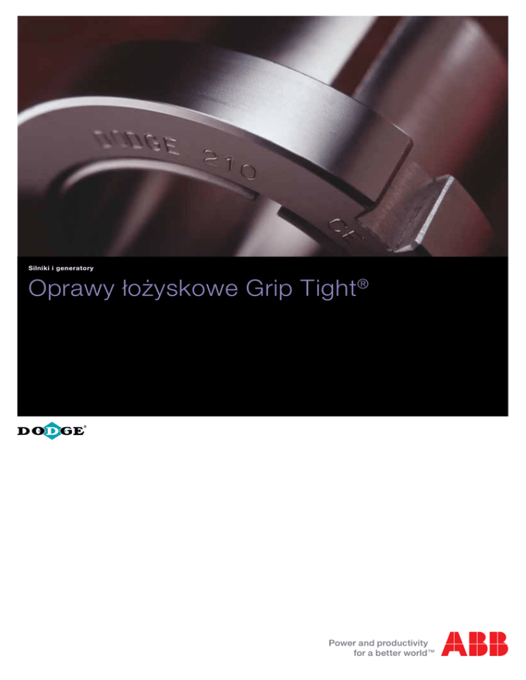 Silniki i generatory Oprawy łożyskowe Grip Tight® Dostarczamy silniki, generatory i elementy mechanicznego przeniesienia napędu, a także usługi i specjalistyczną wiedzę niezbędne do zaoszczędzenia energii i poprawy procesów u klientów w trakcie całego okresu eksploatacji produktów ABB. 2 Oprawy łożyskowe Grip Tight Jeżeli uwzględnimy wszystkie korzyści, to po co szukać czegoś innego? Dodge® z dumą prezentuje zupełnie zmienione oprawy łożyskowe z adapterem Grip Tight®. Dzięki opatentowanemu systemowi adaptera, w pełni koncentrycznemu pierścieniowi wewnętrznemu oraz całkowicie wymienialnej konstrukcji obudowy, nowe łożyska kulkowe z adapterem Grip Tight są łatwym do montażu i demontażu, nie niszczącym wału rozwiązaniem, pozwalającym na bezusterkową pracę, ograniczenie wibracji i zmniejszenie kosztów eksploatacji. Łożyska Dodge zostały specjalnie zaprojektowane pod kątem pracy przy większych prędkościach obrotowych i mniejszym nagrzewaniu się, pozwalając na wydłużenie żywotności smaru. W badaniach porównawczych udowodniono, że oprawy Dodge z adapterem Grip Tight mogą ograniczyć korozję oraz zarysowania czopów wałów, co pozwala nie tylko na zaoszczędzenie czasu, ale również na ograniczenie dodatkowych kosztów związanych z konserwacją. Oprawy z adapterem Grip Tight, produkowane w wielu wariantach obudów, przystosowane do pracy przy normalnym i średnim obciążeniu, są gotowe do instalacji bezpośrednio po dostawie. Wszystkie zespoły łożyskowe z adapterem Grip Tight pasują do standardowych obudów łożysk kulkowych Dodge. Oprawy łożyskowe Grip Tight 3 Nowatorskie rozwiązania opraw łożyskowych z adapterem Grip Tight®, pozwalające na zmniejszenie całkowitych kosztów eksploatacji Pełna styczność z wałem pozwalająca na pewniejsze zamocowanie i zmniejszenie wibracji Mechanizm blokujący, oparty na wkrętach ustalających, może uszkodzić wewnętrzny pierścień i wywołać wibracje. W przypadku opraw z systemem Grip Tight, adapter w pełni styka się z wałem w sposób koncentryczny, w zakresie 360º, na całej długości łożyska. Podwójne uszczelnienie Dodge Podwójne uszczelnienie z gumowanymi odrzutnikami, łączące uszczelnienie pierścienia wewnętrznego i uszczelnienie labiryntowe, zapobiega wyciekowi smaru oraz przedostawaniu się zanieczyszczeń do wewnątrz. Numery patentowe: 6 939 053 i 7 305 767. 1) Niemetaliczny koszyk zapewnia dodatkowe wzmocnienie. 2) Wysokiej klasy kulki łożyskowe zapewniają cichą pracę. 3) Pierścień wewnętrzny z warstwą nawęgloną zapewnia większą odporność na zużycie i dłuższy okres użytkowania. 4) Podwójne uszczelnienie z nitrylowymi uszczelkami odrzutników zapobiega wyciekom smaru i przedostawaniu się zanieczyszczeń do wewnątrz. 1 2 3 4 5 6 4 Oprawy łożyskowe Grip Tight 5) Zespół nakrętka – pierścień wewnętrzny pełni funkcję ściągacza, ułatwiając demontaż. 6) Wytrzymała obudowa, pozwalająca na łatwe zamocowanie i dopasowanie. − − Dostępne dla wałów o średnicach 17 mm ÷ 85 mm do zastosowania przy normalnym i średnim obciążeniu. − − Przystosowane do pracy przy wyższych prędkościach obrotowych. − − Samonastawne. − − Mniejsze nagrzewanie się obudowy pozwala na wydłużenie okresu stosowania smaru. − − Przystosowane do użycia przy standardowych tolerancjach wykonania wału. Rodzina produktów Grip Tight Prosto z magazynu i gotowe do montażu oprawy łożyskowe Dodge z adapterem Grip Tight do pracy przy normalnym i podwyższonym obciążeniu są oferowane w różnych odmianach, w tym między innymi jako łożyska w standardowej oprawie stojącej, dwu-, trzy- lub czterośrubowej oprawie z kołnierzem, oprawie z kołnierzem środkującym, oprawie nastawnej oraz łożyska w odmianie E-Z Kleen. Ten wszechstronny asortyment pozwoli Państwu na wybranie odpowiedniego rozwiązania z adapterem Grip Tight, dostosowanego do Państwa potrzeb. Typowe zużycie cierno-korozyjne i uszkodzenie wału w przypadku oprawy z wkrętami ustalajacymi. Brak zużycia cierno-korozyjnego czy uszkodzeń wału w przypadku zespołu łożyska z adapterem Grip Tight. Bezusterkowa praca Nowe oprawy łożyskowe Dodge z adapterem Grip Tight posiadają unikatową konstrukcję mocowania adaptera, która została specjalnie opracowana pod kątem odporności na działanie sił osiowych, powstałych podczas montażu czy demontażu. Adapter zapewnia stabilne zamocowanie oraz ogranicza uszkodzenia związane z korozją wżerową. Wyniki badań W badaniach porównawczych wykazano, że mocowanie za pomocą wkrętów ustalających sprzyja powstawaniu uszkodzeń cierno-korozyjnych. Nowe rozwiązanie z adapterem Grip Tight pozwala na łatwy demontaż oprawy z wału oraz eliminuje występowanie korozji wżerowej na jego powierzchni. Dzięki temu rozwiązaniu nie ma potrzeby regenerowania wałów, co oszczędza czas i ogranicza koszty związane z konserwacją. Oprawy łożyskowe Grip Tight 5 Nowatorskie rozwiązania Grip Tight, pozwalające na zmniejszenie całkowitych kosztów eksploatacji Łatwy montaż i demontaż Podobnie jak Dodge ISN, oprawy z łożyskami kulkowymi i adapterem Grip Tight są gotowe do użytku tuż po dostawie. Można je szybko zamocować lub zdemontować, ponieważ nie wymagają składania, a do ich instalacji nie są potrzebne żadne specjalne narzędzia. Podczas montażu, zgłoszony do opatentowania system nakrętka/pierścień wewnętrzny, blokuje zwężającą się tuleję adaptera pod łożyskiem oraz na wale. W celu demontażu, wbudowany ściągacz ściąga łożysko z adaptera, popychając adapter w przeciwnym kierunku (na zewnątrz spod łożyska). 6 Oprawy łożyskowe Grip Tight Dzięki konstrukcji pozwalającej na łatwy montaż i demontaż, adapter Grip Tight pozwoli Państwu na zaoszczędzenie czasu i pieniędzy! Dzięki konstrukcji pozwalającej na łatwy montaż i demontaż, adapter Grip Tight pozwoli Państwu 