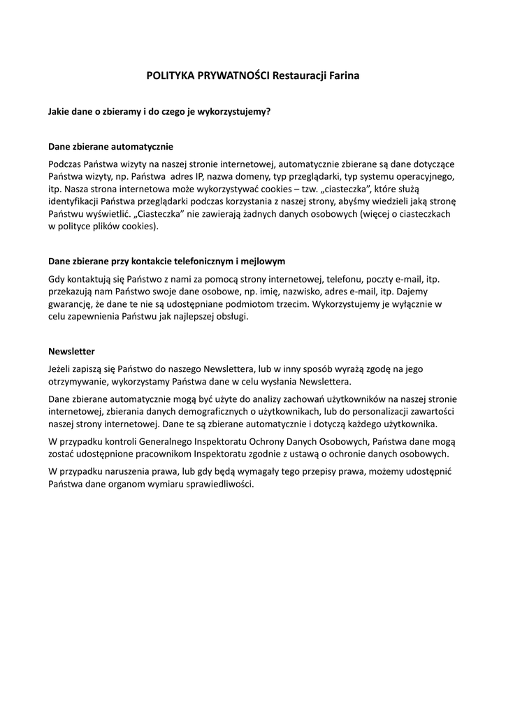 POLITYKA PRYWATNOŚCI Restauracji Farina