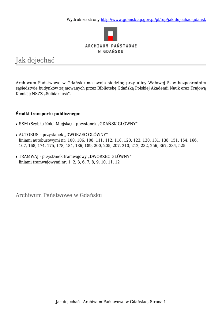 Wydruk ze strony http://www.gdansk.ap.gov.pl/pl/top/jak-dojechac-gdansk Jak dojechać Archiwum Państwowe w Gdańsku ma swoją siedzibę przy ulicy Wałowej 5, w bezpośrednim sąsiedztwie budynków zajmowanych przez Bibliotekę Gdańską Polskiej Akademii Nauk oraz Krajową Komisję NSZZ „Solidarność”. Środki transportu publicznego: ● ● ● SKM (Szybka Kolej Miejska) – przystanek „GDAŃSK GŁÓWNY” AUTOBUS – przystanek „DWORZEC GŁÓWNY” liniami autobusowymi nr: 100, 106, 108, 111, 112, 118, 120, 123, 130, 131, 138, 151, 154, 166, 167, 168, 174, 175, 178, 184, 186, 189, 200, 205, 207, 210, 212, 232, 256, 367, 384, 525 TRAMWAJ - przystanek tramwajowy „DWORZEC GŁÓWNY” liniami tramwajowymi nr: 1, 2, 3, 6, 7, 8, 9, 10, 11, 12 Archiwum Państwowe w Gdańsku Jak dojechać - Archiwum Państwowe w Gdańsku , Strona 1