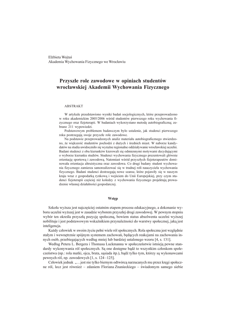 137 El¿bieta Wojta Akademia Wychowania Fizycznego we Wroc³awiu Przysz³e role zawodowe w opiniach studentów wroc³awskiej Akademii Wychowania Fizycznego ABSTRAKT W artykule przedstawiono wyniki badañ socjologicznych, które przeprowadzono w roku akademickim 2005/2006 wród studentów pierwszego roku wychowania fizycznego oraz fizjoterapii. W badaniach wykorzystano metodê autobiograficzn¹; zebrano 211 wypowiedzi. Podstawowym problemem badawczym by³o ustalenie, jak studenci pierwszego roku postrzegaj¹ swoje przysz³e role zawodowe. Na podstawie przeprowadzonych analiz materia³u autobiograficznego stwierdzono, ¿e wiêkszoæ studentów pochodzi z du¿ych i rednich miast. W naborze kandydatów na studia uwidoczni³o siê wyrane regionalne oddzia³ywanie wroc³awskiej uczelni. Badani studenci z obu kierunków kierowali siê odmiennymi motywami decyduj¹cymi o wyborze kierunku studiów. Studenci wychowania fizycznego prezentowali g³ównie orientacjê sportow¹ i zawodow¹. Natomiast wród przysz³ych fizjoterapeutów dominowa³a orientacja altruistyczna oraz zawodowa. Co drugi badany student wychowania fizycznego zamierza samorealizowaæ siê w trudnej roli nauczyciela wychowania fizycznego. Badani studenci dostrzegaj¹ nowe szanse, które pojawi³y siê w naszym kraju wraz z gospodark¹ rynkow¹ i wejciem do Unii Europejskiej, przy czym studenci fizjoterapii czêciej ni¿ koledzy z wychowania fizycznego projektuj¹ prowadzenie w³asnej dzia³alnoci gospodarczej. Wstêp Szko³a wy¿sza jest najczêciej ostatnim etapem procesu edukacyjnego, a dokonanie wyboru uczelni wy¿szej jest w zasadzie wyborem przysz³ej drogi zawodowej. W pewnym stopniu wybór ten okrela przysz³¹ pozycjê spo³eczn¹, bowiem status absolwenta uczelni wy¿szej nobilituje i jest podstawowym wskanikiem przynale¿noci do warstwy spo³ecznej, jak¹ jest inteligencja. Ka¿dy cz³owiek w swoim ¿yciu pe³ni wiele ról spo³ecznych. Rola spo³eczna jest wzglêdnie sta³ym i wewnêtrznie spójnym systemem zachowañ, bêd¹cych reakcjami na zachowania innych osób, przebiegaj¹cych wed³ug mniej lub bardziej ustalonego wzoru [4, s. 131]. Wed³ug Petera L. Bergera i Thomasa Luckmanna w spo³eczeñstwie istniej¹ pewne standardy wykonywania ról spo³ecznych. S¹ one dostêpne b¹d to wszystkim cz³onkom spo³eczeñstwa (np.: rola matki, ojca, brata, s¹siada itp.), b¹d tylko tym, którzy s¹ wykonawcami pewnych ról, np. zawodowych [1, s. 124 125]. Cz³owiek jednak jest nie tylko biernym odtwórc¹ narzucanych mu przez krêgi spo³eczne ról, lecz jest równie¿ zdaniem Floriana Znanieckiego wiadomym samego siebie 138 El¿bieta Wojta i dowiadczanym jako wiadomy i czynny, potencjalnie twórczy podmiot, wnosz¹cy innowacje w zastany przez siebie wiat [5, s. 335]. Spo³ecznych wzorów okrelaj¹cych sposoby pe³nienia ról spo³ecznych cz³owiek uczy siê, funkcjonuj¹c w ró¿nych grupach spo³ecznych w ci¹gu ca³ego ¿ycia. Niektórych ról, a zw³aszcza ról zawodowych uczy siê w instytucjach specjalnie do tego celu powo³anych, miêdzy innymi w szko³ach wy¿szych. Wroc³awska Akademia Wychowania Fizycznego przygotowuje swoich studentów przede wszystkim do pe³nienia takich ról zawodowych jak: nauczyciel wychowania fizycznego, trener, mened¿er sportu, organizator turystyki i rekreacji, a tak¿e fizjoterapeuta. Rola zawodowa jest pewnym wzorem zachowania, wed³ug którego jednostka zajmuj¹ca okrelone miejsce w strukturze spo³ecznej powinna wype³niaæ funkcje spo³eczne przypisywane danej roli zawodowej, a tak¿e korzystaæ z przys³uguj¹cych jej prawnie prerogatyw [3, s. 6271]. Jak studenci wroc³awskiej uczelni postrzegaj¹ swoje przysz³e role zawodowe, to podstawowy problem badawczy prowadzonych od 1997 roku badañ socjologicznych. Sformu³owano w nich nastêpuj¹ce pytania empiryczne: 1. Z jakich rodowisk spo³ecznych pochodz¹ badani studenci? 2. Jak¹ przebyli edukacyjn¹ drogê, zanim rozpoczêli studia? 3. Kiedy podejmowali decyzjê o studiowaniu na uczelni sportowej? 4. Jakimi motywami kierowali siê podczas wyboru kierunku studiów? 5. O jakich rolach zawodowych marz¹ badani studenci, a jakich realnie oczekuj¹? W artykule przedstawiono wyniki badañ, które przeprowadzono w roku akademickim 2005/2006 wród studentów pierwszego roku wychowania fizycznego oraz fizjoterapii. W badaniach zastosowano znan¹ w socjologii metodê autobiograficzn¹, zwan¹ równie¿ metod¹ dokumentów osobistych. Analiza materia³u autobiograficznego pozwala w tym przypadku poznaæ subiektywny obraz rzeczywistoci spo³ecznej opisywany przez badanych. Zatem ze wzglêdu na podstawowy problem badawczy metoda ta uznana zosta³a za najlepsz¹. Józef Cha³asiñski, opisuj¹c zalety i przydatnoæ metody autobiograficznej do badañ socjologicznych, pisa³ tak: Dostarcza ona opisu spo³ecznych sytuacji autora oraz jego postaw i dzia³ania w tych sytuacjach. Subiektywizm tego materia³u jest wiêc w tym wypadku nie jego brakiem, lecz zalet¹, poniewa¿ postawy i d¹¿enia jednostki oraz jego zachowanie siê nie s¹ wynikiem obiektywnych, lecz subiektywnych sytuacji. Reakcje jednostki odnosz¹ siê nie do sytuacji takich, jakimi one s¹ niezale¿nie od jednostki, lecz do sytuacji takich, jakimi je widzi jednostka dzia³aj¹ca [2, s. 23]. £¹cznie zebrano 211 wypowiedzi pisemnych na temat Przysz³e role zawodowe absolwentów AWF-u, w tym 121 prac napisanych zosta³o przez studentów kierunku wychowanie fizyczne, a 90 prac przez studentów fizjoterapii. Zebrany materia³ empiryczny poddany zosta³ analizie jakociowej i w ograniczonym stopniu, w³aciwym dla tej metody, analizie ilociowej. Charakterystyka spo³eczno-demograficzna badanych Wród studentów wychowania fizycznego niewielk¹ przewagê maj¹ mê¿czyni, natomiast wród badanych z fizjoterapii tylko co trzeci badany reprezentuje tê p³eæ. Ogó³em natomiast wród badanych studentów I roku dziewcz¹t jest o 13% wiêcej ni¿ ch³opców. Studenci wroc³awskiej uczelni pocho