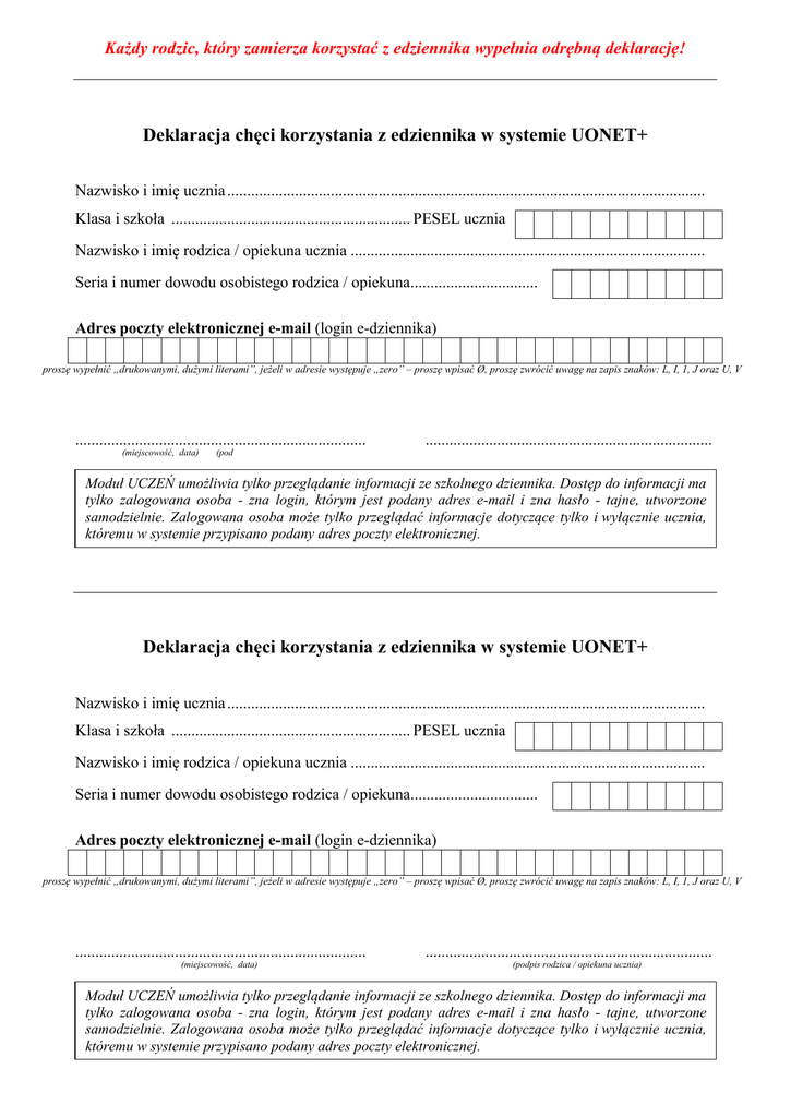 Każdy rodzic, który zamierza korzystać z edziennika wypełnia odrębną deklarację! Deklaracja chęci korzystania z edziennika w systemie UONET+ Nazwisko i imię ucznia ........................................................................................................................ Klasa i szkoła ............................................................ PESEL ucznia Nazwisko i imię rodzica / opiekuna ucznia ......................................................................................... Seria i numer dowodu osobistego rodzica / opiekuna................................ Adres poczty elektronicznej e-mail (login e-dziennika) proszę wypełnić „drukowanymi, dużymi literami”, jeżeli w adresie występuje „zero” – proszę wpisać Ø, proszę zwrócić uwagę na zapis znaków: L, I, 1, J oraz U, V ......................................................................... (miejscowość, data) ........................................................................ (pod Moduł UCZEŃ umożliwia tylko przeglądanie informacji ze szkolnego dziennika. Dostęp do informacji ma tylko zalogowana osoba - zna login, którym jest podany adres e-mail i zna hasło - tajne, utworzone samodzielnie. Zalogowana osoba może tylko przeglądać informacje dotyczące tylko i wyłącznie ucznia, któremu w systemie przypisano podany adres poczty elektronicznej. Deklaracja chęci korzystania z edziennika w systemie UONET+ Nazwisko i imię ucznia ........................................................................................................................ Klasa i szkoła ............................................................ PESEL ucznia Nazwisko i imię rodzica / opiekuna ucznia ......................................................................................... Seria i numer dowodu osobistego rodzica / opiekuna................................ Adres poczty elektronicznej e-mail (login e-dziennika) proszę wypełnić „drukowanymi, dużymi literami”, jeżeli w adresie występuje „zero” – proszę wpisać Ø, proszę zwrócić uwagę na zapis znaków: L, I, 1, J oraz U, V ......................................................................... (miejscowość, data) ........................................................................ (podpis rodzica / opiekuna ucznia) Moduł UCZEŃ umożliwia tylko przeglądanie informacji ze szkolnego dziennika. Dostęp do informacji ma tylko zalogowana osoba - zna login, którym jest podany adres e-mail i zna hasło - tajne, utworzone samodzielnie. Zalogowana osoba może tylko przeglądać informacje dotyczące tylko i wyłącznie ucznia, któremu w systemie przypisano podany adres poczty elektronicznej.