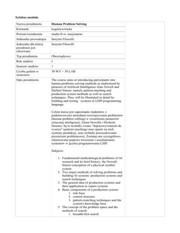 Sylabus modułu Nazwa przedmiotu Human Problem Solving Kierunek kognitywistyka Poziom kształcenia studia II st. stacjonarne Jednostka prowadząca Instytut Filozofii Jednostka dla której przedmiot jest oferowany Instytut Filozofii Typ przedmiotu Obowiązkowy Rok studiów I Semestr studiów 1 Liczba godzin w semestrze 30 WY + 30 LAB Opis przedmiotu The course aims at introducing participants into human problems solving methods as understood by pioneers of Artificial Intelligence Alan Newell and Herbert Simon: namely pattern-maching and production system methods as well as search techniques. They will be illustrated in detail by building and testing systems in LISP programming language. Celem kursu jest zapoznanie studentów z podstawowymi metodami rozwiązywania problemów (human problem solbing) w rozumieniu pionierów sztucznej inteligencji, Alana Newella i Herberta Simona. Są to techniki zwane "dopasowywaniem do wzorca" (pattern-maching) oraz oparte na nich systemy produkcji, oraz techniki przeszukiwania przestrzeni problemowej. Zostaną one szczegółowo zilustrowane poprzez tworzenie i uruchamianie systemów w języku programowania LISP. Subjects: 1. Fundamental methodological problems of AI research and its brief history: the NewellSimon conception of a physical symbol system 2. Two major methods of solving problems and building AI systems: production systems and search techniques 3. The general idea of production systems and their application to expert systems 4. Basic components of a production system: 1. rule base 2. control structure 3. pattern-matching techniques and the system's knowledge base 5. The concept of the problem space and the methods of search: 1. breadth-first search 2. depth-first search 3. heuristic search 6. Implementing various search algorithms in LISP programming language Efekty kształcenia wiedza (max. 5): metoda weryfikacji EK kierunkowe 1. Zna wybrane teorie wyjaśniające systemy poznawcze w kategoriach obliczeniowych i metody modelowania komputerowego ich działania za pomocą narzędzi języka LISP egz. pisemny K2_W01, K2_W09, K2_W10, K2_W13 2. Zna teoretyczne (psychologiczne, neuronaukowe) podstawy obliczeniowego modelowania procesów rozwiązywania problemów i podejmowania decyzji Egz. pisemny K2_W08, K2_W18 3. Zna podstawowe metody rozwiązywania problemów przez ludzi i systemy komputerowe egz. pisemny K2_W16, K2_W09 4. Zna na poziomie rozszerzonym anglojęzyczną egz. pisemny K2_W03 terminologię związaną z rozwiązywaniem problemów przez systemy poznawcze umiejętności: 1. Potrafi rozwiązywać problemy przy użyciu technik test K2_U04, programowania języka LISP oraz zaprojektować w zaliczeniowy, K2_U06 nim prosty model obliczeniowy wybranych zdolności projekt poznawczych 2. Potrafi analizować zachowanie systemów test K2_U09 poznawczych w kategoriach rozwiązywania zaliczeniowy, problemów na przykładzie implementacji wybranych projekt metod programowania w języku LISP 3. Dobiera odpowiednie narzędzia języka LISP do opisu systemów i procesów poznawczych. test K2_U04 zaliczeniowy, projekt 4. Potrafi biegle posługiwać się językiem angielskim przy tworzeniu, opisie i dyskusji wyników uzyskanych przez komputerowe implementacje procesów rozwiązywania problemów test K2_U15 zaliczeniowy, projekt Kompetencje społeczne: Literatura 1. Rozwija zdolności współpracy w grupie przy wspólnej pracy nad tworzeniem systemów komputerowych test K2_K06 zaliczeniowy, projekt 2. Szanuje własność intelektualną w tym prawa autorskie do programów, poprzez używanie tzw. wolnego otwartego oprogramowania, również działającego w środowisku darmowego systemu operacyjnego Linux test K2_K09 zaliczeniowy, projekt 3. Rozwija swoje umiejętności modelowania procesów poznawczych za pomocą systemów komputerowych i wykorzystuje je do popularyzacji osiągnięć dyscypliny kognitywistyki test K2_K01, zaliczeniowy, K2_K04 projekt S. Tanimoto, Elements of Artificial Intelligence Using Common LISP, Seattle, 1995 E. Rich, Artificial Intelligence, New York, 1990. Źródła elektroniczne na stronie kursu Punkty ECTS 6 Ogólna forma zaliczenia Egzamin Warunki zaliczenia aktywny udział w zajęciach, zaliczenie testu końcowego i zdanie egzaminu na co najmniej 50% punktów Język wykładowy angielski Koordynator przedmiotu Dr hab. Piotr Giza Dodatkowe informacje Strona kursu: http://bacon.umcs.lublin.pl/~pgiza