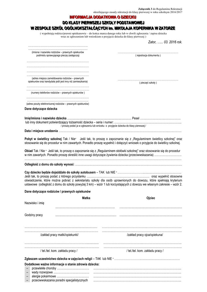 Załącznik 3 do Regulaminu Rekrutacji określającego zasady rekrutacji do klasy pierwszej w roku szkolnym 2016/2017 IINNFFOORRM MAACCJJAA DDOODDAATTKKOOW WAA OO DDZZIIEECCKKUU DDOO KKLLAASSYY PPIIEERRW WSSZZEEJJ SSZZKKOOŁŁYY PPOODDSSTTAAW WOOW WEEJJ W W ZZEESSPPOOLLEE SSZZKKÓÓŁŁ OOGGÓÓLLNNOOKKSSZZTTAAŁŁĆĆĄĄCCYYCCHH iim m.. M MIIKKOOŁŁAAJJAA KKOOPPEERRNNIIKKAA W W ZZAATTOORRZZEE ( wypełniają rodzice/prawni opiekunowie – do końca marca danego roku lub w chwili zgłoszenia / zapisu dziecka wraz ze zgłoszeniem lub wnioskiem o przyjęcie dziecka do klasy pierwszej ) Zator, …... 03. 2016 rok. …………………………………………………………..……….. …………………………………………………………………… (imiona i nazwiska rodziców – prawnych opiekunów podmiotu sprawującego pieczę zastępczą) …………………………………………………………………….. ( rejestracja dokumentu ) ……….……………………………………………………………… ………………….…………………………………………………… ………………………….…………………………………………… ………………….…………………………………………………… (adres miejsca zameldowania rodziców – prawnych opiekunów oraz kandydata jeśli jest inny niż zamieszkania) …………………………………………………………………….. ( pieczęć szkoły ) ………………………………………………………………………. ……………………….………….…………………………………… (numery telefonów rodziców – prawnych opiekunów ) ………………………………………………………………………. …………….……………………………………………………….. (adres poczty elektronicznej rodziców – prawnych opiekunów) Dane dotyczące dziecka Imię/imiona i nazwisko dziecka ................................................................................. Pesel …………………….……………… lub inny dokument potwierdzający tożsamość dziecka – seria i numer: …………………………………………………………….. / proszę podać ja w zgłoszeniu lub wniosku o przyjęcie dziecka do klasy pierwszej / Data i miejsce urodzenia ……………………………………………………………………………………………………..….………. Pobyt w świetlicy szkolnej Tak / Nie* Jeśli tak, to proszę o zapoznanie się z „Regulaminem świetlicy szkolnej” oraz stosowanie się do procedur w nim zawartych. Ponadto proszę wypełnić i dołączyć wniosek o przyjęcie do świetlicy szkolnej. Obiad Tak / Nie * Jeśli tak, to proszę o zapoznanie się z „Regulaminem stołówki szkolnej” oraz stosowanie się do procedur w nim zawartych. Ponadto proszę określić inne uwagi dotyczące żywienia dziecka (przeciwwskazania) ……………………….. ..………………..……………………………………………………………………………………………………………………………… Odległość z domu do szkoły wynosi: ……………………………………………….…………………………………………………. Czy dziecko będzie dojeżdżało do szkoły autobusem – TAK lub NIE * ……………………………………………………………….. Jeśli tak, to proszę podać z którego przystanku ………………………………………………………… oraz wypełnić stosowne oświadczenie, które można pobrać z sekretariatu szkoły dla osób uprawnionych do dowozu, które spełniają kryterium ustawowe (odległość z domu do szkoły powyżej 3 km) – wzór 1 lub korzystających z dowozu we własnym zakresie – wzór 2. Dane dotyczące rodziców / prawnych opiekunów Matka Ojciec Nazwisko i imię ........................................................................... Godziny pracy ............................................................................... ............................................................................. ............................................................................... …………………………………............................................. ………………………………………………..…………………. /zakład pracy matki/opiekunki/ …………………….………………….…..…………………………... ….………………………...……………………………………….….. /zakład pracy ojca/opiekuna/ ……………………………….………………………................. ……………………………………………………..…………….. / tel./tel. kom. zakładu pracy / ……………….………………….…………………………………... .………………….……………………………………………….….. / tel./tel. kom. zakładu pracy / Zgłaszam uczestnictwo dziecka w zajęciach religii – TAK lub NIE * …………………………….…………………………………… Dodatkowe ważne informacje o stanie zdrowia dziecka: – przewlekłe choroby ……………………………. ………………………………………………………………………………... – wady rozwojowe ……………………………….. ………………………………………………………………………………... – alergie pokarmowe ……………………………. ………………………………………………………………………………... – przeciwwskazania poradni specjalistycznych ………………………………………………………………………………... Zainteresowania, uzdolnienia dziecka, upodobania …