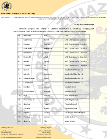 Kluby woj. pomorskiego Pomorski Związek Piłki Nożnej w Gdańsku zawiadamia o powołaniu następujących zawodników do kadry województwa pomorskiego rocznik 2004 na konsultację szkoleniową: Lp. Nazwisko Imię Klub 1. Kiedrowicz Dawid MKS Chojniczanka Chojnice 2. Korczyc Damian MKS Chojniczanka Chojnice 3. Laskowski Aleksander MKS Chojniczanka Chojnice 4. Gawroński Fabian MKS Chojniczanka Chojnice 5. Krystecki Jakub MKS Chojniczanka Chojnice 6. Madej Kacper MKS Chojniczanka Chojnice 7. Zabrocki Jan MKS Chojniczanka Chojnice 8. Głodek Adam Akademia Piłkarska LG 9. Mielnik Amadeusz Akademia Piłkarska LG 10. Święczkowski Patryk Akademia Piłkarska LG 11. Kopiczyński Konrad Akademia Piłkarska LG 12. Bohdan Nikodem Sparta Gdańsk 13. Skrzypkowski Mateusz Sparta Gdańsk 14. Leja Dominik Gryf Wejherowo 15. Pawłowski-br Maciej Gryf Wejherowo 16. Gontarz Paweł Polonia Gdańsk 17. Trzciński Maciej Polonia Gdańsk 18. Bienszka Mikołaj K.S Wicher Wierzchucino 19. Praniuk Szymon Jantar Ustka 20. Gołoś-br Filip Jantar Ustka 21. Stalewski Jakub Jantar Ustka 22. Kindre Przemysław Lechia Gdańsk S.A 23. Tarczyński Wojciech Lechia Gdańsk S.A 24. Grzywna Marcin Lechia Gdańsk S.A 25. Prokopowicz Remek Lechia Gdańsk S.A 26. Baranowski Jan Żuławy Nowy Dwór Gd 27. Klein Jakub Żuławy Nowy Dwór Gd 28. Grzywacz Mateusz Żuławy Nowy Dwór Gd 29. Treder Aleksander U2 Bytów 30. Dułak Kamil U2 Bytów 31. Wielgosz Michał U2 Bytów Powołani zawodnicy winni posiadać ze sobą sprzęt do gry (buty i ochraniacze) na dwór (boisko sztuczne), aktualną kartę zawodnika oraz badań sportowych. Zbiórka w dniu 25.11.2015r. (środa) o godz. 16.00 Chojnice ul. Bałtycka 1. Planowane zakończenie konsultacji nastąpi ok. godz. 18.30. Proszę o telefoniczne (sms) potwierdzenie obecności do 23.11.2015 (poniedziałek) - do godziny 17.00 -kierownik zespołu Dawid Głodek (nr telefonu 503-809-668). Ze sportowym pozdrowieniem Trener Tomasz Borkowski 512-413-486