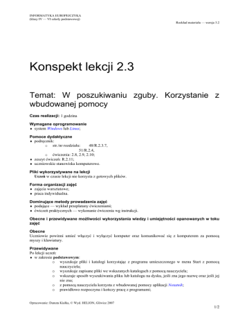 INFORMATYKA EUROPEJCZYKA (klasy IV — VI szkoły podstawowej) Rozkład materiału — wersja 3.2 Konspekt lekcji 2.3 Temat: W poszukiwaniu zguby. Korzystanie z wbudowanej pomocy Czas realizacji: 1 godzina Wymagane oprogramowanie ♦ system Windows lub Linux; Pomoce dydaktyczne ♦ podręcznik: o str./nr rozdziału: 48/R.2.3.7, 51/R.2.4, o ćwiczenia: 2.8, 2.9, 2.10; ♦ zeszyt ćwiczeń: R.2.11; ♦ uczniowskie stanowiska komputerowe. Pliki wykorzystywane na lekcji Uczeń w czasie lekcji nie korzysta z gotowych plików. Forma organizacji zajęć ♦ zajęcia warsztatowe; ♦ praca indywidualna. Dominujące metody prowadzenia zajęć ♦ podające — wykład przeplatany ćwiczeniami; ♦ ćwiczeń praktycznych — wykonanie ćwiczenia wg instrukcji. Obecne i przewidywane możliwości wykorzystania wiedzy i umiejętności opanowanych w toku zajęć Obecne Uczniowie powinni umieć włączyć i wyłączyć komputer oraz komunikować się z komputerem za pomocą myszy i klawiatury. Przewidywane Po lekcji uczeń: ♦ w zakresie podstawowym: o wyszukuje pliki i katalogi korzystając z programu umieszczonego w menu Start z pomocą nauczyciela; o wyszukuje zapisane pliki we wskazanych katalogach z pomocą nauczyciela; o wskazuje sposób wyszukiwania pliku lub katalogu na dysku, jeśli zna jego nazwę oraz jeśli jej nie zna; o z pomocą nauczyciela korzysta z wbudowanej pomocy aplikacji Notatnik; o prawidłowo rozpoczyna i kończy pracę z programami; Opracowanie: Danuta Kiałka, © Wyd. HELION, Gliwice 2007 1/2 INFORMATYKA EUROPEJCZYKA (klasy IV — VI szkoły podstawowej) Rozkład materiału — wersja 3.2 ♦ w zakresie ponadpodstawowym: o o o o samodzielnie wyszukuje pliki i katalogi w różnych systemach; samodzielnie korzysta z wbudowanej pomocy systemu oraz dowolnego programu; opisuje sposób wyszukiwania pliku lub katalogu na dysku, jeśli zna jego nazwę oraz jeśli jej nie zna; wyjaśnia zastosowanie karty index w dowolnym systemie pomocy. Cele zajęć ♦ trening czytania ze zrozumieniem; ♦ zdobycie umiejętności wyszukiwania plików i katalogów oraz korzystania z wbudowanej pomocy; ♦ posługiwanie się podstawowym słownictwem komputerowym; ♦ w zakresie wychowania — przygotowanie uczniów do tego, aby: o szanowali pracę innych i własną; o przestrzegali regulaminu pracowni komputerowej; o potrafili pracować w grupie; Przebnieg lekcji ♦ omówienie tematyki zajęć; ♦ praca z podręcznikiem, ciche czytanie ze zrozumieniem; ♦ praca z zeszytem ćwiczeń;; ♦ wykonywanie ćwiczeń zgodnie z instrukcją: ♦ praca z zeszytem ćwiczeń; ♦ głośne odczytanie odpowiedzi z zeszytów ćwiczeń. Podsumowanie zajęć i ocenianie Nauczyciel powinien przypomnieć cel i założenia lekcji, następnie pozytywnie ocenić najbardziej aktywnych uczniów (np. dodatkowym punktem lub oceną) oraz uzupełnić punktację w zeszytach ćwiczeń. Jeśli w trakcie wykonywania ćwiczeń przez uczniów potrzebna jest pomoc nauczyciela, to należy udzielać jej indywidualnie w formie konsultacji. Wskazane jest zaangażowanie do pomocy uczniów bardziej zaawansowanych w temacie, którzy na pewno pierwsi wykonają ćwiczenia i mogą pomóc słabszym. Pamiętajmy o nagrodzeniu ich wysiłku, na przykład dodatkowym punktem. Należy stale przypominać uczniom jakie są kryteria oceniania. Ocenianie uczniów Oceniamy: ♦ praca na lekcji: o wykonywanie poleceń; o staranność wykonania prac; o samodzielność podczas pracy; o efektywność wykorzystania czasu pracy; o aktywność na zajęciach; o biegłość wykonywania ćwiczeń; ♦ praca w grupie: o umiejętność pracy w grupie; o poszanowanie cudzej pracy i twórczości; o pomoc innym uczniom: na ich prośbę; z własnej inicjatywy; o kulturalne komunikowanie się: z nauczycielem; z kolegami; ♦ przestrzeganie regulaminu pracowni komputerowej oraz zasad BHP; ♦ przygotowanie do lekcji; ♦ zadanie domowe (jeżeli było zadane). Opracowanie: Danuta Kiałka, © Wyd. HELION, Gliwice 2007 2/2