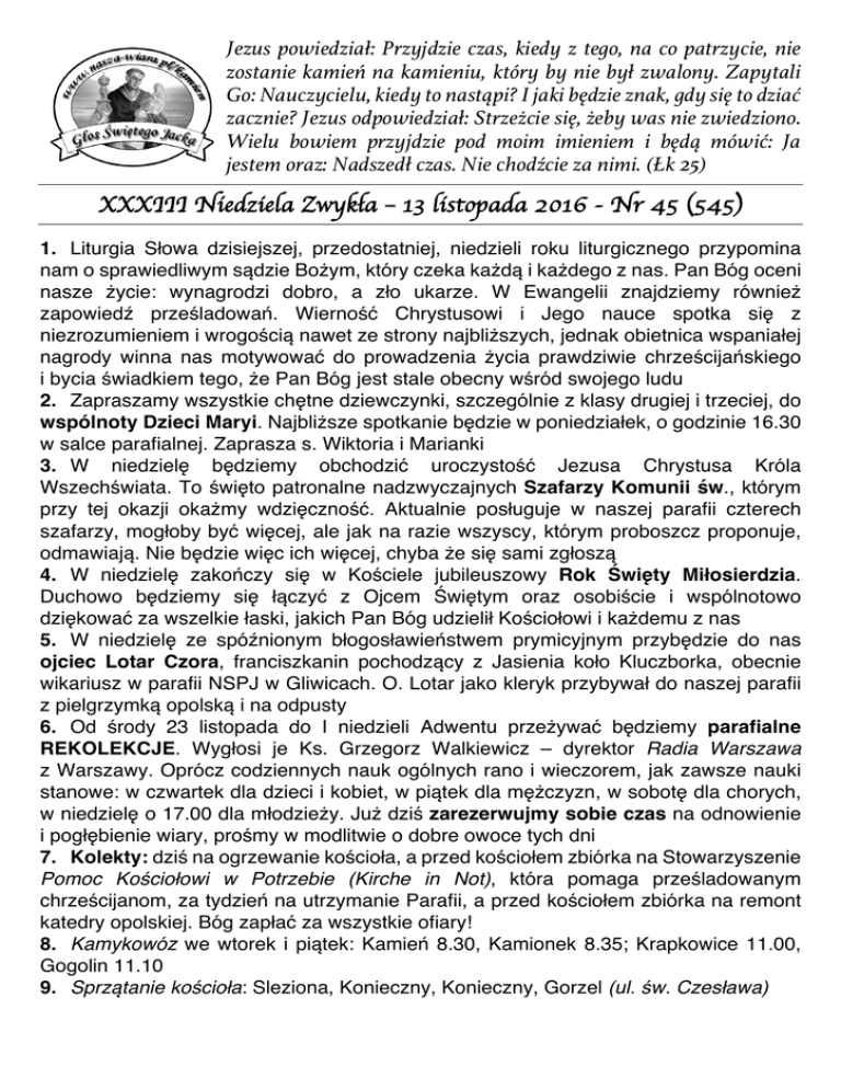 Jezus powiedział: Przyjdzie czas, kiedy z tego, na co patrzycie, nie zostanie kamień na kamieniu, który by nie był zwalony. Zapytali Go: Nauczycielu, kiedy to nastąpi? I jaki będzie znak, gdy się to dziać zacznie? Jezus odpowiedział: Strzeżcie się, żeby was nie zwiedziono. Wielu bowiem przyjdzie pod moim imieniem i będą mówić: Ja jestem oraz: Nadszedł czas. Nie chodźcie za nimi. (Łk 25) XXXIII Niedziela Zwykła – 13 listopada 2016 - Nr 45 (545) 1. Liturgia Słowa dzisiejszej, przedostatniej, niedzieli roku liturgicznego przypomina nam o sprawiedliwym sądzie Bożym, który czeka każdą i każdego z nas. Pan Bóg oceni nasze życie: wynagrodzi dobro, a zło ukarze. W Ewangelii znajdziemy również zapowiedź prześladowań. Wierność Chrystusowi i Jego nauce spotka się z niezrozumieniem i wrogością nawet ze strony najbliższych, jednak obietnica wspaniałej nagrody winna nas motywować do prowadzenia życia prawdziwie chrześcijańskiego i bycia świadkiem tego, że Pan Bóg jest stale obecny wśród swojego ludu 2. Zapraszamy wszystkie chętne dziewczynki, szczególnie z klasy drugiej i trzeciej, do wspólnoty Dzieci Maryi. Najbliższe spotkanie będzie w poniedziałek, o godzinie 16.30 w salce parafialnej. Zaprasza s. Wiktoria i Marianki 3. W niedzielę będziemy obchodzić uroczystość Jezusa Chrystusa Króla Wszechświata. To święto patronalne nadzwyczajnych Szafarzy Komunii św., którym przy tej okazji okażmy wdzięczność. Aktualnie posługuje w naszej parafii czterech szafarzy, mogłoby być więcej, ale jak na razie wszyscy, którym proboszcz proponuje, odmawiają. Nie będzie więc ich więcej, chyba że się sami zgłoszą 4. W niedzielę zakończy się w Kościele jubileuszowy Rok Święty Miłosierdzia. Duchowo będziemy się łączyć z Ojcem Świętym oraz osobiście i wspólnotowo dziękować za wszelkie łaski, jakich Pan Bóg udzielił Kościołowi i każdemu z nas 5. W niedzielę ze spóźnionym błogosławieństwem prymicyjnym przybędzie do nas ojciec Lotar Czora, franciszkanin pochodzący z Jasienia koło Kluczborka, obecnie wikariusz w parafii NSPJ w Gliwicach. O. Lotar jako kleryk przybywał do naszej parafii z pielgrzymką opolską i na odpusty 6. Od środy 23 listopada do I niedzieli Adwentu przeżywać będziemy parafialne REKOLEKCJE. Wygłosi je Ks. Grzegorz Walkiewicz – dyrektor Radia Warszawa z Warszawy. Oprócz codziennych nauk ogólnych rano i wieczorem, jak zawsze nauki stanowe: w czwartek dla dzieci i kobiet, w piątek dla mężczyzn, w sobotę dla chorych, w niedzielę o 17.00 dla młodzieży. Już dziś zarezerwujmy sobie czas na odnowienie i pogłębienie wiary, prośmy w modlitwie o dobre owoce tych dni 7. Kolekty: dziś na ogrzewanie kościoła, a przed kościołem zbiórka na Stowarzyszenie Pomoc Kościołowi w Potrzebie (Kirche in Not), która pomaga prześladowanym chrześcijanom, za tydzień na utrzymanie Parafii, a przed kościołem zbiórka na remont katedry opolskiej. Bóg zapłać za wszystkie ofiary! 8. Kamykowóz we wtorek i piątek: Kamień 8.30, Kamionek 8.35; Krapkowice 11.00, Gogolin 11.10 9. Sprzątanie kościoła: Sleziona, Konieczny, Konieczny, Gorzel (ul. św. Czesława) 13 XI XXXIII NIEDZIELA ZWYKŁA (Kolekta dla Parafii) 7.30 Msza św. w intencji czcicieli MB Fatimskiej i o nawrócenie grzeszników 10.00 Msza św. za ++ męża Antoniego Niewiora w r. śm., rodz., siostrę Cecylię, męża i syna; rodz. Martę i Emila Kampka, brata Jana, siostrę Elfrydę, męża, córkę chrzestną Angelę, Bertę Pola, Księży i Siostry zakonne, kt. u nas pracowali, dusze w cz. c. 15.00 Nieszpory niedzielne 16.00 Msza św. do Anioła Stróża w intencji rocznego dziecka Michała Jacka Gołąb, jego rodz. i chrzestnych PONIEDZIAŁEK 14 XI Marii Luizy Merkert 7.00 Msza św. za ++ Wiktora Niewiora, 2 żony, rodz. z obu stron, Anastazję Mnich, męża, rodz. z obu stron, siostrę Cecylię, męża Alberta, syna Rafała Pudelko, brata Antoniego Niewiora, wszystkie dusze z tego domu 17.00 Kamionek: za ++ rodz. Magdalenę i Józefa Blania, męża Waleriana, teściów, bratową Wandę, 3 szwagrów, zmarłą w Niemczech Marię Jaszkowic i z pokr. WTOREK 15 XI Nowenna do św. Jacka 7.00 Msza św. zbiorowa za zmarłych 18.00 Msza św. zbiorowa w intencjach żyjących 18.45 Katecheza dla dorosłych Rocznica Poświęcenia Katedry Opolskiej ŚRODA 16 XI 7.00 Msza św. w jęz. niem.: za ++ rodz. Franciszkę i Aleksandra, siostrę Martę, jej chrześniaczkę Marię, dusze w cz. c. Elżbiety z Turyngii CZWARTEK 17 XI 7.00 Msza św. za ++ męża Alfreda Lukaszczyk, syna Jerzego, synową Elżbietę, rodz. Annę i Antoniego Lukaszczyk, rodz. Marię i Teodora Skóra, siostry Marię, Gertrudę i Elżbietę, braci Ernesta i Herberta, szwagrów i dusze w cz. c. 17.00 Msza św. szkolna: za ++ ojca Ryszarda w 35 r. śm., matkę Jadwigę i z pokr. 17.45 Spotkanie formacyjne trzeciej klasy gimnazjum Karoliny Kózkówny PIĄTEK 18 XI 7.00 Msza św. za ++ z rodzin, z pokr. i dusze w cz. c. 19.30 - 21.30 Czuwanie dekanalne dla młodzieży w parafii NSPJ w Gogolinie Salomei SOBOTA 19 XI 7.00 Msza św. do B. Op. (…) w int. Marcina i Sylwii z okazji 25 r. ślubu i 50 urodzin Marcina 15.00 Msza św. do B. Op. (…) w int. Elżbiety Tomaszewskiej z okazji 60 urodzin 16.00 Św. Barbara: Msza św. za wszystkich zmarłych z DSS Św. Barbara 17.00 Kamionek: Msza św. za ++ rodz. Elżbietę i Franciszka Gąsior, brata Henryka, rodz. Elżbietę i Alfreda Fesser, z pokr. i dusze w cz. c. NIEDZIELA ZWYKŁA - UROCZYSTOŚĆ CHRYSTUSA KRÓLA (Kolekta dla Parafii) 20 XI 7.30 Msza św. za ++ matkę Hildegardę Fesser, rodz. Łucję i Jerzego Czapla, dziadków z obydwu stron, pokr. Fesser i Czapla 10.00 Msza św. za + ojca Franciszka Matuszek, matkę Helenę Szwugier, pokr. Grobosz, Herman, Szwugier, Matuszek i dusze w cz. c. 15.00 Nabożeństwo do Chrystusa Króla z Aktem Zawierzenia Parafii 16.00 Msza św. do B. Op. (…) w int. Huberta Matauszek z okazji 60 