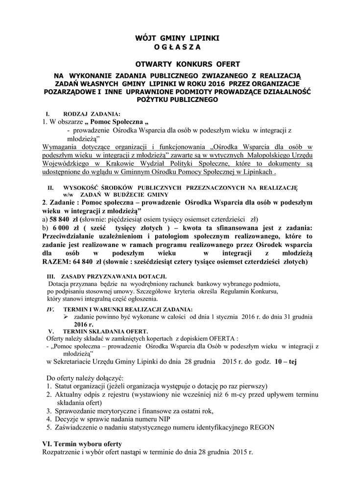 WÓJT GMINY LIPINKI OGŁASZA OTWARTY KONKURS OFERT NA WYKONANIE ZADANIA PUBLICZNEGO ZWIAZANEGO Z REALIZACJĄ ZADAŃ WŁASNYCH GMINY LIPINKI W ROKU 2016 PRZEZ ORGANIZACJE POZARZĄDOWE I INNE UPRAWNIONE PODMIOTY PROWADZĄCE DZIAŁALNOŚĆ POŻYTKU PUBLICZNEGO I. RODZAJ ZADANIA: 1. W obszarze „ Pomoc Społeczna „ - prowadzenie Ośrodka Wsparcia dla osób w podeszłym wieku w integracji z młodzieżą” Wymagania dotyczące organizacji i funkcjonowania „Ośrodka Wsparcia dla osób w podeszłym wieku w integracji z młodzieżą” zawarte są w wytycznych Małopolskiego Urzędu Wojewódzkiego w Krakowie Wydział Polityki Społeczne, które to dokumenty są udostępnione do wglądu w Gminnym Ośrodku Pomocy Społecznej w Lipinkach . II. WYSOKOŚĆ ŚRODKÓW PUBLICZNYCH PRZEZNACZONYCH NA REALIZACJĘ w/w ZADAŃ W BUDŻECIE GMINY 2. Zadanie : Pomoc społeczna – prowadzenie Ośrodka Wsparcia dla osób w podeszłym wieku w integracji z młodzieżą” a) 58 840 zł (słownie: pięćdziesiąt osiem tysięcy osiemset czterdzieści zł) b) 6 000 zł ( sześć tysięcy złotych ) – kwota ta sfinansowana jest z zadania: Przeciwdziałanie uzależnieniom i patologiom społecznym realizowanego, które to zadanie jest realizowane w ramach programu realizowanego przez Ośrodek wsparcia dla osób w podeszłym wieku w integracji z młodzieżą RAZEM: 64 840 zł (słownie : sześćdziesiąt cztery tysiące osiemset czterdzieści złotych) III. ZASADY PRZYZNAWANIA DOTACJI. Dotacja przyznana będzie na wyodrębniony rachunek bankowy wybranego podmiotu, po podpisaniu stosownej umowy. Szczegółowe kryteria określa Regulamin Konkursu, który stanowi integralną część ogłoszenia. IV. TERMIN I WARUNKI REALIZACJI ZADANIA: zadanie powinno być wykonane w całości od dnia 1 stycznia 2016 r. do dnia 31 grudnia 2016 r. V. TERMIN SKŁADANIA OFERT. Oferty należy składać w zamkniętych kopertach z dopiskiem OFERTA : - „Pomoc społeczna – prowadzenie Ośrodka Wsparcia dla Osób w podeszłym wieku w integracji z młodzieżą” w Sekretariacie Urzędu Gminy Lipinki do dnia 28 grudnia 2015 r. do godz. 10 – tej Do oferty należy dołączyć: 1. Statut organizacji (jeżeli organizacja występuje o dotację po raz pierwszy) 2. Aktualny odpis z rejestru (wystawiony nie wcześniej niż 6 m-cy przed upływem terminu składania ofert) 3. Sprawozdanie merytoryczne i finansowe za ostatni rok, 4. Decyzje w sprawie nadania numeru NIP 5. Zaświadczenie o nadaniu statystycznego numeru identyfikacyjnego REGON VI. Termin wyboru oferty Rozpatrzenie i wybór ofert nastąpi w terminie do dnia 28 grudnia 2015 r. Oferty niekompletne i nieprawidłowo wypełnione albo złożone po terminie nie będą rozpatrywane. Kryteria i regulamin konkursu oraz formularze: oferty, umowy i sprawozdania dostępne są w Urzędzie Gminy Lipinki oraz na stronie internetowej www.malopolska.pl/bip/lipinki VII. Oferta na realizację zadania publicznego powinna być sporządzona zgodnie z wzorem określonym w rozporządzeniu Ministra Pracy i Polityki Społecznej z dnia 15 grudnia 2010 r. w sprawie wzoru oferty i ramowego wzoru umowy dotyczących realizacji zadania publicznego oraz wzoru sprawozdania z wykonania tego zadania (Dz.U. z 2011 r. nr 6, poz. 25) VIII. Informacja o wysokości środków z budżetu Gminy Lipinki, przeznaczonych na realizację zadania: W roku 2013 w zakresie 1. „Przeciwdziałanie uzależnieniom i patologiom społecznym” . Na realizacje zadania w tym zadaniu w Gminie Lipinki przeznaczono łącznie kwotę 14.000 zł *Wójtowa – Ludowy Klub Sportowy „Wójtowa” 2.387 zł *Kryg – Ludowy Klub Sportowy „Nafta” Kryg 1.400 zł *Kryg – Uczniowski Klub Sportowy „Błyskawica” 1.400 zł *Lipinki – Uczniowski Ludowy Klub Sportowy „Lipinki” 3.700 zł oraz na wsparcie zadania „Utworzenie ośrodka wsparcia dla osób starszych w integracji z młodzieżą” kwotę – 5113 zł – dla : Stowarzyszenie na rzecz pomocy rodzinie „Nadzieja” w Bieczu 2. „Pomoc społeczna” utworzenie Ośrodka Wsparcia dla Osób starszych w integracji z młodzieżą” Na realizacje zadania w tym zadaniu w Gminie Lipinki przeznaczono kwotę 20 448 zł. *Pagorzyna – Stowarzyszenie na Rzecz Pomocy Rodzinie „Nadzieja” 20 448 zł 3. „Wspieranie i upowszechnianie kultury fizycznej” - Na realizacje zadania w tym zadaniu w Gminie Lipinki przeznaczono łącznie kwotę 16.000 zł *Wójtowa – Ludowy Klub Sportowy „Wójtowa” 5.000 zł *Kryg – Ludowy Klub Sportowy „Nafta” Kryg 4.500 zł *Kryg – Uczniowski Klub Sportowy „Błyskawica” 1.500 zł *Lipinki – Uczniowski Ludowy Klub Sportowy „Lipinki” 5.000 zł W roku 2014 r. w zakresie : 1. „Wspieranie i upowszechnianie kultury fizycznej” - Na realizacje zadania w tym zadaniu w Gminie Lipinki przeznaczono łącznie kwotę 17.000 zł *Wójtowa – Ludowy Klub Sportowy „Wójtowa” *Kryg – Ludowy Klub Sportowy „Nafta” Kryg *Kryg – Uczniowski Klub Sportowy „Błyskawica” *Lipinki- ULKS „LIPINKI” 6.500 zł 5.500 zł 2.000 zł 3.000 zł 2. „Przeciwdziałanie uzależnieniom i patologiom społecznym” . Na realizacje zadania w tym zadaniu w Gminie Lipinki przeznaczono łącznie kwotę 14.000 zł w tym kwotę 4880 zł z przeznaczeniem na prowadzenie „Ośrodka wsparcia dla osób starszych w integracji z młodzieżą” *Wójtowa – Ludowy Klub Sportowy „Wójtowa” 4.020 zł *Kryg – Ludowy Klub Sportowy „Nafta” Kryg 1.100 zł *Kryg – Uczniowski Klub Sportowy „Błyskawica” 1.000 zł *Lipinki – Uczniowski Ludowy Klub Sportowy „Lipinki” 2.000 zł * Wójtowa- Uczniowski Klub Sportowy „Victoria” 1.000 zł 3. „Prowadzenie ośrodka wsparcia dla osób starszych w integracji z młodzieżą” – (na realizacje zadania w tym zakresie w Gminie Lipinki przeznaczono łącznie kwotę– 56 849,00 zł (słownie: pięćdziesiąt sześć tysięcy osiemset czterdzieści dziewięć zł), którą przyznano - Stowarzyszenie na Rzecz Pomo