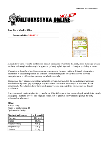 Utworzono: 2017-03-08 04:43:07 Low Carb Musli - 500g Cena produktu: 25,00 PLN JabuVit Low Carb Musli to płatki które zostały specjalnie stworzone dla osób, które zwracają uwagę na dietę niskowęglowodanową i chcą poszerzyć swój wybór żywności o kolejne produkty w menu. W produkcie Low Carb Musli mamy zawarte wyłącznie tłuszcze roślinne, których nie powinno zabraknąć w codziennej diecie. Są to mono i wielonienasycone kwasy tłuszczowe które są zaangażowane w różnorodne procesy metaboliczne ciała. Stosowanie diety niskowęglowodanowej może szybko doprowadzić do zachwiania równowagi metabolizmu lipidów, gdy występuje zbyt duża ilość tłuszczów nasyconych w stosunku do nie nasyconych. Z produktem Low Carb musli przywrócenie odpowiedniej równowagi nie będzie problemem. Powyższe musli zawiera tylko 3,4 g cukrów na 100g które pochodzą z naturalnych składników takich jak jagody i suszone owoce. Tak więc jak widać jest to produkt który idealnie pasuje do diety niskowęglowadanowej. Skład: Porcja: 50 g Porcji w opakowaniu: 10 Opakowanie: 500 g Wartość odżywcza Energia w 1 porcji 414 kcal Białko 34,9 h Węglowodany 9,8 g w tym cukry 5,6 g Tłuszcz 22,1g w tym kwasy tłuszczowe Sól 3,2 g < 0,1 g Dawkowanie: Spożywaj 50 g na śniadanie z 80 ml mleka z niską zawartością tłuszczu. Adres: http://www.ko.sklep.pl/ Telefon: kom. 782 010 880 Email: [email protected]