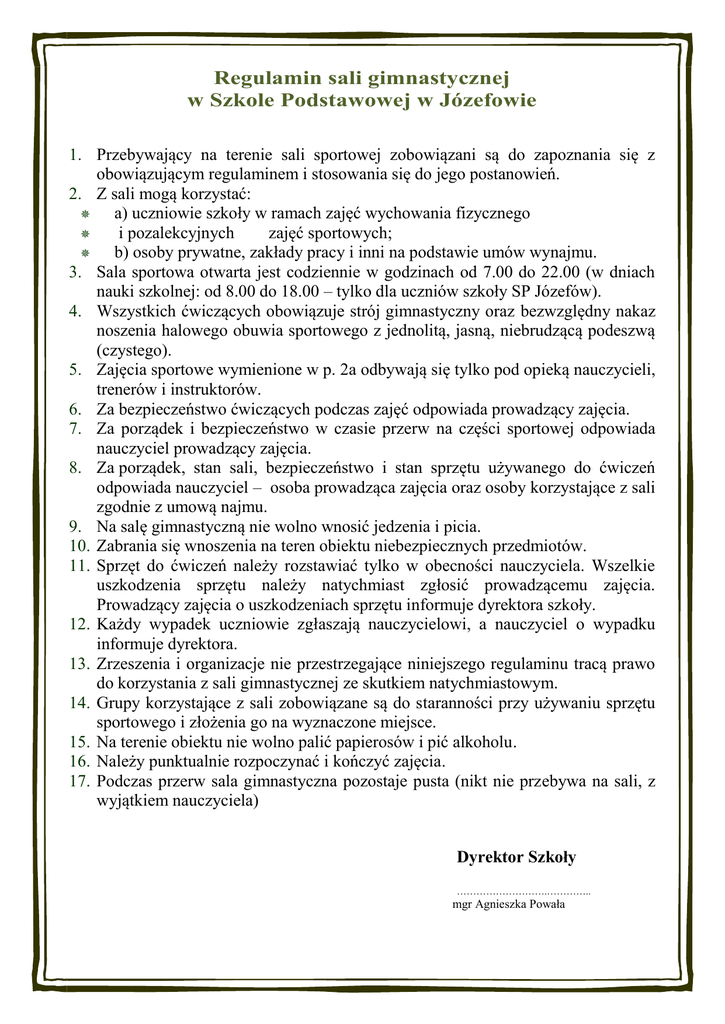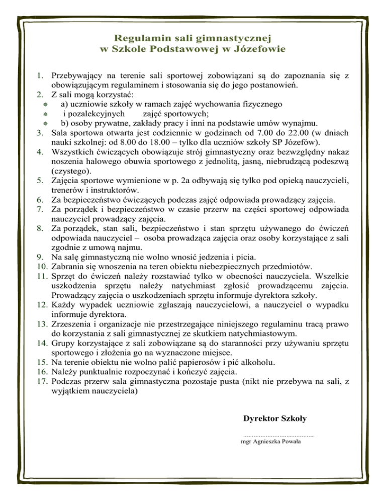 Regulamin sali gimnastycznej w Szkole Podstawowej w Józefowie 1. Przebywający na terenie sali sportowej zobowiązani są do zapoznania się z obowiązującym regulaminem i stosowania się do jego postanowień. 2. Z sali mogą korzystać: a) uczniowie szkoły w ramach zajęć wychowania fizycznego i pozalekcyjnych zajęć sportowych; b) osoby prywatne, zakłady pracy i inni na podstawie umów wynajmu. 3. Sala sportowa otwarta jest codziennie w godzinach od 7.00 do 22.00 (w dniach nauki szkolnej: od 8.00 do 18.00 – tylko dla uczniów szkoły SP Józefów). 4. Wszystkich ćwiczących obowiązuje strój gimnastyczny oraz bezwzględny nakaz noszenia halowego obuwia sportowego z jednolitą, jasną, niebrudzącą podeszwą (czystego). 5. Zajęcia sportowe wymienione w p. 2a odbywają się tylko pod opieką nauczycieli, trenerów i instruktorów. 6. Za bezpieczeństwo ćwiczących podczas zajęć odpowiada prowadzący zajęcia. 7. Za porządek i bezpieczeństwo w czasie przerw na części sportowej odpowiada nauczyciel prowadzący zajęcia. 8. Za porządek, stan sali, bezpieczeństwo i stan sprzętu używanego do ćwiczeń odpowiada nauczyciel – osoba prowadząca zajęcia oraz osoby korzystające z sali zgodnie z umową najmu. 9. Na salę gimnastyczną nie wolno wnosić jedzenia i picia. 10. Zabrania się wnoszenia na teren obiektu niebezpiecznych przedmiotów. 11. Sprzęt do ćwiczeń należy rozstawiać tylko w obecności nauczyciela. Wszelkie uszkodzenia sprzętu należy natychmiast zgłosić prowadzącemu zajęcia. Prowadzący zajęcia o uszkodzeniach sprzętu informuje dyrektora szkoły. 12. Każdy wypadek uczniowie zgłaszają nauczycielowi, a nauczyciel o wypadku informuje dyrektora. 13. Zrzeszenia i organizacje nie przestrzegające niniejszego regulaminu tracą prawo do korzystania z sali gimnastycznej ze skutkiem natychmiastowym. 14. Grupy korzystające z sali zobowiązane są do staranności przy używaniu sprzętu sportowego i złożenia go na wyznaczone miejsce. 15. Na terenie obiektu nie wolno palić papierosów i pić alkoholu. 16. Należy punktualnie rozpoczynać i kończyć zajęcia. 17. Podczas przerw sala gimnastyczna pozostaje pusta (nikt nie przebywa na sali, z wyjątkiem nauczyciela) Dyrektor Szkoły ……………………….………….. mgr Agnieszka Powała Zasady korzystania z szatni sportowych 1. W szatni sportowej mogą przebywać jedynie uczniowie rozpoczynający lub kończący lekcje wychowania fizycznego. Zabrania się przebywania w szatni innym osobom. 2. Grupa po wejściu do szatni zobowiązana jest sprawdzić stan faktyczny szatni i zgłosić wszelkie usterki nauczycielowi w-f, lub nauczycielowi prowadzącemu zajęcia. 3. Korzystający z szatni będą pociągani do odpowiedzialności za wyrządzone szkody. 4. Każda klasa lub zespół ćwiczebny jest odpowiedzialny za ład i porządek w szatni. 5. Zabrania się: - zaśmiecania szatni; -palenia papierosów; -spożywania napojów alkoholowych; -zażywania środków odurzających. 6. Podczas trwania lekcji uczniowie nie mogą przebywać w szatni. 7. Wartościowe przedmioty i pieniądze uczniowie przed zajęciami pozostawiają u nauczyciela. Za przedmioty wartościowe pozostawione w szatni szkoła nie ponosi odpowiedzialności. Dyrektor Szkoły ……………………….…………. mgr Agnieszka Powała Zasady korzystania ze sprzętu sportowego zgromadzonego w magazynku sportowym 1. Magazyn sprzętu sportowego jest do dyspozycji osoby prowadzącej zajęcia. 2. Tylko prowadzący zajęcia posiada klucze i może przebywać w magazynie. 3. Uczniom do magazynku wolno wchodzić tylko za zgodą nauczyciela 4. Prowadzący zajęcia odpowiedzialny jest za: a) ład i porządek w magazynie, b) wydawanie i przyjmowanie sprzętu sportowego oraz jego liczenie, c) zniszczenie i zagubienie sprzętu sportowego. 5. Prowadzący zajęcia ponosi odpowiedzialność finansową za zniszczony (użytkowany niezgodnie z przeznaczeniem) lub zagubiony sprzęt sportowy. Dyrektor Szkoły ……………………….………….. mgr Agnieszka Powała
