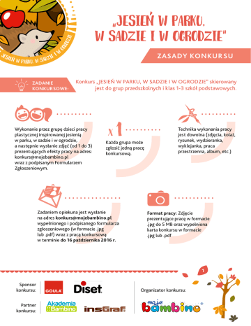 ZASADY KONKUR SU Zadanie konkursowe: Konkurs „JESIEŃ W PARKU, W SADZIE I W OGRODZIE” skierowany jest do grup przedszkolnych i klas 1-3 szkół podstawowych. Wykonanie przez grupę dzieci pracy plastycznej inspirowanej jesienią w parku, w sadzie i w ogrodzie, a następnie wysłanie zdjęć (od 1 do 3) prezentujących efekty pracy na adres: [email protected] wraz z podpisanym Formularzem Zgłoszeniowym. Każda grupa może zgłosić jedną pracę konkursową. Zadaniem opiekuna jest wysłanie na adres [email protected] wypełnionego i podpisanego formularza zgłoszeniowego (w formacie .jpg lub .pdf) wraz z pracą konkursową w terminie do 16 października 2016 r. Technika wykonania pracy jest dowolna (zdjęcia, kolaż, rysunek, wydzieranka, wyklejanka, praca przestrzenna, album, etc.) Format pracy: Zdjęcie prezentujące pracę w formacie .jpg do 5 MB oraz wypełniona karta konkursu w formacie .jpg lub .pdf 1 Sponsor konkursu: Partner konkursu: Organizator konkursu: ZASADY KONKUR SU 16 TERMINY ROZPOCZĘCIE KONKURSU 26 września 2016 r. TERMIN PRZYJMOWANIA PRAC CZAS NA GŁOSOWANIE OGŁOSZENIE WYNIKÓW 16 października 2016 r. 17–23 października 2016 r. 24 października 2016 r. Wybór Laureatów odbędzie się w II turach: 1) Kapituła Konkursu wybierze 30 najlepszych prac, które zostaną opublikowane na oficjalnym profilu Facebook Moje Bambino: https://www.facebook.com/MojeBambino i poddane głosowaniu Fanów. 2) Trzy prace w kategorii Przedszkole oraz trzy prace w kategorii Szkoła Podstawowa, które uzyskają największą liczbę polubień w czasie głosowania (od 17.10.2016 r. do 23.10.2016 r. godz. 23.59) zostaną nagrodzone w Konkursie. Nagrody zostaną dostarczone Laureatom do dnia 8 listopada 2016 r. Termin dostarczenia nagród będzie ustalany indywidualnie z każdym z Laureatów.NAJLEPSZE PRACE WYGRYWAJĄ! Podczas oceny Kapituła konkursu będzie brała pod uwagę: • oryginalność • pomysłowość • walory estetyczne • zgodność z tematem • zaangażowanie dzieci Kontakt: [email protected] 2 Sponsor konkursu: Partner konkursu: Organizator konkursu: