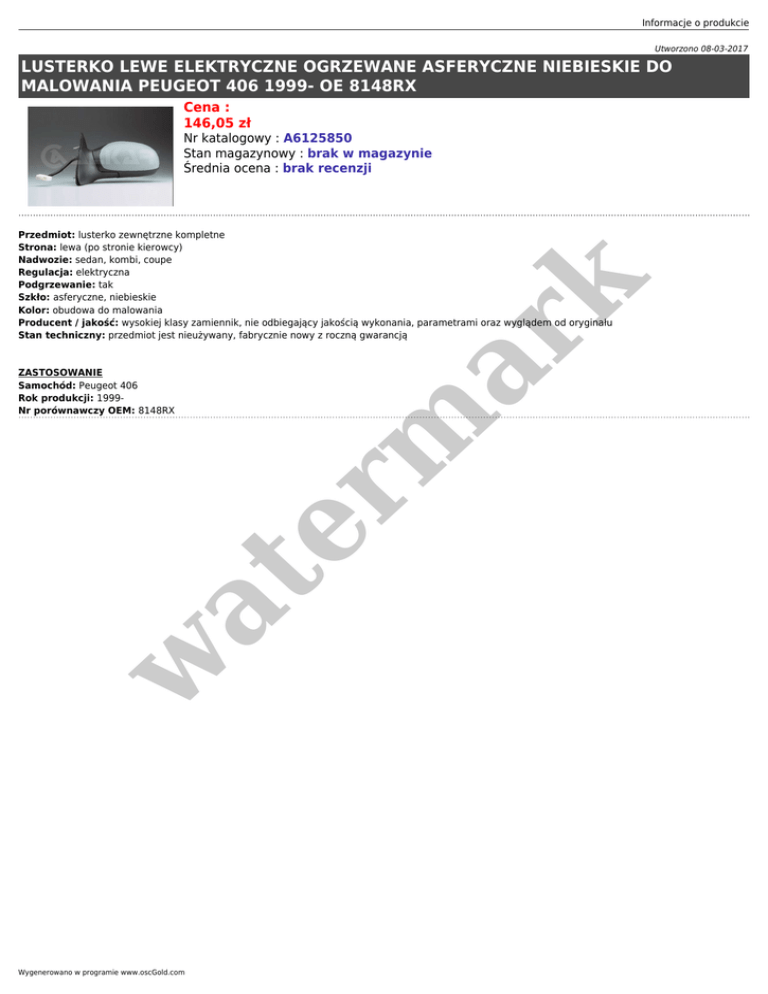 lusterko lewe mechaniczne asferyczne peugeot 406 1996
