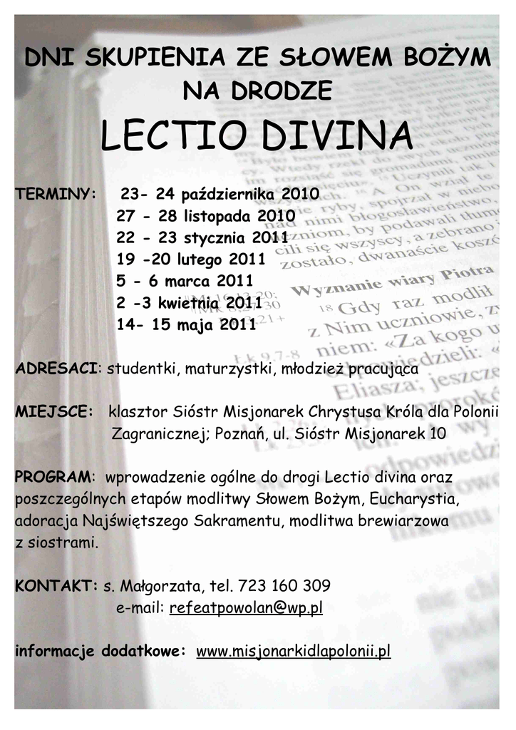 DNI SKUPIENIA ZE SŁOWEM BOŻYM NA DRODZE LECTIO DIVINA TERMINY: 23- 24 października 2010 27 - 28 listopada 2010 22 - 23 stycznia 2011 19 -20 lutego 2011 5 - 6 marca 2011 2 -3 kwietnia 2011 14- 15 maja 2011 ADRESACI: studentki, maturzystki, młodzież pracująca MIEJSCE: klasztor Sióstr Misjonarek Chrystusa Króla dla Polonii Zagranicznej; Poznań, ul. Sióstr Misjonarek 10 PROGRAM: wprowadzenie ogólne do drogi Lectio divina oraz poszczególnych etapów modlitwy Słowem Bożym, Eucharystia, adoracja Najświętszego Sakramentu, modlitwa brewiarzowa z siostrami. KONTAKT: s. Małgorzata, tel. 723 160 309 e-mail: [email protected] informacje dodatkowe: www.misjonarkidlapolonii.pl