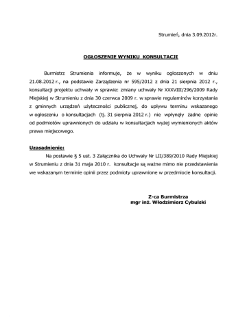 Strumień, dnia 3.09.2012r. OGŁOSZENIE WYNIKU KONSULTACJI Burmistrz Strumienia informuje, że w wyniku ogłoszonych w dniu 21.08.2012 r., na podstawie Zarządzenia nr 595/2012 z dnia 21 sierpnia 2012 r., konsultacji projektu uchwały w sprawie: zmiany uchwały Nr XXXVIII/296/2009 Rady Miejskiej w Strumieniu z dnia 30 czerwca 2009 r. w sprawie regulaminów korzystania z gminnych urządzeń użyteczności publicznej, do upływu terminu wskazanego w ogłoszeniu o konsultacjach (tj. 31 sierpnia 2012 r.) nie wpłynęły żadne opinie od podmiotów uprawnionych do udziału w konsultacjach wyżej wymienionych aktów prawa miejscowego. Uzasadnienie: Na postawie § 5 ust. 3 Załącznika do Uchwały Nr LII/389/2010 Rady Miejskiej w Strumieniu z dnia 31 maja 2010 r. konsultacje są ważne mimo nie przedstawienia we wskazanym terminie opinii przez podmioty uprawnione w przedmiocie konsultacji. Z-ca Burmistrza mgr inż. Włodzimierz Cybulski
