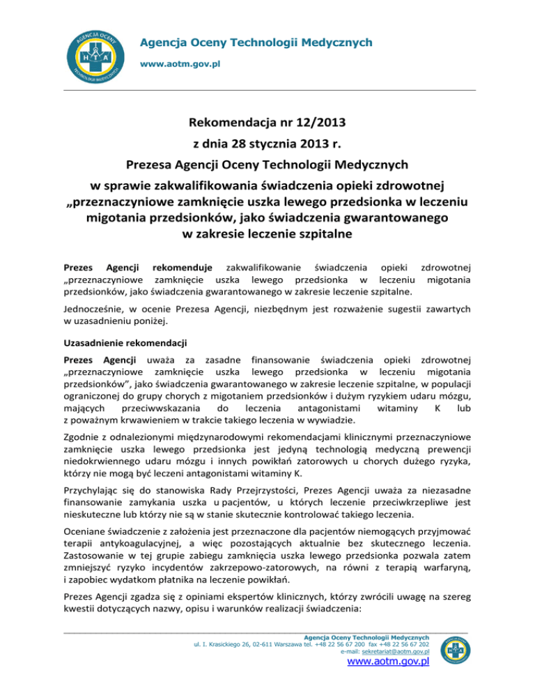 Agencja Oceny Technologii Medycznych www.aotm.gov.pl Rekomendacja nr 12/2013 z dnia 28 stycznia 2013 r. Prezesa Agencji Oceny Technologii Medycznych w sprawie zakwalifikowania świadczenia opieki zdrowotnej „przeznaczyniowe zamknięcie uszka lewego przedsionka w leczeniu migotania przedsionków, jako świadczenia gwarantowanego w zakresie leczenie szpitalne Prezes Agencji rekomenduje zakwalifikowanie świadczenia opieki zdrowotnej „przeznaczyniowe zamknięcie uszka lewego przedsionka w leczeniu migotania przedsionków, jako świadczenia gwarantowanego w zakresie leczenie szpitalne. Jednocześnie, w ocenie Prezesa Agencji, niezbędnym jest rozważenie sugestii zawartych w uzasadnieniu poniżej. Uzasadnienie rekomendacji Prezes Agencji uważa za zasadne finansowanie świadczenia opieki zdrowotnej „przeznaczyniowe zamknięcie uszka lewego przedsionka w leczeniu migotania przedsionków”, jako świadczenia gwarantowanego w zakresie leczenie szpitalne, w populacji ograniczonej do grupy chorych z migotaniem przedsionków i dużym ryzykiem udaru mózgu, mających przeciwwskazania do leczenia antagonistami witaminy K lub z poważnym krwawieniem w trakcie takiego leczenia w wywiadzie. Zgodnie z odnalezionymi międzynarodowymi rekomendacjami klinicznymi przeznaczyniowe zamknięcie uszka lewego przedsionka jest jedyną technologią medyczną prewencji niedokrwiennego udaru mózgu i innych powikłań zatorowych u chorych dużego ryzyka, którzy nie mogą być leczeni antagonistami witaminy K. Przychylając się do stanowiska Rady Przejrzystości, Prezes Agencji uważa za niezasadne finansowanie zamykania uszka u pacjentów, u których leczenie przeciwkrzepliwe jest nieskuteczne lub którzy nie są w stanie skutecznie kontrolować takiego leczenia. Oceniane świadczenie z założenia jest przeznaczone dla pacjentów niemogących przyjmować terapii antykoagulacyjnej, a więc pozostających aktualnie bez skutecznego leczenia. Zastosowanie w tej grupie zabiegu zamknięcia uszka lewego przedsionka pozwala zatem zmniejszyć ryzyko incydentów zakrzepowo-zatorowych, na równi z terapią warfaryną, i zapobiec wydatkom płatnika na leczenie powikłań. Prezes Agencji zgadza się z opiniami ekspertów klinicznych, którzy zwrócili uwagę na szereg kwestii dotyczących nazwy, opisu i warunków realizacji świadczenia: ___________________________________________________________________________ Agencja Oceny Technologii Medycznych ul. I. Krasickiego 26, 02-611 Warszawa tel. +48 22 56 67 200 fax +48 22 56 67 202 e-mail: [email protected] www.aotm.gov.pl Rekomendacja nr 12/2013 Prezesa AOTM z dnia 28 stycznia 2013 r. - właściwsze niż „przeznaczyniowe” wydaje się użycie nazwy „przezcewnikowe” lub „przezskórne”, zgodnie z klasyfikacją procedur ICD-9; - celem zabiegu nie jest leczenie migotania przedsionków, lecz prewencja epizodów zatorowo-zakrzepowych, co powinno być uwzględnione w nazwie świadczenia; - oprócz wskazania w karcie problemu zdrowotnego sytuacji klinicznych, kiedy wskazane jest zastosowanie zabiegu przezskórnego zamknięcia uszka lewego przedsionka, eksperci sugerują doprecyzowanie, iż chodzi o pacjentów z grupy wysokiego ryzyka udarów (CHADS, CHADS2, CHADS-Vasc ≥1) oraz krwawień (skala HESbled); jeden z ekspertów proponuje nawet stosowanie kwestionariusza bezwzględnych wskazań do wykonania zabiegu. - system PLAATO został wycofany z rynku i nie powinien znaleźć się w opisie świadczenia; nie uwzględniono za to innych systemów (WATCHMAN, ACP, LARIAT), które są obecnie dostępne i posiadają oznakowanie CE; - procedura powinna znajdować się zarówno w katalogu kardiologicznym, jak i kardiochirurgicznym, gdyż obie te dziedziny zajmują się inwazyjnym leczeniem pacjentów z migotaniem przedsionków. Prezes Agencji, przychylając się do stanowiska Rady Przejrzystości, uważa za wskazane stworzenie prospektywnego rejestru chorych leczonych tą technologią, co pozostaje w zgodzie z sugestią ekspertów odnośnie powołania komisji, która poprzez rejestr wykonanych zabiegów będzie miała wpływ na wydatkowanie środków publicznych. Przeznaczyniowe zamknięcie uszka lewego przedsionka w leczeniu migotania przedsionków jest technologią rekomendowaną m.in. przez European Society of Cardiology (ESC) i National Institute for Health and Clinical Excellence (NICE) i szeroko stosowaną na świecie. Z uwagi na duże koszty leczenia udaru mózgu interwencja wydaje się być efektywna kosztowo. Jednak, zdaniem Prezesa Agencji, niezbędne jest ponowne, szczegółowe przeanalizowanie wyceny punktowej ocenianej procedury w porównaniu z wyceną punktową innych procedur z zakresu kardiologii interwencyjnej. Przedmiot wniosku Wniosek Ministra Zdrowia (MZ) dotyczy przygotowania rekomendacji dla świadczenia opieki zdrowotnej „przeznaczyniowe zamknięcie uszka lewego przedsionka w leczeniu migotania przedsionków” w sprawie jego zakwalifikowania, jako świadczenia gwarantowanego w zakresie leczenie szpitalne. Charakterystyka wnioskowanego świadczenia została przedłożona przez MZ, w załączeniu do pisma zlecającego i prowadzona odnosi się do techniki PLAAO (percutaneous left atrial appendage occlusion), która służy zamykaniu światła uszka lewego przedsionka za pomocą urządzenia implantowanego poprzez cewnik wprowadzony przez żyłę udową, prawy przedsionek i przegrodę międzyprzedsionkową do lewego przedsionka. Problem zdrowotny Migotanie przedsionków (łac. fibrillatio atriorum; ang. atrial fibrillation, AF) jest najczęstszą tachyarytmią nadkomorową, którą cechuje szybki (350-700/min.), nieuporządkowany rytm przedsionków, prowadzący do utraty efektywności hemodynamicznej ich skurczu, czemu towarzyszy niemiarowy rytm komór. Zgodnie z Międzynarodową Klasyfikacją Chorób ICD-10 i Procedur ICD-9 identyfikacja świadczenia następuje poprzez procedurę medyczną: 37.4901 Przezskórne zamknięcie uszka przedsionka (w ramach: 37.4