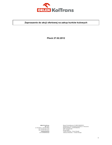 Zaproszenie do akcji ofertowej na zakup kurków kulowych Płock 27.02.2012 ORLEN KolTrans Sp. z o.o. ul. Chemików 7, 09-411 Płock tel. (+48 24) 365 31 75 fax (+48 24) 365 40 09 [email protected] www.orlenkoltrans.pl Rejestr Przedsiębiorców Nr KRS 0000028251 Sąd Rejonowy XIV Wydział Gospodarczy w Warszawie Kapitał zakładowy: 40.859.000,00 zł NIP: 774-26-58-299 Zarząd Spółki: Tomasz Szurnicki – Prezes Zarządu Andrzej Łobodziński – Członek Zarządu 1 I. Zamawiający : ORLEN KolTrans Sp. z o.o. 09-411 Płock, Ul. Chemików 7 NIP: 774-26-58-299 http://www.orlenkoltrans.pl, e-mail: [email protected], tel. 24 365 39 11, fax. 24 365 40 09 II. Informacje o akcji ofertowej: Postępowanie prowadzone jest według wewnętrznych procedur obowiązujących w ORLEN KolTrans Sp. z o.o. III. Opis przedmiotu zamówienia - specyfikacja szczegółowa Przedmiotem zapytania jest powtarzająca się w okresie 2012 roku dostawa kurków kulowych w/g zapotrzebowania. L.P. 1 2 3 Przedmiot zakupu Kurek kulowy kołnierzowy DN80 − medium - propan butan ,Izobutan1,izobuten,butadien,propen,mieszanina A,A0,A1,B,C, − ciśnienie – minimum 2,8 Mpa. − średnica – DN 80 − uszczelnienie kuli – PTFE − uszczelnienie trzpienia – PTFE sznur PTFE − trzpień , kula - kwasoodporna − korpus -stal węglowa 1.0038 − materiał kuli i trzpienia 1.4301 − temp. max. 150 C − kołnierz przyłączeniowy z rowkiem Kurek kulowy kołnierzowy DN50 − medium - propan butan ,Izobutan1,izobuten,butadien,propen,mieszanina A,A0,A1,B,C, − ciśnienie – minimum 2,8 Mpa. − średnica – DN 50 − uszczelnienie kuli – PTFE − uszczelnienie trzpienia – PTFE sznur PTFE − trzpień , kula - kwasoodporna − korpus -stal węglowa 1.0038 − materiał kuli i trzpienia 1.4301 − temp. max. 150 C − kołnierz przyłączeniowy z rowkiem Kurek kulowy kołnierzowy DN100 − medium -produkty ropopochodne − ciśnienie – PN10 − średnica – DN 100 − uszczelnienie kuli – PTFE − uszczelnienie trzpienia – PTFE − trzpień , kula - kwasoodporna − korpus -3.1325 (PA6 -- aluminium) − materiał kuli i trzpienia 1.4301 − temp. max. 100 C − gwint M130x6 Ilość 200 szt. 200 szt. 10 szt. 2 Ogólne warunki realizacji zakupu: • • • • ORLEN KolTrans Sp. z o. o. dopuszcza możliwość składania ofert częściowych. W przypadku gdy złożona oferta nie spełnienia wymogów zawartych w zapytaniu – zostanie odrzucona. Producent zaworów powinien posiadać deklarację zgodności zgodnie z dyrektywą 2010/35/UE (oznakowanie PI kategoria 3) oraz zgodnie z dyrektywą 97/23/WE kategoria IV CE. Dostawy kurków kulowych następować będą sukcesywnie w miarę pojawiających się potrzeb, na podstawie oddzielnych zleceń zamawiającego. IV. Kryteria wyboru ofert. • • • Cena netto za szt. wraz z dostawą do magazynu w Płocku Referencje Gwarancja V. Treść składanych ofert i wymagane dokumenty. Warunkiem przyjęcia oferty jest przedłożenie wraz z ofertą niżej wymienionych danych i dokumentów: 1. Nazwa firmy, adres, telefon kontaktowy, fax. 2. Nazwiska osób reprezentujących firmę. Odpis z Krajowego Rejestru Sądowego, w przypadku spółek Prawa Handlowego, lub zaświadczenie o wpisie do ewidencji działalności gospodarczej w przypadku osób fizycznych. 3. Decyzja w sprawie nadania Nr Identyfikacji Podatkowej NIP. VI. Oferta winna zawierać. Część techniczna. • • • • Dokumenty potwierdzające wiarygodność oferenta wskazane w pkt. V. Wskazanie osoby sprawującej nadzór nad realizacją przedsięwzięcia. Termin ważności oferty. Oświadczenie oferenta zał. nr 1. Część cenowa. • • Cena jednostkowa netto. Sposób płatności – sugerowany min. 30 dni Pytania dodatkowe dotyczące zakresu ogłoszonej akcji ofertowej prosimy przesyłać na adres e-mail: • • [email protected] [email protected] Odpowiedź będzie przekazywana tą samą droga. 3 VII. Sposób złożenia oferty Oferta powinna być podpisana przez osoby uprawnione do reprezentowania firmy i składać się z dwóch części – technicznej i cenowej. Ofertę należy przedłożyć w opisanej i zamkniętej kopercie w terminie do dnia 12-032012 roku do godz. 15.00 w sekretariacie Prezesa Zarządu ORLEN KolTrans Sp. z o.o., ul. Chemików 7, 09-411 Płock. Na kopercie należy podać nazwę, dokładny adres Oferenta oraz tytuł zaproszenia do składania ofert z dopiskiem „akcja ofertowa na kurki kulowe ” VIII. Zastrzeżenia zapraszającego do składania ofert. ORLEN KolTrans Sp. z o.o. zastrzega sobie prawo do: 1. Wyboru oferenta wg przedstawionych kryteriów oceny. 2. Możliwość odstąpienia od procedury wyboru oferty bez podania przyczyn, 3. Zmiany ilości zamówienia. 4. Dokonania korekt i uściśleń zakresu w trakcie analizy ofert, proszenia o ewentualną jego aktualizację. 5. Przeprowadzenie dodatkowych negocjacji cen. IX. Ponadto informuję się, że oferentowi nie przysługują żadne roszczenia z tytułu odrzucenia jego oferty lub nie wybrania oferty, oraz że nie przewiduje się trybu odwoławczego od dokonanego wyboru oferenta. Oferent ponosi wszystkie koszty związane z przygotowaniem i złożeniem oferty i nie przysługuje mu prawo do zwrotu tych kosztów. X. ORLEN KolTrans Sp. z o.o. zastrzega sobie prawo do dowolnego wyboru podmiotu/podmiotów, z którymi będą prowadzone negocjacje w odniesieniu do części lub całości zakresu złożonych odpowiedzi oraz do zawarcia umowy z więcej niż jednym Dostawcą wyłonionym w drodze negocjacji, przy czym zakres umowy może obejmować całość lub część zakresu złożonej odpowiedzi na zapytanie ofertowe. Z poważaniem Przewodniczący Zespołu Oceniającego Tomasz Maliszewski 4 Załącznik 1 Oświadczenie Oferenta Dotyczy postępowania o udzielenie zamówienia na n/w kurki kulowe: ……………..……………………………………………………………………………. Oświadczam, że reprezentowana przeze mnie FIRMA: a) Jes