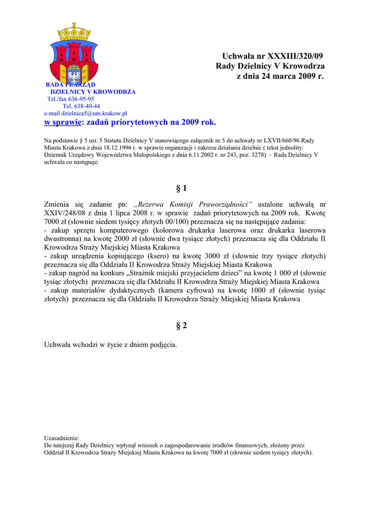 Uchwała nr XXXIII/320/09 Rady Dzielnicy V Krowodrza z dnia 24 marca 2009 r. RADA I ZARZĄD DZIELNICY V KROWODRZA Tel./fax 636-95-95 Tel. 638-40-44 e-mail [email protected] w sprawie: zadań priorytetowych na 2009 rok. Na podstawie § 5 ust. 5 Statutu Dzielnicy V stanowiącego załącznik nr 5 do uchwały nr LXVII/660/96 Rady Miasta Krakowa z dnia 18.12.1996 r. w sprawie organizacji i zakresu działania dzielnic ( tekst jednolity: Dziennik Urzędowy Województwa Małopolskiego z dnia 6.11.2002 r. nr 243, poz. 3278) – Rada Dzielnicy V uchwala co następuje: §1 Zmienia się zadanie pn: „Rezerwa Komisji Praworządności” ustalone uchwałą nr XXIV/248/08 z dnia 1 lipca 2008 r. w sprawie zadań priorytetowych na 2009 rok. Kwotę 7000 zł (słownie siedem tysięcy złotych 00/100) przeznacza się na następujące zadania: - zakup sprzętu komputerowego (kolorowa drukarka laserowa oraz drukarka laserowa dwustronna) na kwotę 2000 zł (słownie dwa tysiące złotych) przeznacza się dla Oddziału II Krowodrza Straży Miejskiej Miasta Krakowa - zakup urządzenia kopiującego (ksero) na kwotę 3000 zł (słownie trzy tysiące złotych) przeznacza się dla Oddziału II Krowodrza Straży Miejskiej Miasta Krakowa - zakup nagród na konkurs „Strażnik miejski przyjacielem dzieci” na kwotę 1 000 zł (słownie tysiąc złotych) przeznacza się dla Oddziału II Krowodrza Straży Miejskiej Miasta Krakowa - zakup materiałów dydaktycznych (kamera cyfrowa) na kwotę 1000 zł (słownie tysiąc złotych) przeznacza się dla Oddziału II Krowodrza Straży Miejskiej Miasta Krakowa §2 Uchwała wchodzi w życie z dniem podjęcia. Uzasadnienie: Do tutejszej Rady Dzielnicy wpłynął wniosek o zagospodarowanie środków finansowych, złożony przez Oddział II Krowodrza Straży Miejskiej Miasta Krakowa na kwotę 7000 zł (słownie siedem tysięcy złotych).