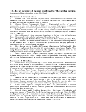 The list of submitted papers qualified for the poster session (recommended dimensions of the poster: 80x100cm): Poster session 1- Forest site science 1. Błońska Ewa, Lasota Jarosław, Zwydak Maciej –Soil enzyme activity of diversified mountain forest sites developed on gneiss; Aktywność enzymatyczna gleb zróżnicowanych górskich siedlisk leśnych wykształconych na gnejsach 2. Chodak Marcin, Pietrzykowski Marcin – Physiological profiles of bacterial communities in mine soils afforested with different tree species; Fizjologiczne profile flory bakteryjnej w glebach industrioziemnych zalesionych różnymi gatunkami drzew 3. Lasota Jarosław, Błońska Ewa, Zwydak Maciej, Pacanowski Piotr –Eutrophic soils of fir stands in the Beskid Niski and Sądecki; Gleby eutroficznych lasów jodłowych w Beskidzie Niskim i Sądeckim 4. Małobęcki Andrzej –Observations on the anthesis of the bog violet, Viola uliginosa Bess.; Obserwacje kwitnienia fiołka bagiennego Viola uliginosa. Bess. 5. Mazurek Ryszard, Zadrożny Paweł, Zaleski Tomasz, Wanic Tomasz, Bilański Piotr, Wilczyński Sławomir – Geotechnical transformations of soil cover versus withering of trees in the People’s Park in Bytom; Geotechniczne przekształcenia pokrywy glebowej a zamieranie drzew w Parku Ludowym w Bytomiu 6. Pietrzykowski Marcin, Krzaklewski Wojciech, Likus Justyna, Woś Bartłomiej – The assessment of english oak (Quercus robur L.) growth response on reclaimed Sulphur Mine dump Piaseczno; Ocena reakcji wzrostowej dębu szypułkowego (Quercus robur L.) na zrekultywowanym zwałowisku Kopalni Siarki Piaseczno 7. Wanic Tomasz, Piątek Grzegorz, Małobęcki Andrzej – Locality of Daphne cneorum L. in the area of the active military training ground in Nowa Dęba; Stanowisko wawrzynka główkowego Daphne cneorum L. na terenie czynnego poligonu wojskowego w Nowej Dębie Poster session 2 - Silviculture 1. Banach Jacek, Skrzyszewska Kinga, Kubacki Kamil, Bućko Paweł – Heritability and stability of spring flushing of European beech (Fagus sylvatica L.) originating from southeastern part of Poland; Odziedziczalność i stabilność pędzenia wiosennego buka zwyczajnego (Fagus sylvatica L.) pochodzącego z południowo-wschodniego obszaru Polski 2. Banach Jacek, Wanic Tomasz – Evaluation of an effect of Norway spruce (Picea abies (L.) Karst.) mycorrhization after 6 years of growth on an experimental plot; Ocena wpływu mikoryzacji sadzonek świerka pospolitego (Picea abies (L).)H.Karst.) po 6 latach wzrostu na uprawie 3. Bodziarczyk Jan, Widlak Marcin –Population structure and health status of individuals in reintroduced common yew Taxus baccata L. site in the middle part of the Polish Carpathians; Struktura populacji cisa pospolitego Taxus baccata L. oraz stan zdrowotny osobników na reintrodukowanym stanowisku w środkowej części polskich Karpat 4. Kempf Marta, Gorywoda Katarzyna, Hebda Anna – The genetic structure of different phenological provenances of beech; Struktura genetyczna zróżnicowanych fenologicznie proweniencji buka zwyczajnego 5. Kroczek Marek, Małek Stanisław, Barszcz Józef –The impact of fertilisation and preparation manner of Picea abies (L.) H.Karst), Fagus sylvatica L. and Abies alba Mill. seedlings on their growth on plantations in spruce stands threatened by decomposition in the Beskid Śląski and Żywiecki; Wpływ nawożenia i sposobu przygotowania sadzonek Picea abies (L.) H.Karst), Fagus sylvatica L. i Abies alba Mill. na ich wzrost w uprawach w świerczynach zagrożonych rozpadem w Beskidzie Śląskim i Żywieckim 6. Krzysztof Roman, Klekot Anna, Skrzyszewski Jerzy – Związek cech drzewostanu z pokryciem przez nalot jodły pospolitej w Nadleśnictwie Limanowa; The relationship between stand features and coverage of young fir regeneration in the Limanowa Forest District 7. Masternak Katarzyna – The variability in growth of Norway spruces (Picea abies L. Karst) provenances tested in IPTNS-IUFRO 1964/68 experiment in Krynica; Zmienność cech wzrostowych proweniencji świerka pospolitego (Picea abies L. Karst) objętych doświadczeniem IPTNS-IUFRO w Krynicy 8. Młynarczyk Aleksandra – Growth of spruce from Istebna on family conservation plantation in Wisła Forest District; Analiza fenologiczna rozwoju wiosennego buka zwyczajnego (Fagus sylvatica L.) na powierzchni badawczej Karpackiego Banku Genów w Nadleśnictwie Wisła 9. Młynarczyk Aleksandra, Haratyk Andrzej, Banach Jacek –The growth of the Istebna spruce on the progeny plantation in the Wisła Forest District; Wzrost świerka istebniańskiego na rodowej uprawie zachowawczej w Nadleśnictwie Wisła 10. Rebeznyuk Ihor, Kyy Volodymyr, Mahura Bohdan, Kyy Andriy, Tsymbaliuk Yurij – Development of local standing deadwood on the slopes of the Carpathian Mountains; Rozwój lokalnego drewna posuszowego pozostawionego w drzewostanie na stokach Karpat 11. Skrzyszewski Jerzy, Skrzyszewska Kinga, Pach Maciej, Banach Jacek – Incremental evaluation of silver fir in mother stands whose progeny has a diverse silvicultural value on the trial plantation JD PL 86/90; Ocena przyrostowa jodły w drzewostanach matecznych, której potomstwo wykazuje zróżnicowaną wartość hodowlaną na uprawach doświadczenia JD PL 86/90 12. Szostak Marta, Wężyk Piotr, Hawryło Paweł, Nowicka Marta – The monitoring of the forest succession on the Błędów Desert (southern Poland) based on analyses on multitemporal satellite images and aerial orthophotomaps; Monitorowanie procesu wtórnej sukcesji leśnej na obszarze Pustyni Błędowskiej w oparciu o analizy wieloczasowych zobrazowań satelitarnych oraz ortofotomap lotniczych 13. Szostak Marta, Wężyk Piotr, Pająk Marek, Hawryło Paweł, Lisańczuk Marek – Monitoring of the forest establishment process on the spoil heap of “Fryderyk” mine in Tarnowskie Góry based on aerial orthophotomaps and ALS data from ISOK project; Monitorowanie procesu lasotwórczego na zwałowisku kopalni